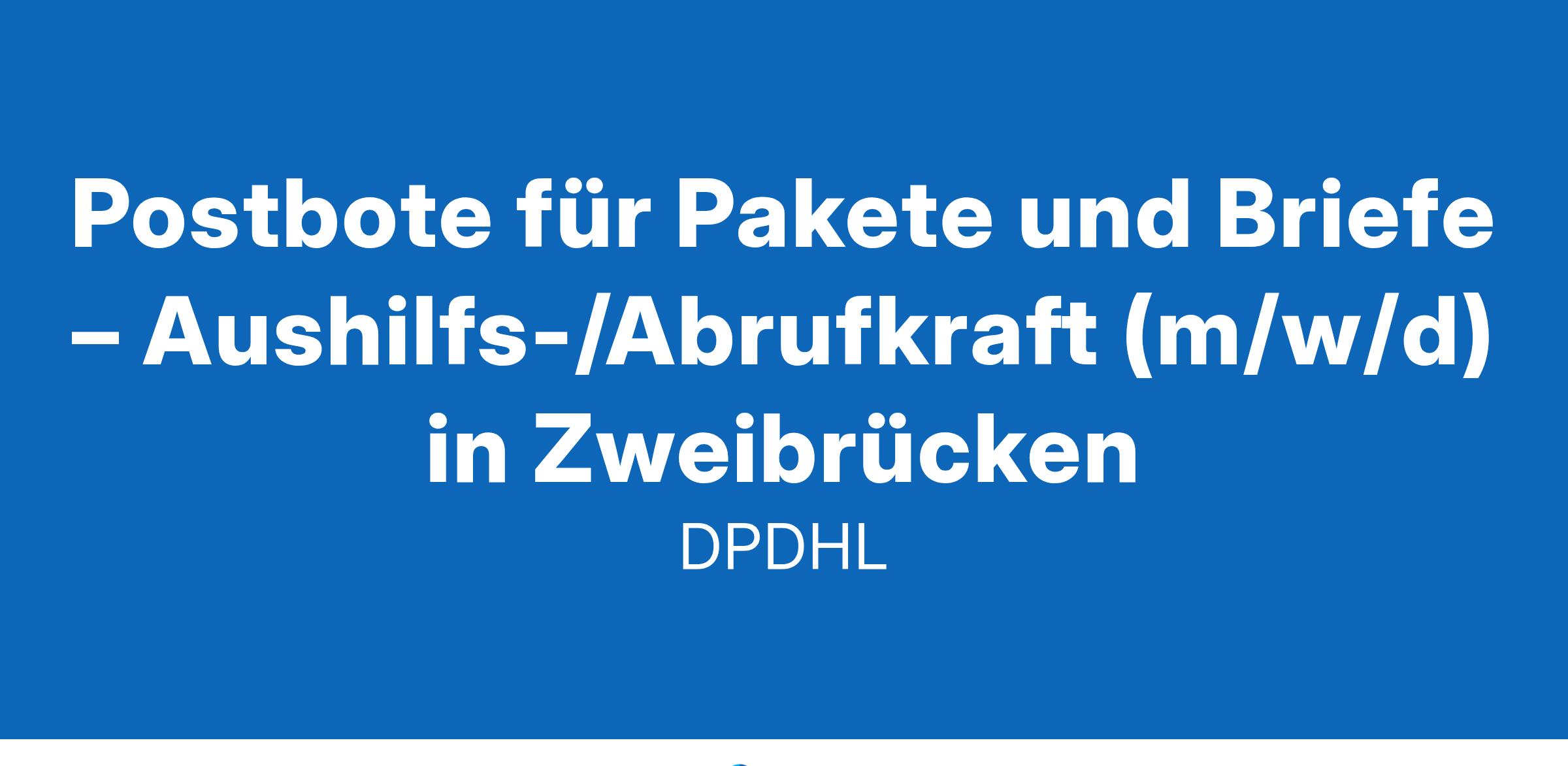 Werde Aushilfe / Minijobber als Postbote für Pakete und Briefe in ZweibrückenAls Aushilfe / Minijobber bist du an einzelnen Tagen oder auch stundenweise für uns tätig. Nach einer bezahlten Einarbeitung kannst du sofort in deinem neuen Nebenjob starten.Was wir bieten16,92 € Tarif-Stundenlohn + ggf. regionale ArbeitsmarktzulageDu kannst sofort starten – Aushilfe / Minijob / StudentenjobFlexible Arbeitszeiten an vereinbarten ArbeitstagenKostenlose Bereitstellung von hochwertiger ArbeitskleidungAusführliche Einweisung (bezahlt) – wir machen dich fit für unser TeamEin krisensicherer Arbeitsplatz, garantierte Gehaltssteigerung gemäß Tarifvertrag und pünktliche GehaltszahlungenDeine Aufgaben bei unsZustellung von Brief- und Paketsendungen mit zur Verfügung gestellten HilfsmittelnSortierung von Paketen auf ZustellgebieteAuslieferung an bestimmten Tagen (zwischen Montag und Samstag)Sendungen im Durchschnitt unter 10 kgZustellung mit unseren Geschäftsfahrzeugen, bspw. vollelektrische FahrzeugeWas du als Aushilfe / Minijobber bietestDu darfst einen Pkw fahren (für die Zustellung)Du kannst dich auf Deutsch unterhaltenDu bist wetterfest und kannst gut anpackenDu bist zuverlässig und hängst dich reinAushilfe / Minijob bei Deutsche Post DHLAls Postbote bringst du den Menschen in deinem Bezirk Post- und Paketsendungen. Dabei lässt du dir von keinem Wetter die Laune verderben. Auch Quereinsteiger oder Studenten sind bei uns herzlich willkommen, denn du zählst, wie du bist!Wir freuen uns auf deine Bewerbung, am besten online! Klicke dazu einfach auf den 'Bewerben'-Button – auch ganz ohne Lebenslauf.MENSCHEN VERBINDEN, LEBEN VERBESSERN#werdeeinervonuns