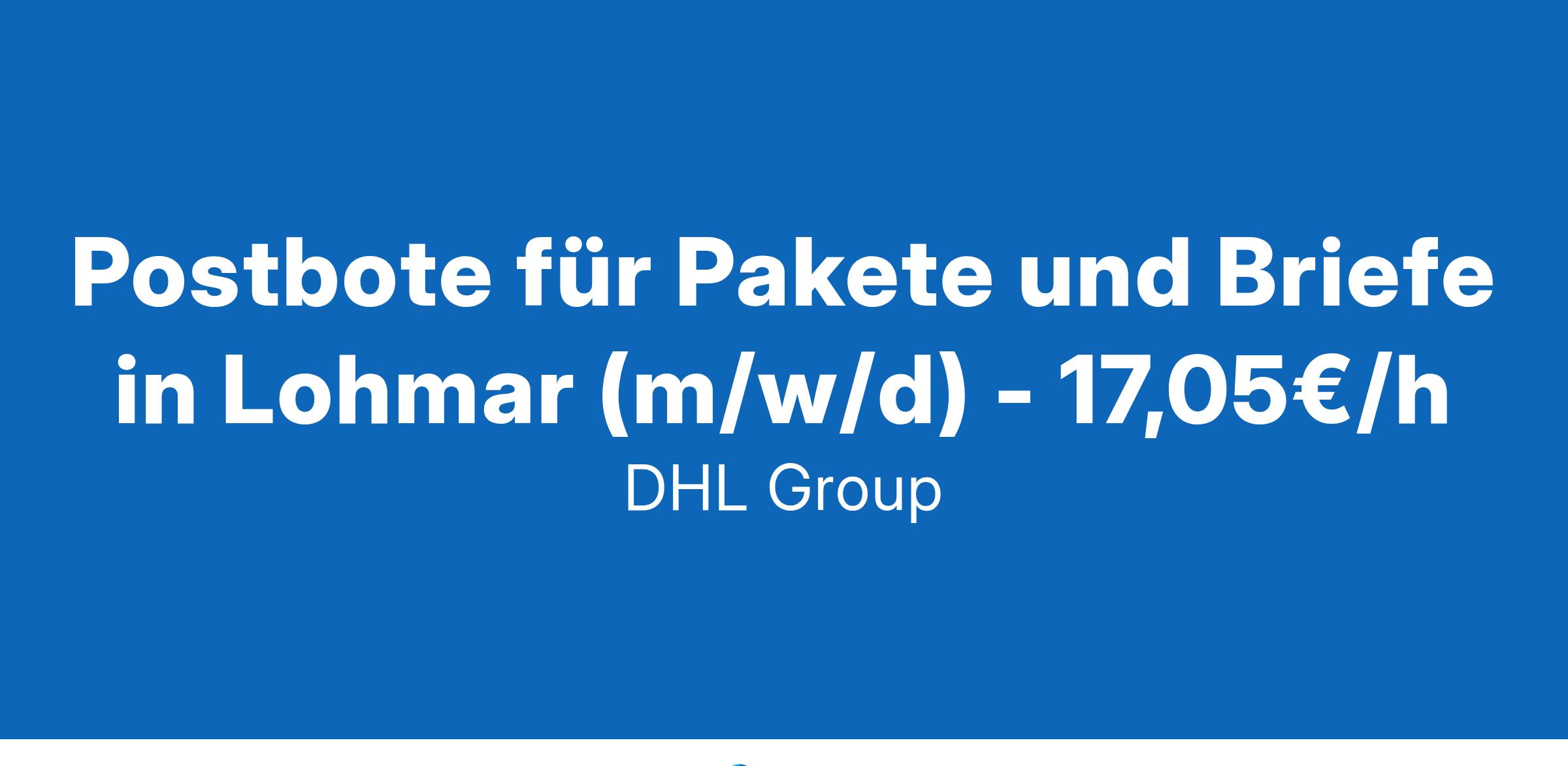 Postbote für Pakete und Briefe in Lohmar (m/w/d) - 17,05€/h Werde Postbote für Pakete und Briefe in Lohmar Was wir bieten 17,05 € Tarif-Stundenlohn inkl. 50% Weihnachtsgeld, ggf. regionale Arbeitsmarktzulage Weitere 50% Weihnachtsgeld im November Bis zu 332 € Urlaubsgeld Du kannst sofort befristet in Vollzeit starten, 38,5 Stunden/Woche Möglichkeit der Auszahlung von Überstunden Ein krisensicherer Arbeitsplatz, garantierte Gehaltssteigerung gemäß Tarifvertrag und pünktliche Gehaltszahlungen Kostenlose Bereitstellung von hochwertiger Arbeitskleidung Ausführliche Einweisung (bezahlt) – wir machen dich fit für die Zustellung Unbefristete Übernahme und Entwicklungsmöglichkeiten (bspw. Standortleiter) bei guten Leistungen und offenen Positionen möglich Attraktive Mitarbeiterangebote wie z.B. arbeitgeberfinanzierte betriebliche Altersvorsorge, Fahrradleasing, Rabatte bei Mobilfunkanbietern, etc. Deine Aufgaben als Postbote bei uns Zustellung von Brief- und Paketsendungen mit zur Verfügung gestellten Hilfsmitteln Auslieferung an 5 Werktagen (zwischen Montag und Samstag) Sendungen im Durchschnitt unter 10 kg Zustellung mit unseren Geschäftsfahrzeugen, bspw. vollelektrische Fahrzeuge Was du als Zusteller bietest Du darfst einen Pkw fahren Du kannst dich auf Deutsch unterhalten Du bist wetterfest und kannst gut anpacken Du bist zuverlässig und hängst dich rein Werde Postbote bei Deutsche Post DHL Als Postbote bringst du den Menschen in deinem Bezirk Post- und Paketsendungen. Dabei lässt du dir von keinem Wetter die Laune verderben und bist fünf Werktage pro Woche (zwischen Montag und Samstag) unterwegs. Auch Quereinsteiger oder Studenten sind bei uns herzlich willkommen, denn du zählst, wie du bist! Wir freuen uns auf deine Bewerbung als Fahrer , am besten online! Klicke dazu einfach auf den 'Bewerben'-Button – auch ganz ohne Lebenslauf. MENSCHEN VERBINDEN, LEBEN VERBESSERN #werdeeinervonuns