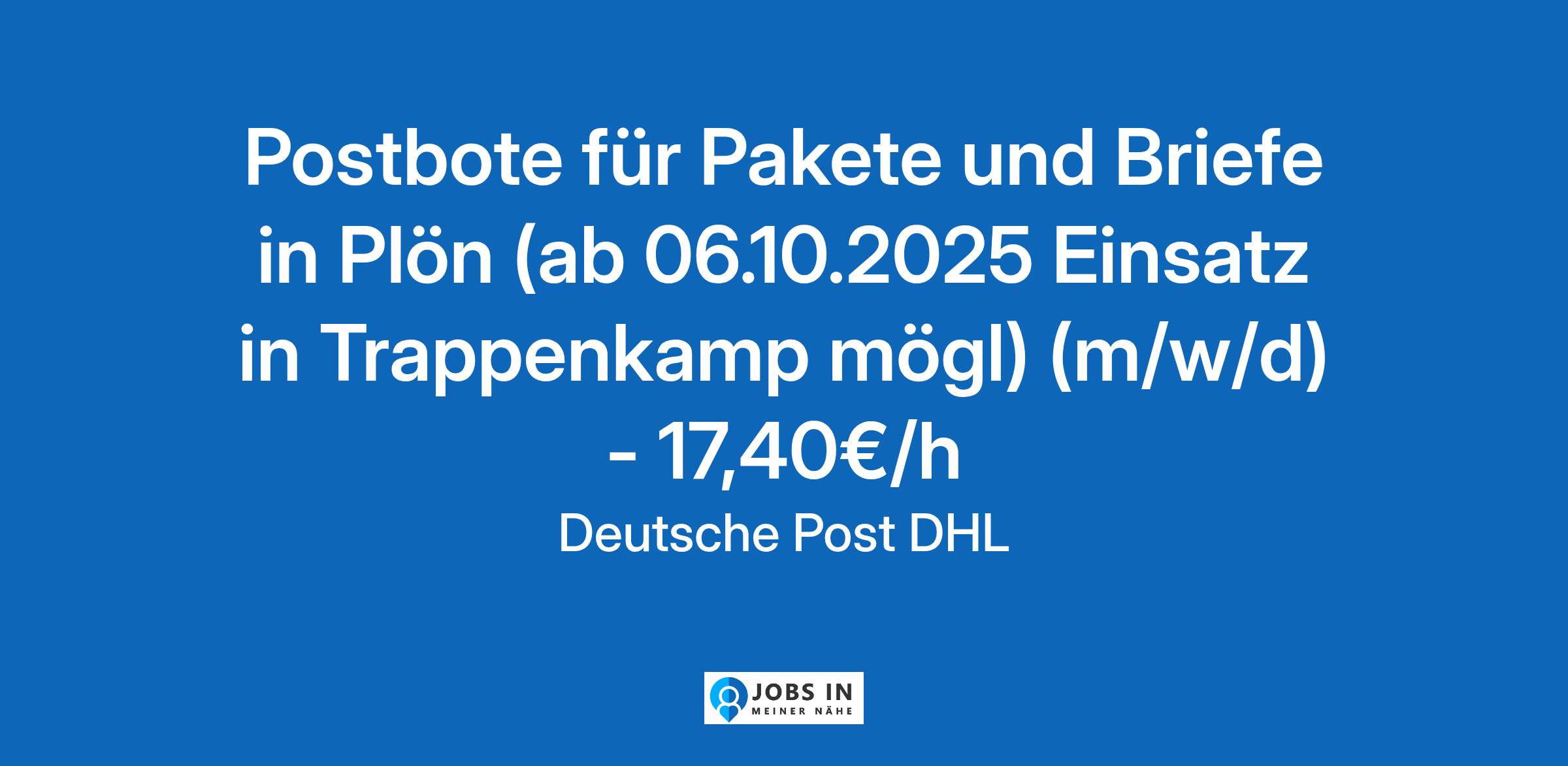 Postbote für Pakete und Briefe in Plön (ab 06.10.2025 Einsatz in Trappenkamp mögl) (m/w/d) - 17,40€/h Werde Postbote für Briefe und Pakete in Plön (ab 06.10.2025 voraussichtlich in Trappenkamp) Deine Aufgaben als Postbote bei uns