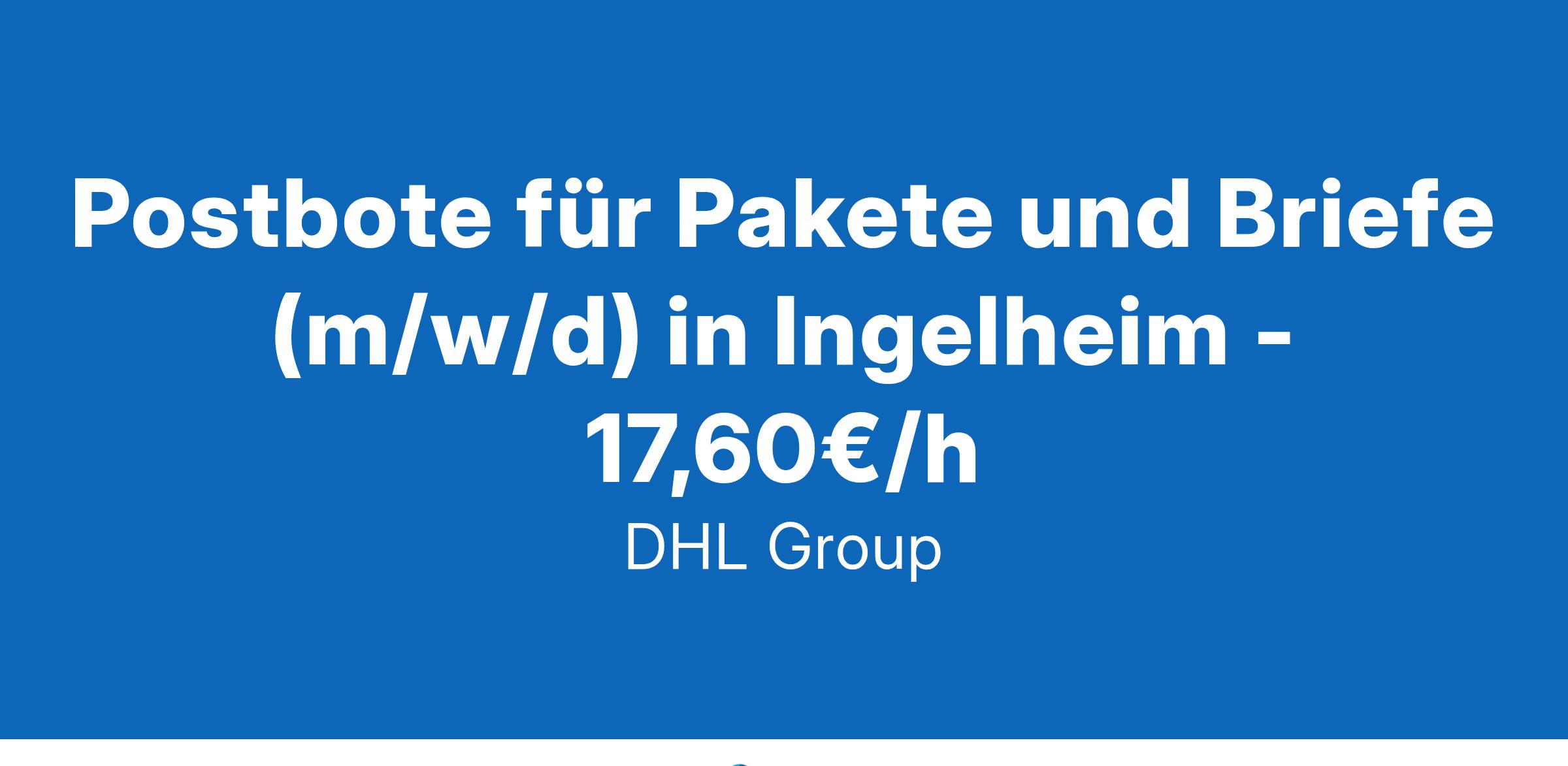 Postbote für Pakete und Briefe (m/w/d) in Ingelheim - 17,60€/h Werde Postbote für Pakete und Briefe in Ingelheim Was wir bieten 17,60 € inkl. 50% Weihnachtsgeld Weitere 50% Weihnachtsgeld im November Bis zu 332 € Urlaubsgeld Du kannst sofort in Vollzeit starten, 38,5 Stunden/Woche Möglichkeit der Auszahlung von Überstunden Ein krisensicherer Arbeitsplatz, garantierte Gehaltssteigerung gemäß Tarifvertrag und pünktliche Gehaltszahlungen Kostenlose Bereitstellung von hochwertiger Arbeitskleidung Ausführliche Einweisung (bezahlt)– wir machen dich fit für die Zustellung Unbefristete Übernahme und Entwicklungsmöglichkeiten (bspw. Standortleiter) bei guten Leistungen und offenen Positionen möglich Attraktive Mitarbeiterangebote wie z.B. arbeitgeberfinanzierte betriebliche Altersvorsorge, Fahrradleasing, Rabatte bei Mobilfunkanbietern, etc. Deine Aufgaben als Postbote bei uns Zustellung von Brief- und Paketsendungen mit zur Verfügung gestellten Hilfsmitteln Auslieferung an 5 Werktagen (zwischen Montag und Samstag) Sendungen im Durchschnitt unter 10 kg Zustellung mit unseren Geschäftsfahrzeugen, bspw. vollelektrische Fahrzeuge Was du als Zusteller bietest Du darfst einen Pkw fahren Du kannst dich auf Deutsch unterhalten Du bist wetterfest und kannst gut anpacken Du bist zuverlässig und hängst dich rein Werde Postbote bei Deutsche Post DHL Als Postbote bringst du den Menschen in deinem Bezirk Post- und Paketsendungen. Dabei lässt du dir von keinem Wetter die Laune verderben und bist fünf Werktage pro Woche (zwischen Montag und Samstag) unterwegs. Auch Quereinsteiger oder Studenten sind bei uns herzlich willkommen, denn du zählst, wie du bist! Wir freuen uns auf deine Bewerbung als Fahrer , am besten online!Klicke dazu einfach auf den 'Bewerben'-Button – auch ganz ohne Lebenslauf. MENSCHEN VERBINDEN, LEBEN VERBESSERN #werdeeinervonuns