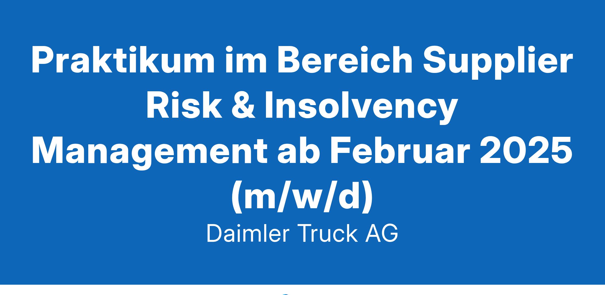 Über uns Bei Daimler Truck verändern wir das heutige Transportwesen. Wir übernehmen weltweit Verantwortung und arbeiten gemeinsam an unserer Vision: Leading Sustainable Transportation. Als ein globales Team treiben wir unseren Fortschritt und Erfolg gemeinsam voran – jede:r macht bei Daimler Truck den Unterschied. Gemeinsam wollen wir einen nachhaltigeren Transport erreichen, unseren CO₂-Fußabdruck verringern, die Sicherheit auf und neben den Straßen erhöhen und intelligentere Technologien sowie attraktive Finanzierungslösungen entwickeln. Wir arbeiten für alle, die die Welt bewegen – das ist unser gemeinsamer Antrieb bei Daimler Truck. Werde Teil unseres globalen Teams: Du machst den Unterschied – YOU MAKE US Aufgaben Das Financial Supplier Risk & Insolvency Management ist ein motiviertes, dynamisches Team, das sich auf das Management von Lieferantenrisiken spezialisiert hat. Unser Fokus liegt auf der Analyse und dem Umgang mit finanziellen Risiken sowie der Betreuung von Lieferanteninsolvenzen. Wir arbeiten eng mit den Bereichen Einkauf, Legal, Lieferantenmanagement und Controlling zusammen, um präventive und reaktive Maßnahmen zur Stabilisierung unserer Supply Chain zu entwickeln und umzusetzen. Unterstützung bei der Bewertung der wirtschaftlichen Stabilität und nachhaltiger Sanierungsaussichten unserer Lieferanten für Produktions- und Nichtproduktionsmaterialien Mitwirkung bei der Sicherstellung der Teileversorgung im Falle von Lieferantenrestrukturierungen und -insolvenzen Enge Zusammenarbeit mit dem operativen Einkauf und anderen Fachabteilungen wie Lieferantenmanagement, Legal und Entwicklung Unterstützung bei der Erarbeitung und Umsetzung strategischer Maßnahmen zur Risikominimierung bei Lieferanten Mitarbeit bei der Einrichtung, Steuerung und Ausführung des Management Boards Profil Studiengänge Wirtschaftswissenschaften, Wirtschaftsingenieurwesen, juristisches bzw. wirtschaftsjuristisches Studium oder vergleichbarer Studiengang Interesse an Finanzthemen sowie Insolvenzrecht Analytische Fähigkeiten und eine strukturierte Arbeitsweise Teamfähigkeit und Kommunikationsstärke Gute Deutsch- und Englischkenntnisse Microsoft Office Kenntnisse wünschenswert Wir bieten Einblicke in ein spannendes und vielseitiges Arbeitsfeld Mitarbeit in einem engagierten und kompetenten Team Möglichkeit zur Übernahme von Verantwortung und eigenständigem Arbeiten Flexible Arbeitszeiten und eine attraktive Vergütung