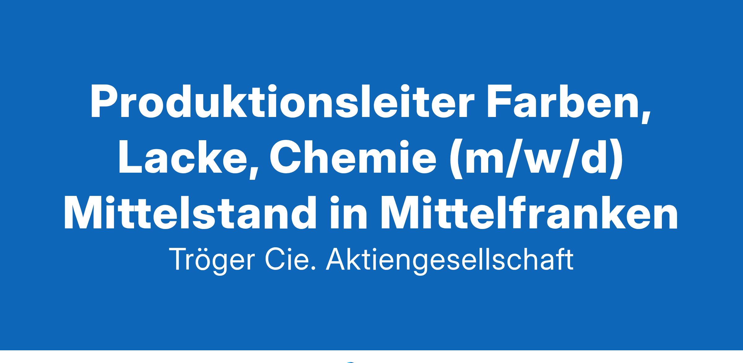 Wohnhaft in der Region oder umzugsbereit Nürnberg, Ingolstadt, Augsburg, Nördlingen Wiley Pharma, Chemie, Med., Biotechn. Ingenieurwesen Wirtschaftsingenieurwesen Ausgezeichnete Karriereperspektive in Mittelfranken Mitarbeit in einem inhabergeführten, mittelständischen, wirtschaftlich gesunden und unabhängigen Unternehmen. Abwechslungsreiche, vielfältige und verantwortungsvolle Aufgaben und Tätigkeitsbereiche mit direkter Anbindung an die Geschäftsführer. Ausgezeichnete Perspektiven zur beruflichen Weiterentwicklung. Das Unternehmen ist eine mittelständische Industriefirma (ca. 140 Mitarbeitende weltweit) in Mittelfranken mit Sitz im Raum Nürnberg - Ingolstadt - Augsburg - Nördlingen. Als forschungsorientierter Spezialist entwickelt, produziert und vertreibt das Unternehmen Druckfarben für den industriellen und technischen Siebdruck und Tampondruck sowie hochwertige Lacke für industrielle Anwendungen. Innovative Lösungen und hervorragende Kundennähe mit Vertriebs- und Servicestandorten weltweit haben die Firmengruppe international erfolgreich gemacht. In einigen Segmenten gehört das Unternehmen zu den Marktführern. Die Produktion ist gekennzeichnet durch chargenbezogene, teilautomatisierte Produktionsprozesse mit hohem Qualitätsanspruch. Als Nachfolge suchen wir eine Persönlichkeit für die Führung und Weiterentwicklung unserer Produktion. Wirtschaftsingenieure Verfahrenstechnik Art (Berufsfeld) Langjährige (> 7 J.) Deutsch Techn. Management, Projektplanung Ingenieur/Techniker Produktionsleiter Farben, Lacke, Chemie (m/w/d) Mittelstand in Mittelfranken Führungskräfte Handwerk, Fertigung, Produktion Sicherstellen einer effizienten und termingerechten Fertigung