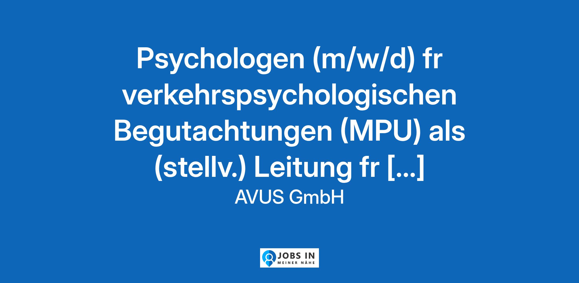 Die AVUS GmbH ist ein 1993 gegrndetes, bundesweit vertretenes Dienstleistungsunternehmen im Bereich der Medizinisch-Psychologischen Diagnostik und amtlich anerkannte Begutachtungsstelle fr Fahreignung. Fr unseren Standort in Mnchen suchen wir Psychologen (m/w/d) fr verkehrspsychologische Begutachtungen (MPU) als (stellv.) Leitung fr unsere Begutachtungsstellen fr Fahreignung in Voll- oder Teilzeit.