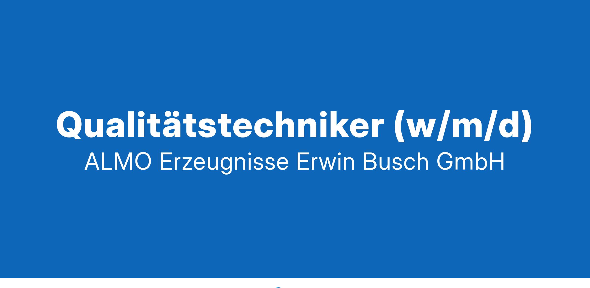 Sie sind ein wichtiger Teil unserer Zukunft. Hoffentlich sind wir auch ein Teil Ihrer Zukunft! Bei B. Braun schützen und verbessern wir die Gesundheit der Menschen weltweit. Sie unterstützen diese Vision, indem Sie Ihr Know-how einbringen und Innovation, Effizienz und Nachhaltigkeit als Werte teilen. Deshalb möchten wir unser Unternehmen gemeinsam mit Ihnen weiter entwickeln. Mit Blick auf Ihre Zukunft leisten wir gemeinsam einen Beitrag zur Gesundheitsversorgung weltweit, mit Vertrauen, Transparenz und Wertschätzung. Das ist Sharing Expertise. Qualitätstechniker (w/m/d) Unternehmen: ALMO-Erzeugnisse Erwin Busch GmbH