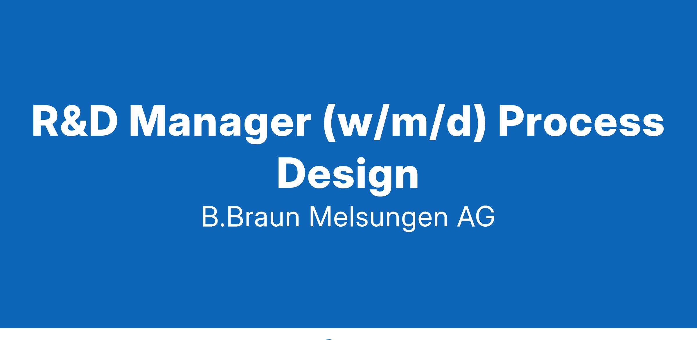 Sie sind ein wichtiger Teil unserer Zukunft. Hoffentlich sind wir auch ein Teil Ihrer Zukunft! Bei B. Braun schützen und verbessern wir die Gesundheit der Menschen weltweit. Sie unterstützen diese Vision, indem Sie Ihr Know-how einbringen und Innovation, Effizienz und Nachhaltigkeit als Werte teilen. Deshalb möchten wir unser Unternehmen gemeinsam mit Ihnen weiter entwickeln. Mit Blick auf Ihre Zukunft leisten wir gemeinsam einen Beitrag zur Gesundheitsversorgung weltweit, mit Vertrauen, Transparenz und Wertschätzung. Das ist Sharing Expertise.R&D Manager (w/m/d) Process DesignUnternehmen :