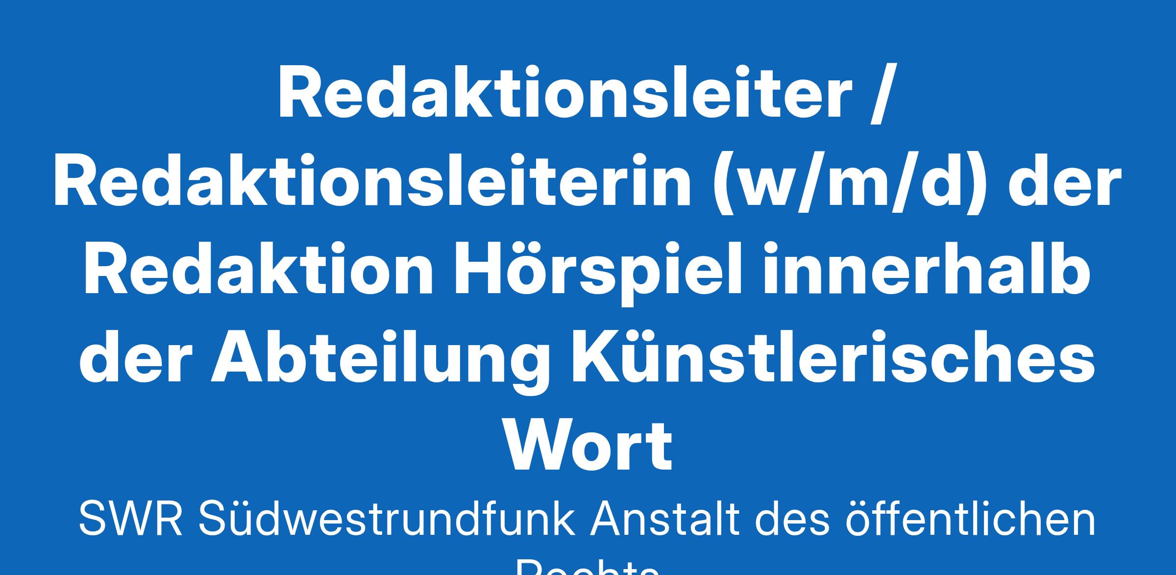 Wir dienen der Gesellschaft. Wir hören den Menschen zu. Wir stehen für lebendige Demokratie und solidarisches Zusammenleben. Wir bieten mit unseren unabhängigen Angeboten allen Menschen in Baden-Württemberg und Rheinland-Pfalz Orientierung, Heimat und Geborgenheit.Der Südwestrundfunk sucht Sie alsRedaktionsleiter / Redaktionsleiterin (w/m/d) der Redaktion Hörspiel innerhalb der Abteilung Künstlerisches WortIHRE AUFGABENSie leiten die Redaktion Hörspiel und sind verantwortlich für deren Personal- und EtatsteuerungSie vertreten den SWR in der Steuerungsgruppe der vernetzten Hörspielgemeinschaftsredaktion der ARD und gestalten deren Ausbau mitZwischen der vernetzten Gemeinschaftsredaktion und der Redaktion Hörspiel des SWR sorgen Sie für gute Informationsflüsse und steuern in Zusammenarbeit Hörspielinhalte in allen GenresSie begleiten das gesamte Hörspiel-Team des SWR bei der Zusammenarbeit in der ARD, in der Distribution und der Konzentration auf digitale AusspielwegeSie betreuen gegebenenfalls selbst Hörspielprojekte dramaturgisch und redaktionellDie Motivation und Entwicklung Ihrer Mitarbeitenden und des gesamten Teams entlang der Unternehmensziele sind für Sie zentrale FührungsaufgabenIHR PROFILSie haben ein abgeschlossenes Hochschulstudium im Bereich Dramaturgie oder Medienwissenschaft und/oder langjährige Berufspraxis in den Bereichen Dramaturgie und DistributionSie haben umfassende und fundierte Kenntnisse des Hörspielportfolios der ARD und sind mit dem aktuellen Reformprozess vertrautSie sind vertraut mit Change-Prozessen und dem Aufbau von OrganisationsstrukturenIn der Entwicklung, Umsetzung und Distribution von akustischen Inhalten haben Sie ErfahrungSie begeistern sich für das Genre Hörspiel, bringen Teamfähigkeit, Kreativität, Ideenreichtum mit sowie die Bereitschaft, vor Ort zu arbeitenSie sind ein*e kommunikative*r Teamplayer*in, geben offenes und konstruktives Feedback und haben Freude an wertschätzender MitarbeiterführungWAS WIR BIETENZeitgemäße, lebensphasenorientierte Arbeitszeit-, Arbeitsort- und Zeitkontenmodelle sowie weitere attraktive Rahmenbedingungen begleiten und fördern den interessanten und vielseitigen beruflichen Werdegang unserer Beschäftigten.Die Stelle ist teilbar.VIELFALT IM SWRDer SWR verfolgt das Ziel der beruflichen Chancengleichheit von Frauen und Männern und fordert daher Frauen auf, sich zu bewerben.Wir sind Unterzeichner der "Charta der Vielfalt" und fördern die Vielfalt in unserer Belegschaft. Jede Bewerbung ist bei uns willkommen, unabhängig von Geschlecht, kultureller oder sozialer Herkunft, Religion, Weltanschauung, Alter, sexueller Orientierung oder einer Behinderung.DIE WICHTIGSTEN FACTS AUF EINEN BLICKAusschreibungsnummer