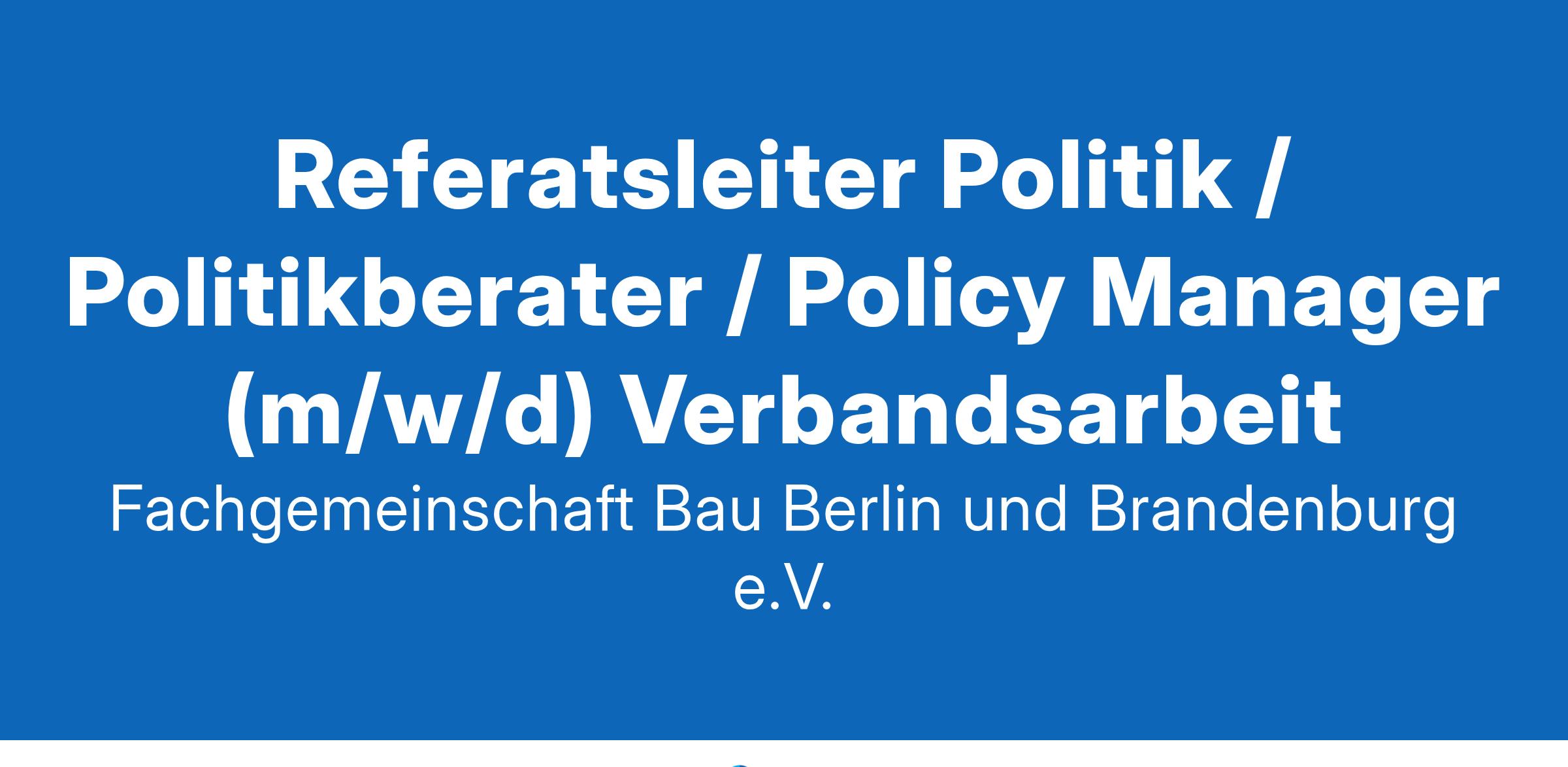 Wir möchten uns bei Ihnen bewerben! Wir bei der Fachgemeinschaft Bau Berlin und Brandenburg e.V. sind zukunftsorientiert und dennoch in Tradition und Handwerkskunst stark verwurzelt. Wir sind ein gut eingespieltes Team, das auf die Erfahrung der älteren und den frischen Wind der jüngeren Kollegen baut. Wir möchten etwas bewegen! Wir sind der mitgliederstärkste Verband der Bauwirtschaft in der Region Berlin und Brandenburg. Wir kommunizieren die Bedürfnisse unserer Mitgliedsunternehmen und engagieren uns für sie politisch. Wir bringen Bauunternehmen mit Auftraggebern und Entscheidern in der Region zusammen. Wir beraten die Unternehmer bei technischen, rechtlichen oder betriebswirtschaftlichen Fragestellungen in ihrem Alltag. Wir liefern praxisnahe Lösungen für sie. Wir suchen: Referatsleiter Politik / Politikberater / Policy Manager (m/w/d) Berlin in Vollzeit zum nächstmöglichen Zeitpunkt unbefristet Als Referatsleiter Politik (m/w/d) sind Sie zuständig für den strategischen Aufbau und die Weiterentwicklung der politischen Verbandsarbeit und Kommunikation sowie für strukturierte Monitorings von baupolitischen Themen. IHRE AUFGABEN Strategischer Aufbau und Weiterentwicklung der politischen Verbandsarbeit und Kommunikation Strukturiertes Monitoring und Identifizierung relevanter baupolitischer Themen und Entwicklungen Erstellen von baupolitischen Stellungnahmen und Grundlagenpapieren in enger Zusammenarbeit mit der Geschäftsführung und den Fachabteilungen Entwicklung von Strategien, Konzepten, Formaten und Kampagnen für eine wirkungsvolle Positionierung des Verbandes in Politik und Öffentlichkeit Organisation von Veranstaltungen für die Interaktion mit Entscheidungsträgern aus Politik und Wirtschaft Vorbereitung und Teilnahme an politischen Gesprächen Aufbau eines belastbaren Netzwerkes in Politik und Verbandsumfeld Strategische Aufbau und Weiterentwicklung der politischen Verbandsarbeit und Kommunikation IHRE QUALIFIKATIONEN Abgeschlossenes Studium mit Schwerpunkt Politik und Kommunikation, eine vergleichbare Ausbildung oder eine vergleichbare Qualifikation Fähigkeit, politische Themen klar, verständlich und nachvollziehbar in Wort und Schrift darzustellen Teamfähigkeit, Organisationstalent, Flexibilität Sicheres Auftreten und Fähigkeit zur Steuerung komplexer Abstimmungsprozesse Qualitätsbewusster, dienstleistungsorientierter, selbstständiger und zuverlässiger Arbeitsstil Verbandserfahrung wünschenswert DAS BIETEN WIR IHNEN Unbefristetes Arbeitsverhältnis in Voll- oder Teilzeit Familienfreundliche Arbeitszeiten und mobiles Arbeiten Übernahme von Kita-Gebühren Monatlicher Tankgutschein oder Zuschuss zum BVG-Ticket Übernahme der Leasingraten für ein Dienstfahrrad Umfangreiche Sport- und Gesundheitsangebote Kurze Entscheidungswege und eigenverantwortliche Projektsteuerung Freiraum für eigene Ideen und Kreativität Umfangreiche Entwicklungsmöglichkeiten im Rahmen von Fort- und Weiterbildungen Ein sehr gutes Arbeitsklima und motivierte Kollegen Sie fühlen sich angesprochen? Großartig! Lassen Sie uns sprechen. Holger Gültzow | Geschäftsstellenleiter Berlin