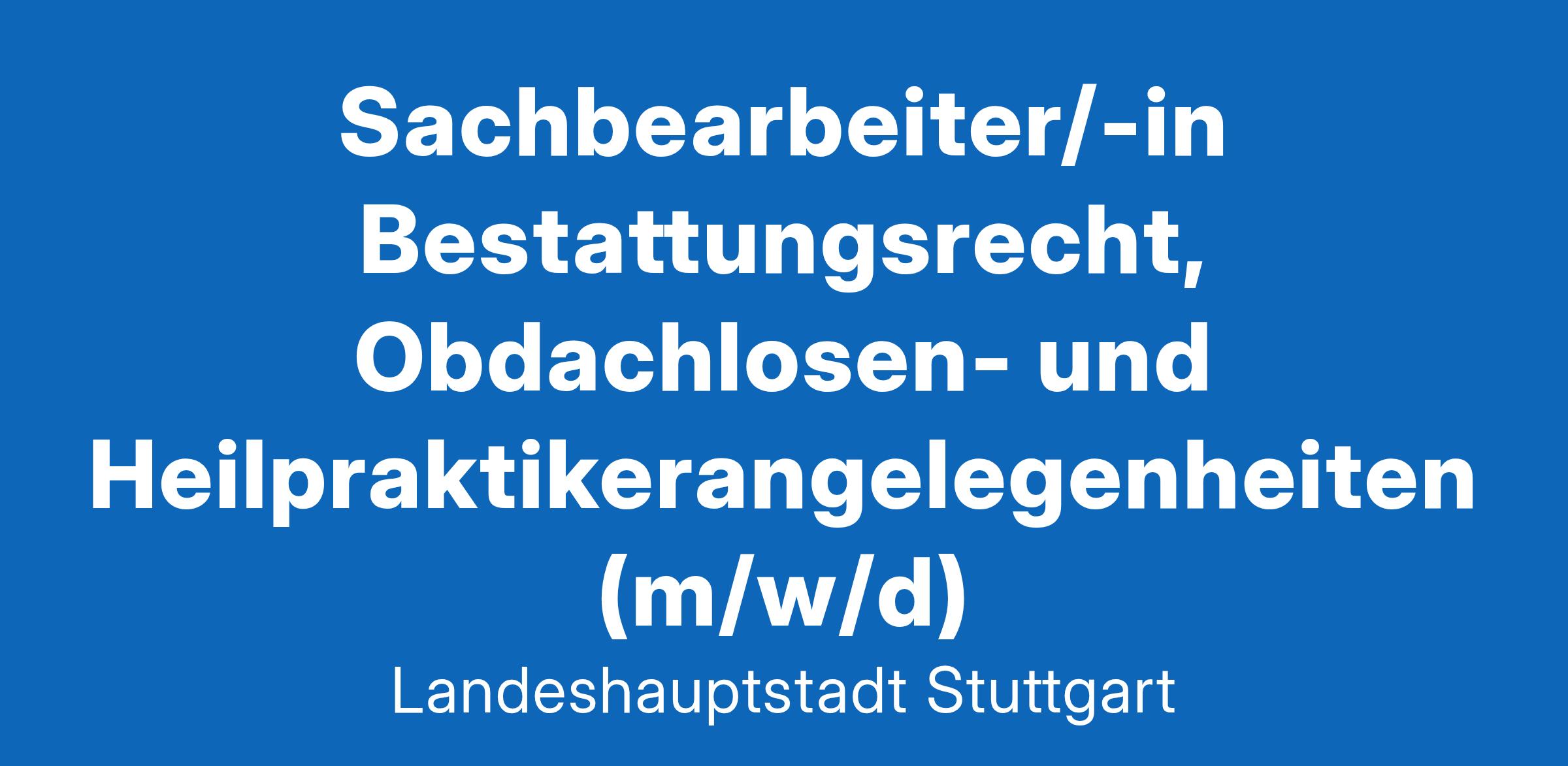 Sachbearbeiter/-in Bestattungsrecht, Obdachlosen- und Heilpraktikerangelegenheiten (m/w/d) Wir suchen Sie für das Amt für öffentliche Ordnung der Landeshauptstadt Stuttgart. Die Stelle ist unbefristet zu besetzen. Die Dienststelle Allgemeine Sicherheits- und Ordnungsangelegenheiten setzt sich zusammen aus über 100 Mitarbeitenden und umfasst sowohl den städtischen Vollzugsdienst als auch die Bereiche Waffen-, Sprengstoff, Jagd- und Fischereirecht, Versammlungen, (Groß-) Veranstaltungen, Allgemeines Polizeirecht, Heimaufsicht, Tierschutz und weitere sicherheits- und ordnungsrelevante Themen. Ein Job, der Sie begeistert Bestattungsrecht: Sie sind zuständig für das Veranlassen von Bestattungen, das Erstellen von Leichenpässen, die Ermittlung kostenpflichtiger Angehöriger oder Erben, das Erteilen von (Ausnahme-) Genehmigungen nach dem Bestattungsgesetz, das Geltendmachen von Kostenersätzen bei Bestattungen und Notsargtransporten sowie die Vorbereitung von Entscheidungen in Widerspruchsverfahren Obdachlosenangelegenheiten: Sie sind verantwortlich für die Ermittlung der Verhältnisse von Räumungsschuldnern, Anordnungen nach dem Polizeigesetz zum Zwecke der Unterbringung von Obdachlosigkeit bedrohter Personen und das Breitstellen von Ersatzunterkünften in Zusammenarbeit mit dem Sozialamt, der SWASG etc. Heilpraktikerangelegenheiten: zu Ihren Aufgaben zählen die Begleitung und Betreuung des Zulassungsverfahrens im Heilpraktikerwesen, die Überwachung der Prüfungstermine beim Gesundheitsamt, das Erstellen von Ablehnungsbescheiden, die Erlaubniserteilung und der Erlass von Kostenbescheiden das Führen der Sachkonten des Sachgebiets gehört ebenfalls zu Ihren Aufgaben Ihr Profil, das zu uns passt eine abgeschlossene Ausbildung als Verwaltungswirt/-in, Verwaltungsfachangestellte/-r, Beschäftigte/-r mit erfolgreich abgeschlossener ersten Prüfung nach der Entgeltordnung (VKA, ehem. Angestelltenlehrgang I) oder eine abgeschlossene Ausbildung als Kaufmann/Kauffrau für Büromanagement, Justizfachangestellte/-r, Notarfachangestellte/-r, Steuerfachangestellte/-r, Rechtsanwaltsfachangestellte/-r, Finanzwirt/-in, Sozialversicherungsfachangestellte/-r Berufserfahrung im öffentlichen Dienst, vorzugsweise in der Ordnungsverwaltung ist von Vorteil, Erfahrungswerte im Kundenkontakt mit Bürger/-innen sind hilfreich Sie treten sicher, kommunikationsstark und überzeugend auf und verfügen über das erforderliche Durchsetzungs- und Verhandlungsgeschickt strukturierte und verantwortungsbewusste Arbeitsweise Freuen Sie sich auf einen zukunftssicheren Arbeitsplatz Work-Life-Balance durch flexible Arbeitszeitmodelle und die Möglichkeit, mobil bzw. im Homeoffice zu arbeiten persönliche und fachliche Weiterentwicklung durch unseren BildungsCampus Gesundheitsmanagement und Sportangebote ein kostenfreies Deutschlandticket für den ÖPNV das Fahrradleasing-Angebot "StuttRad" betriebliche Altersvorsorge und Jahressonderzahlung Stuttgart-Zulage für Tarifbeschäftigte – bis zu 150 €monatlich attraktive Personalwohnungen im Stadtgebiet Stuttgart vergünstigtes Mittagessen Wir bieten Ihnen eine Stelle der Besoldungsgruppe A 9 / Entgeltgruppe 8 TVöD. Noch Fragen? Für nähere Auskünfte zur Tätigkeit steht Ihnen Frau Dorsch unter 0711 216-91936 oder sabine.dorsch@stuttgart.de gerne zur Verfügung. Für personalrechtliche Fragen zum Verfahren wenden Sie sich bitte an Frau Gerdes unter 0711 216-93116 oder poststelle.32-bewerbungen@stuttgart.de. Alle weiteren Informationen zu unseren vielfältigen Karrieremöglichkeiten finden Sie unterwww.stuttgart.de/karriere. Weitere Informationen zum Amt für öffentliche Ordnung finden Sie unter www.stuttgart.de/ordnungsliebe. Besuchen Sie unsere Karriere-Jobstory auf Instagram @stuttgartvonberuf. Bewerbungen richten Sie bitte bis zum 13.02.2025 an unser Online-Bewerbungsportal unter www.stuttgart.de/jobs. Falls eine Online-Bewerbung nicht möglich ist, können Sie uns Ihre Papierbewerbung unter Angabe der Kennzahl 32/0012/2025 an das Amt für öffentliche Ordnung der Landeshauptstadt Stuttgart, Eberhardstraße 39, 70173 Stuttgart senden. Wir freuen uns auf Ihre Bewerbung. Wir begrüßen Bewerbungen von Schwerbehinderten und Gleichgestellten, diese werden bei entsprechender Eignung vorrangig berücksichtigt. Teilzeitarbeit ist bei allen Stellen möglich, sofern in der Ausschreibung nichts anderes angegeben ist. www.stuttgart.de/jobs