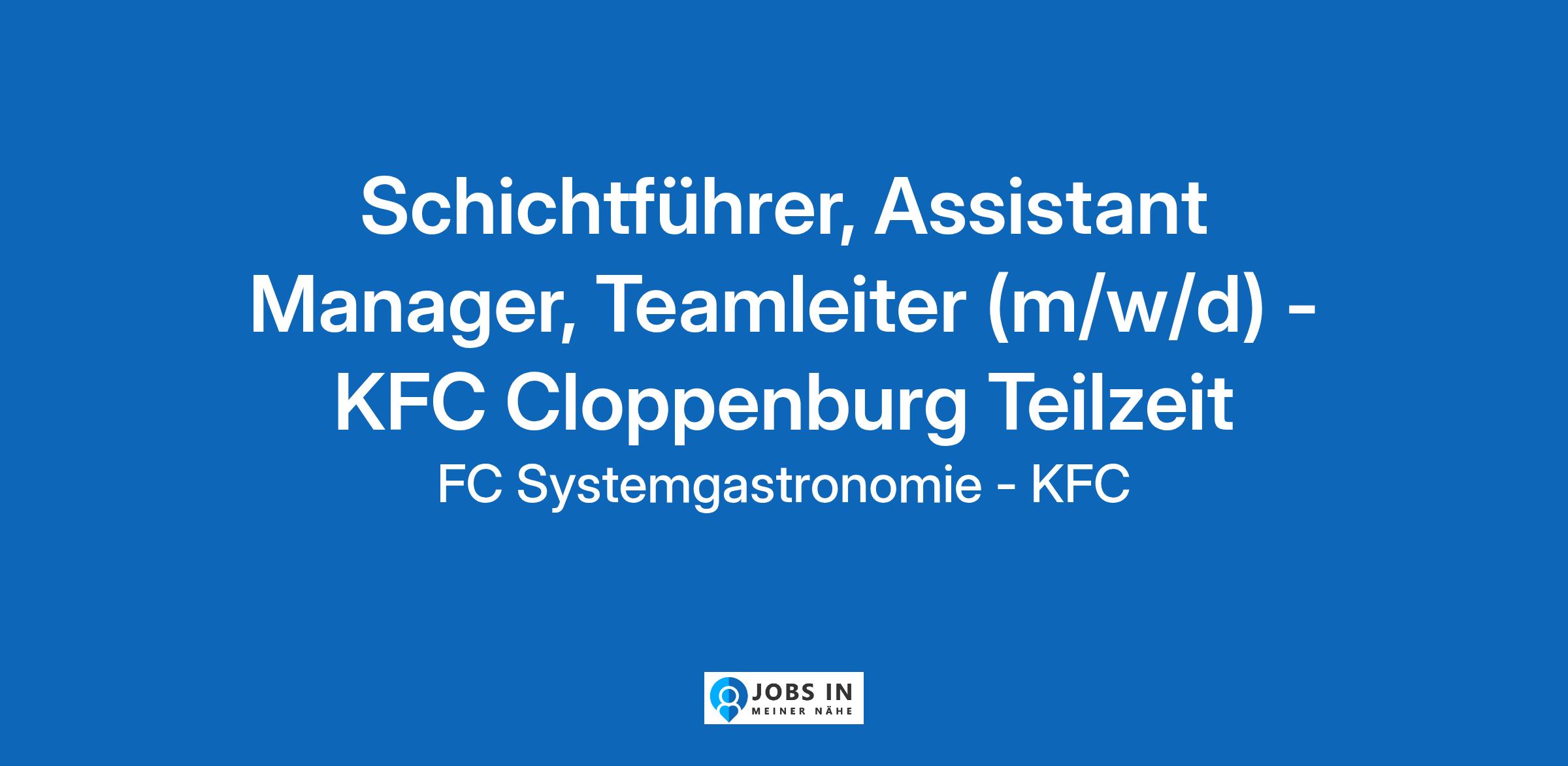 Für unsere KFC Filiale in Cloppenburg suchen Wir einen **Schichtführer** **(m/w/d).** **Deine Aufgaben** * Du bist im Einsatz für die frische Zubereitung unserer Hähnchenspezialitäten. * Dein Gesetz: unsere Qualitätsstandards. * Dein Ziel: die Kreation unseres unvergleichlichen Geschmacks – finger lickin’ good! **Was du mitbringst** * Mindestens 18 Jahre, Lust auf Teamwork und Appetit auf unser feinstes Chicken * Eine Menge Eigeninitiative und viel Spaß daran, ein perfekter Gastgeber zu sein * Flexibilität für den Schicht- und Wochenenddienst in Deinem Team, wenn‘s darauf ankommt **Was wir dir bieten** * In unserer KFC-Familie wird Dir niemals langweilig, denn wir entwickeln uns stetig weiter * Du arbeitest in einer zukunftssicheren Branche, denn gut gegessen wird immer * Eine einzigartige Unternehmenskultur, geprägt von Vertrauen, * Wertschätzung und dem Glauben, dass jeder Einzelne zählt * Wer richtig Gas gibt, wird gefördert, mit Weiterbildungs- und Aufstiegschancen!