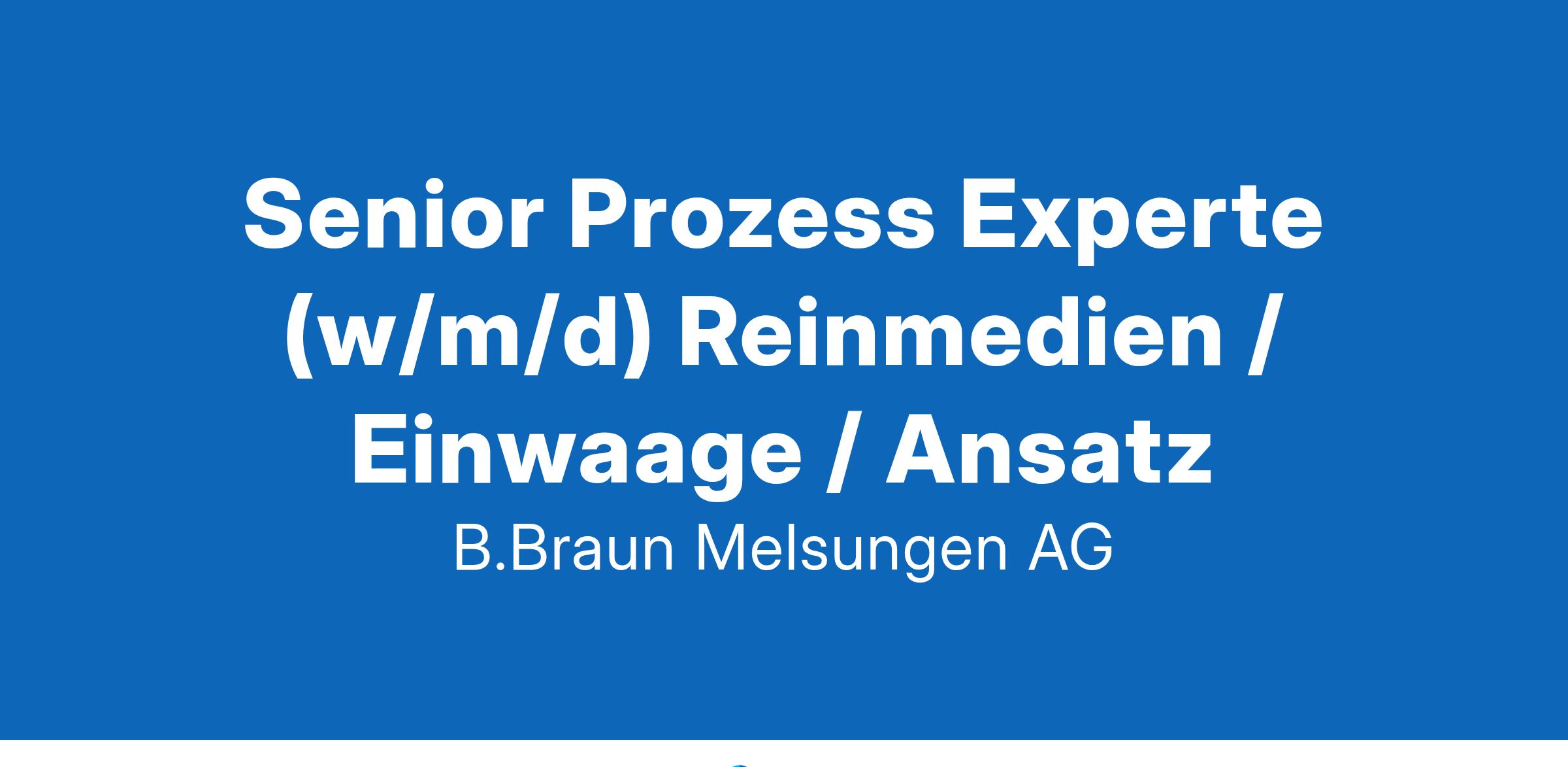 Sie sind ein wichtiger Teil unserer Zukunft. Hoffentlich sind wir auch ein Teil Ihrer Zukunft! Bei B. Braun schützen und verbessern wir die Gesundheit der Menschen weltweit. Sie unterstützen diese Vision, indem Sie Ihr Know-how einbringen und Innovation, Effizienz und Nachhaltigkeit als Werte teilen. Deshalb möchten wir unser Unternehmen gemeinsam mit Ihnen weiter entwickeln. Mit Blick auf Ihre Zukunft leisten wir gemeinsam einen Beitrag zur Gesundheitsversorgung weltweit, mit Vertrauen, Transparenz und Wertschätzung. Das ist Sharing Expertise.Senior Prozess Experte (w/m/d) Reinmedien / Einwaage / AnsatzUnternehmen :