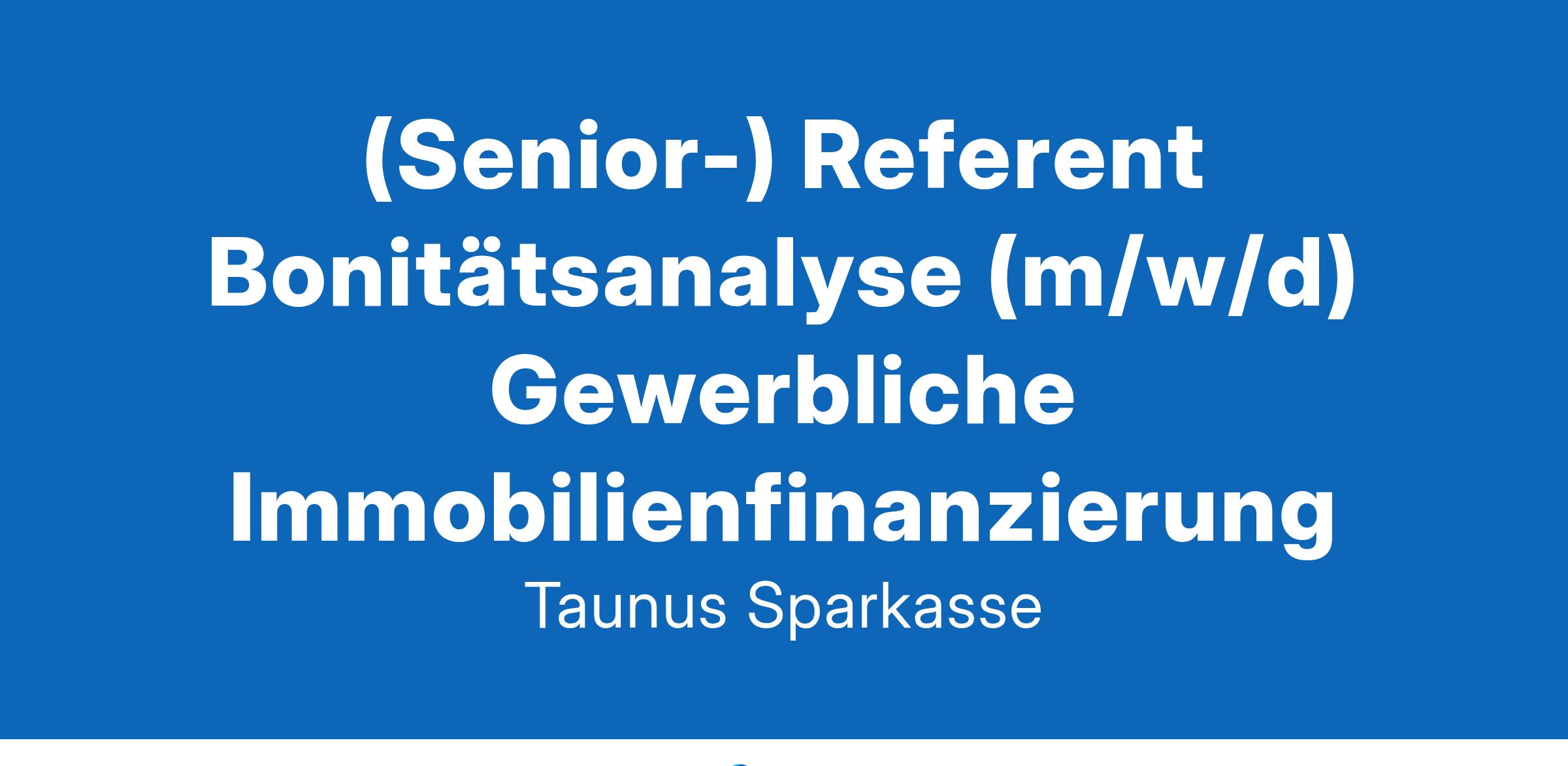 Werden Sie (Senior-) Referent Bonitätsanalyse (m/w/d) - Gewerbliche Immobilienfinanzierung in Voll-/TeilzeitDas ist mein Job! KARRIERE BEI DER TAUNUS SPARKASSE: NAH BEI DE‘ LEUT‘. Mitten im Rhein-Main-Gebiet befindet sich die Taunus Sparkasse, Ihr neuer Arbeitgeber. Unser rund 750-köpfiges Team erwirtschaftete zuletzt eine Bilanzsumme von ca. 7,4 Milliarden Euro. Aber was uns antreibt, sind die Bürgerinnen und Bürger, Unternehmen und Kommunen unserer Region, die wir mit zuverlässigen Bankdienstleistungen versorgen. Außerdem sind wir ein starker Partner für Vereine sowie für soziale, kulturelle und sportliche Projekte. Kurz: Wir sind eine Bank, die ganz nah an den Menschen ist – eben „nah bei de‘ Leut‘“. Auch Sie werden das schnell merken. Denn Ihre persönlichen Stärken fördern wir durch stetige Weiterbildung und abwechslungsreiche Projekte, Ihr Wohlbefinden durch unkompliziertes Miteinander, ausgeglichene Work-Life-Balance und die Gewissheit, bei einem sicheren, regionalen Marktführer zu arbeiten.Aufgaben, die auf Ihr Können einzahlen