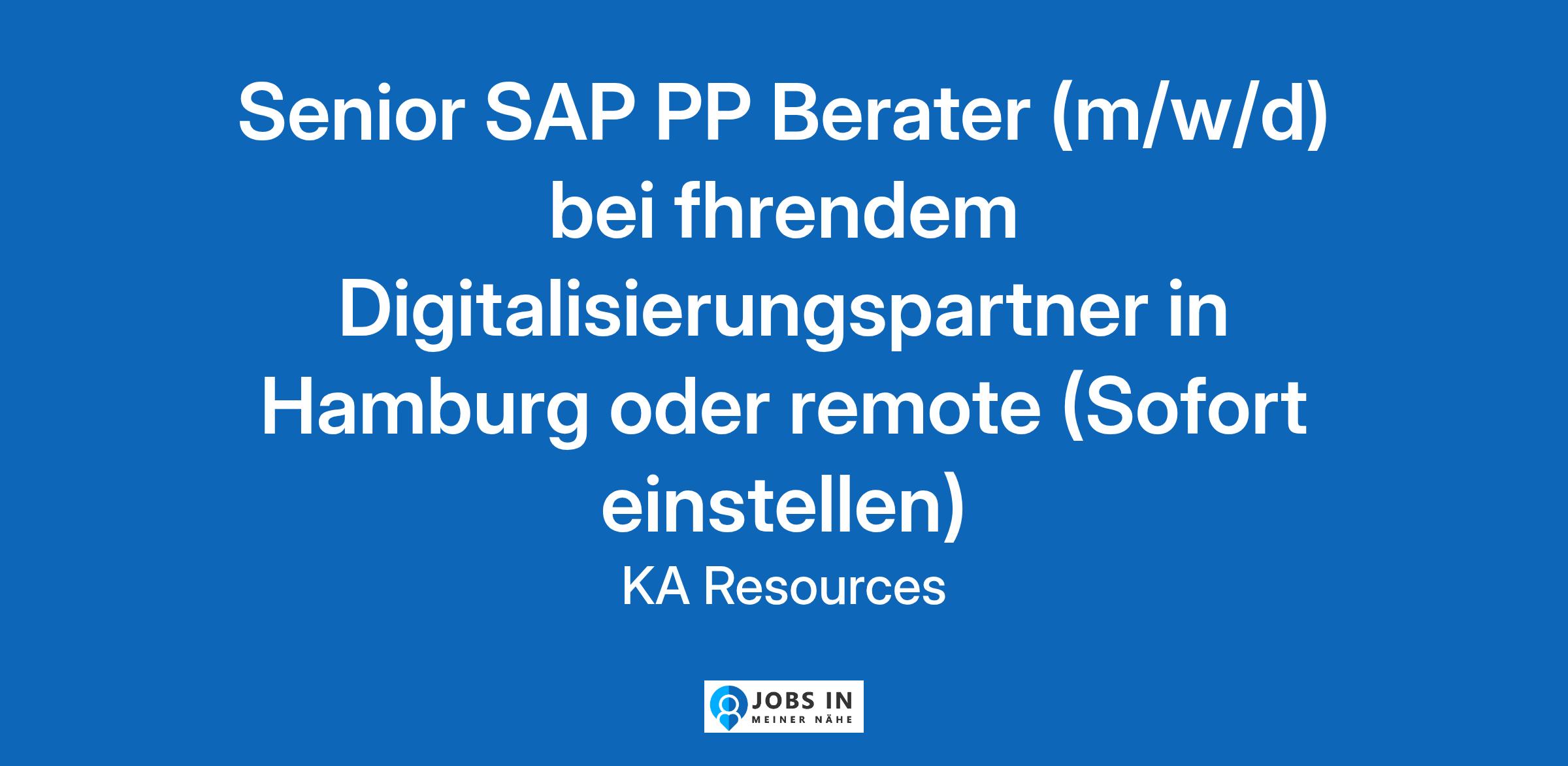 Wenn das Thema S/4HANA Ihnen ein Lcheln ins Gesicht zaubert und Sie auerdem Lust auf spannende Projekte im Bereich SAP PP haben, wartet schon morgen Ihr neuer Arbeitsplatz als Senior SAP PP Berater (m/w/d) mit vielfltigen Aufgaben und Weiterbildungsmglichkeiten auf Sie.Bei unserem Kunden handelt es sich um einen der fhrenden, internationalen Dienstleister im Bereich der digitalen Transformation und einen starken Partner des deutschen Mittelstands und diverser internationaler Grokunden. Das agile Unternehmen steht fr Erfahrung, Verlsslichkeit und Kommunikation auf Augenhhe. Flache Hierarchien geben Ihnen den richtigen Handlungsspielraum, um Verantwortung zu bernehmen und Vernderungen mitzugestalten.In Ihrer neuen Position begleiten Sie Kundenprojekte in allen Projektphasen. Dies umfasst sowohl die Planung und Erstellung von Konzepten, das Design und Customizing, als auch das Roll-out sowie nicht zuletzt die Umstellung auf S/4HANA. Sie beraten bei Projekten hinsichtlich Migrationen, der Steuerung der Produktion und der Materialplanung. Die Erstellung von Analysen zur Situation des Kunden sowie die Erarbeitung von Konzepten, Optimierungen und Umsetzungen von Prozessen in der Materialwirtschaft runden Ihren Aufgabenbereich ab. Zustzlich planen Sie Schulungen und Workshops, welche Sie anschlieend durchfhren.Unser Kunde bietet Ihnen spannende, prozessorientierte Projekte im Bereich S/4 HANA, an welchen Sie eng verzahnt in einem kleinen Team arbeiten, in welchem Sie auch die Teilprojektleitung bernehmen. Von wo aus Sie arbeiten, ist Ihnen berlassen. Unser Kunde bietet Ihnen die Mglichkeit, auerhalb der Prsenzzeiten bei seinen Kunden komplett remote zu arbeiten. Die Anwesenheit in einem der diversen, modernen, deutschlandweit verteilten Bros ist Ihnen freigestellt. Sie arbeiten in einer 40-Stunden-Woche oder in Teilzeit mit flexiblen Arbeitszeitmodellen und knnen sich ber 30 Tage Urlaub freuen.Wenn Sie motiviert sind und sich weiterbilden mchten, ist Ihr neuer Arbeitgeber gerne bereit, mit Ihnen ber die vielen individuellen Mglichkeiten, wie z.B. Inhouse-Schulungen oder SAP-Zertifizierungen zu sprechen. Zgern Sie also nicht und bewerben Sie sich noch heute. Kurzbeschreibung: