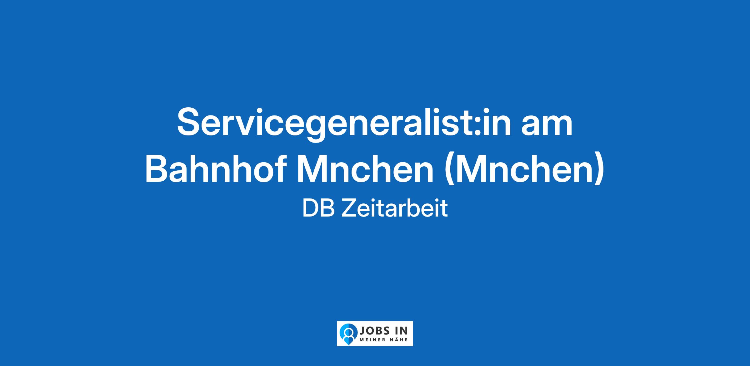 Zum nchstmglichen Zeitpunkt suchen wir dich als Zeitarbeitnehmer:in im Auftrag der DB InfraGO AG fr einen Einsatz als Servicegeneralist (w/m/d) am Standort Mnchen. Als Zeitarbeitnehmer:in erbringst du deine Arbeitsleistung direkt vor Ort im genannten Geschftsfeld, whrend du dein Arbeitsverhltnis mit uns, der DB Zeitarbeit GmbH, abschliet.