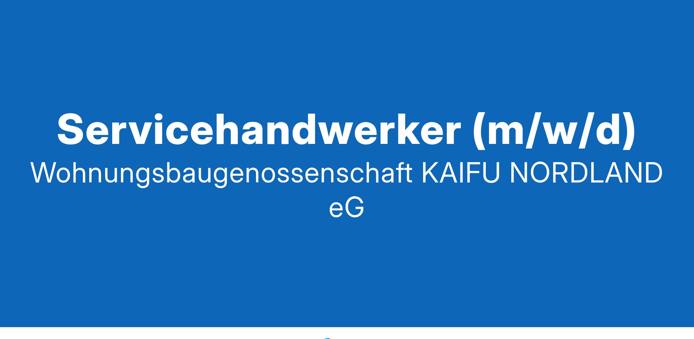 20.12.24Servicehandwerker (m/w/d)Die KAIFU-NORDLAND eG ist eine moderne und zukunftsorientierte Wohnungsbaugenossenschaft und bewirtschaftet mit rund 75 Mitarbeitern circa 5.000 Wohnungen, wovon etwa die Hälfte im Bezirk Eimsbüttel liegen und sich im Übrigen auf viele andere Stadtteile in Hamburg verteilen. Als engagierter Dienstleister in der Wohnungswirtschaft sind wir neben der marktgerechten Modernisierung unseres Bestandes und einem intensiven Bauprogramm durch die Förderung sozialer Projekte auf die künftigen Anforderungen an den Wohnungsmarkt unter Berücksichtigung der gesellschaftlichen und politischen Entwicklungen gut vorbereitet.