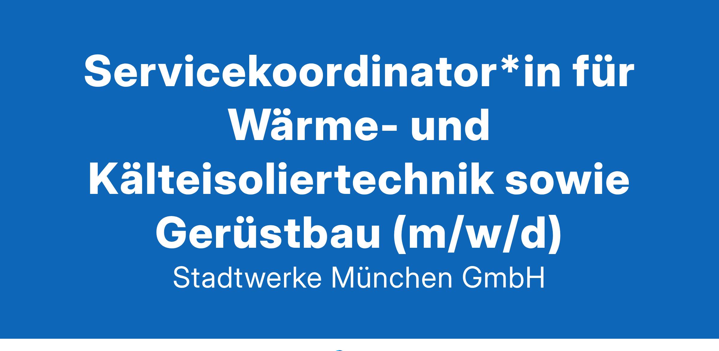 Servicekoordinator*in für Wärme- und Kälteisoliertechnik sowie Gerüstbau (m/w/d) Jetzt bewerben » Tätigkeitsbereich Anlagentechnik | Anlagen- und Komponententechnik | Technischer Service | Ressort Technik UnternehmenSWM Services GmbH Standort München VertragsartVollzeit, unbefristet Auf einen Blick Wir, die Stadtwerke München, sind einer der größten regionalen Arbeitgeber und unsere Mission ist es München rund um die Uhr am Laufen zu halten. Unsere Vision dahinter: München zu einem leuchtenden Beispiel einer vernetzten, nachhaltigen und vor allem lebenswerten Stadt zu machen. Die SWM sind Vorreiter bei der Wärmewende. Dem Bereich Anlagen- und Komponententechnik obliegt hierbei das steuernde und operative maschinentechnische Instandhaltungsmanagement. Hierbei agieren wir als zentraler Servicepartner standort- und spartenübergreifend für Instandhaltung, Befundung, Wartung, Reparatur sowie wiederkehrende Prüfung und Kontrollen von technischen Anlagen und deren Komponenten. Das Team Anlagentechnik bietet unter anderem ein maßgeschneidertes GU-Modell, eine Kombination aus Wärmedämmung und Gerüstbau zur effizienten Leistungserbringung, mit Hauptaugenmerk auf der Steuerungs- und Überwachungsfunktion zur Sicherung ordnungsgemäß erbrachter Fremdleistungen sowie deren Abnahme mit abschließender Analyse und Bewertung. Sie können aktiv in diesem spannenden und herausfordernden Portfolio mitwirken. Werden Sie Teil unseres hochmotivierten Teams! Das können Sie bei uns bewegen