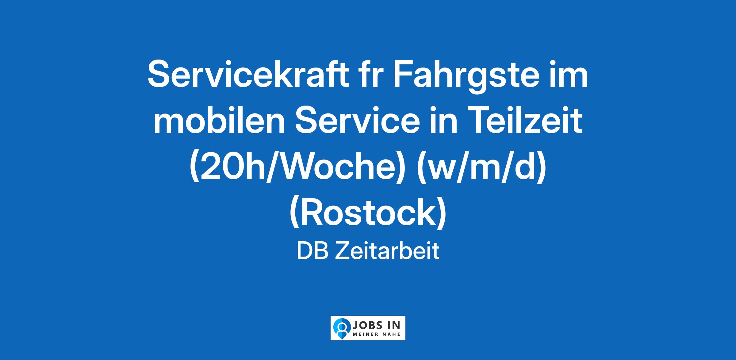 Zum nchstmglichen Zeitpunkt suchen wir dich als Zeitarbeitnehmer:in im Auftrag der DB InfraGo AG fr einen Einsatz als Servicekraft fr Fahrgste im mobilen Service in Teilzeit (20h/Woche) (w/m/d) am Standort Rostock. Als Zeitarbeitnehmer:in erbringst du deine Arbeitsleistung direkt vor Ort im genannten Geschftsfeld, whrend du dein Arbeitsverhltnis mit uns, der DB Zeitarbeit, abschliet.