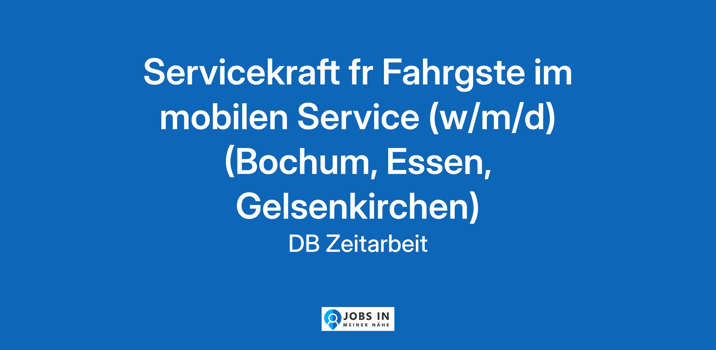 Zum nchstmglichen Zeitpunkt suchen wir dich als Zeitarbeitnehmer:in im Auftrag der DB InfraGO AG fr einen Einsatz als Servicekraft fr Fahrgste im mobilen Service (w/m/d) fr den Standort Bochum, Essen und Gelsenkirchen. Als Zeitarbeitnehmer:in erbringst du deine Arbeitsleistung direkt vor Ort im genannten Geschftsfeld, whrend du dein Arbeitsverhltnis mit uns, der DB Zeitarbeit GmbH, abschliet.