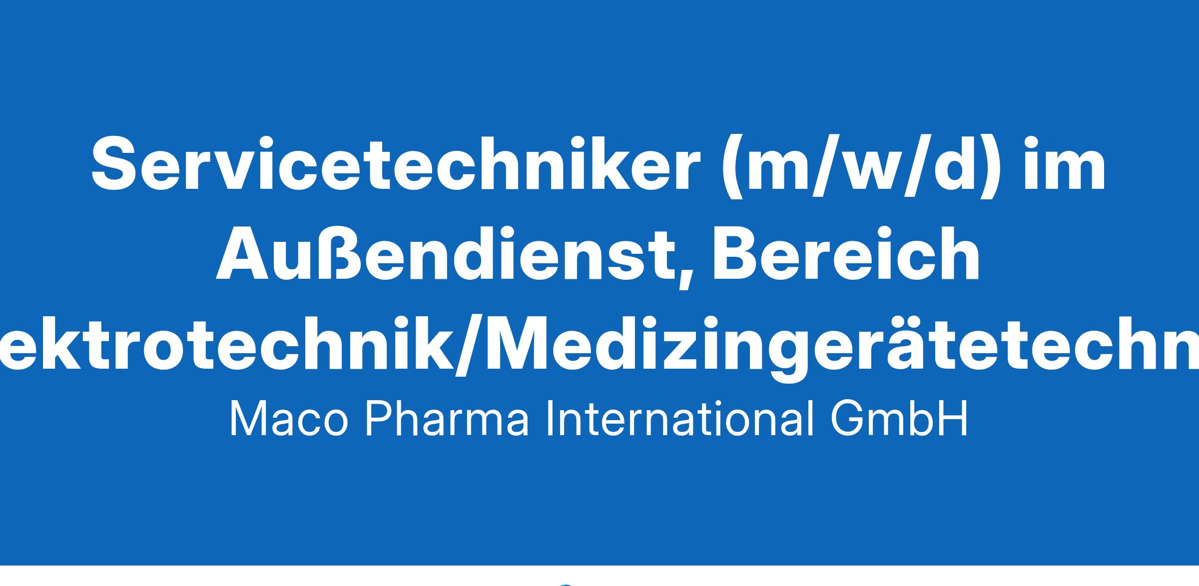 mit Wohnort in Österreich oder SüddeutschlandAufgaben:Im Bereich der Blutkomponentenherstellung bietet Macopharma innovative Lösungen sowohl für die Blutentnahme als auch für die weitere Verarbeitung von Blut. Zum Einsatz kommen unsere medizinischen Geräte in Blutbanken des Roten Kreuzes, in Krankenhäusern und Universitätskliniken. Als Servicetechniker/in sind Sie für die Prüfung, Wartung und Instandhaltung unserer Geräte vor Ort beim Kunden verantwortlich. Darüber hinaus unterstützen Sie unseren Außendienst in Fragen der Anwenderberatung und assistieren dem Vertrieb aktiv bei der Lösung technischer Aufgabenstellungen.Wir wünschen uns von Ihnen: Eine abgeschlossene Ausbildung im technischen Bereich z.B.: Medizintechnik, Anlagentechnik, Automatisierungstechnik, Mechatronik, Elektrotechnik, Energiegeräteelektronik, Elektriker oder Vergleichbares mit Grundkenntnissen im Bereich der Netzwerktechnik Ausgeprägtes technisches Verständnis auch für fachübergreifende Zusammenhänge Hohes Maß an Kunden- und Serviceorientierung Selbstständiges Arbeiten Gute Deutsch- und Englischkenntnisse in Wort und Schrift Hohe Reisebereitschaft mit Übernachtungen Führerschein Klasse B Wir bieten Ihnen: Eine freundliche Arbeitsatmosphäre Entwicklungsmöglichkeiten in einem stetig wachsenden Unternehmen Einen Dienstwagen auch zur privaten Nutzung Ein marktgerechtes Gehalt inklusive Bonus Langfristige Beschäftigungsperspektive Flache Hierarchien und direkte Kommunikationswege aufgrund der mittelständischen Struktur Langfristige Beschäftigungsperspektive Fühlen Sie sich angesprochen?Dann freuen wir uns auf Ihre vollständigen Bewerbungsunterlagen inklusive Ihrer Gehaltsvorstellungen per E-Mail an: stephanie.ehrenberg@macopharma.de Maco Pharma International GmbH