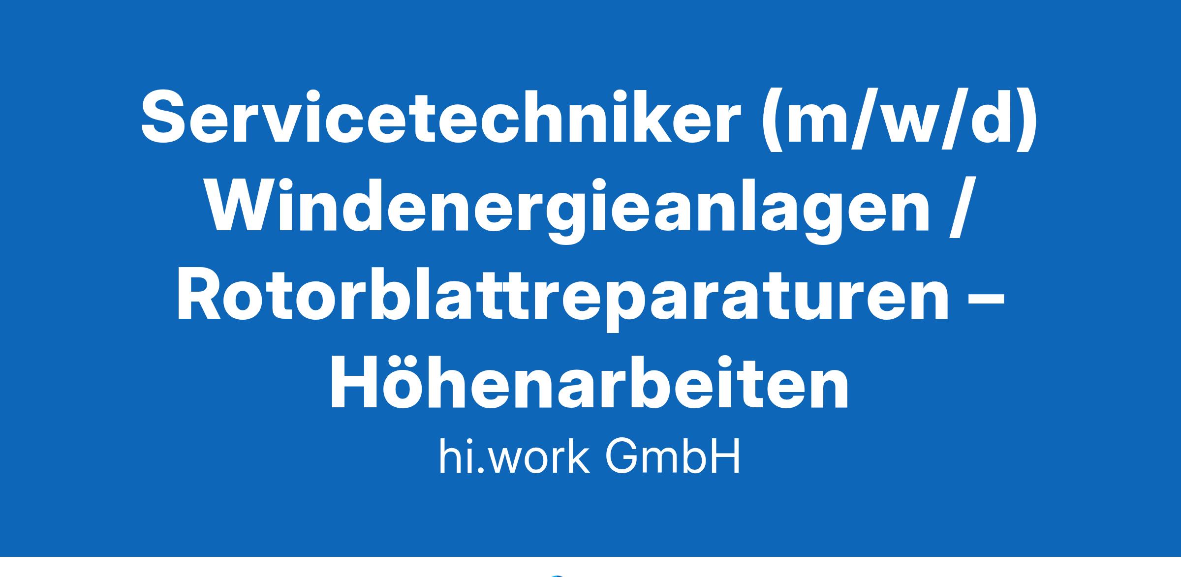 Servicetechniker (m/w/d) Windenergieanlagen / Rotorblattreparaturen – Höhenarbeiten Wir sind Servicespezialist für Rotorblätter, Turm und andere WEA-Komponenten, weltweit, typenunabhängig, on- und offshore seit mehr als 25 Jahren.Steig’ gleich ganz oben ein:Dein Aufgabengebiet umfasst Wartungs-, Inspektions- und Reparaturleistungen an Rotorblättern von Windenergieanlagen. Der Höhenzugang erfolgt mittels verschiedener Befahranlagentypen oder Seilzugangs- und Positionierungstechnik. Wir bieten Dir eine abwechslungsreiche, spannende Tätigkeit mit langfristiger Zukunftsperspektive in einem etablierten Unternehmen. Wenn Du gern im Team arbeitest, reiselustig und flexibel bist, würden wir uns freuen, Dich persönlich kennen zu lernen.Du verfügst über: ein Mindestalter von 18 Jahren und bist höhentauglich idealerweise eine handwerkliche Ausbildung (Bootsbauer, Tischler, Maler / Lackierer o. ä.) bzw. ausgeprägte handwerkliche Fähigkeiten und technisches Verständnis Erfahrung im Bereich Windenergieanlagen / Rotorblattservice Deutsch- und nach Möglichkeit Englischkenntnisse Grundkenntnisse in MS Office Führerschein, mindestens Klasse B uneingeschränkte Reisebereitschaft Wir bieten Dir: unbefristete Festanstellung in Vollzeit (40h/Woche) eine faire und leistungsorientierte Bezahlung mit Entwicklungsperspektiven finanzielle Zusatzleistungen (Altersvorsorge, Versicherung), jährliche Prämienzahlung eine partnerschaftliche Unternehmensphilosophie mit flachen Hierarchien inkl. Mitspracherecht die Gelegenheit zum eigenverantwortlichen Arbeiten im Team fachspezifische, betriebsinterne Qualifikation, Aus- und Weiterbildung in einer Zukunftsbranche Dein Kontakt:hi.work gmbh