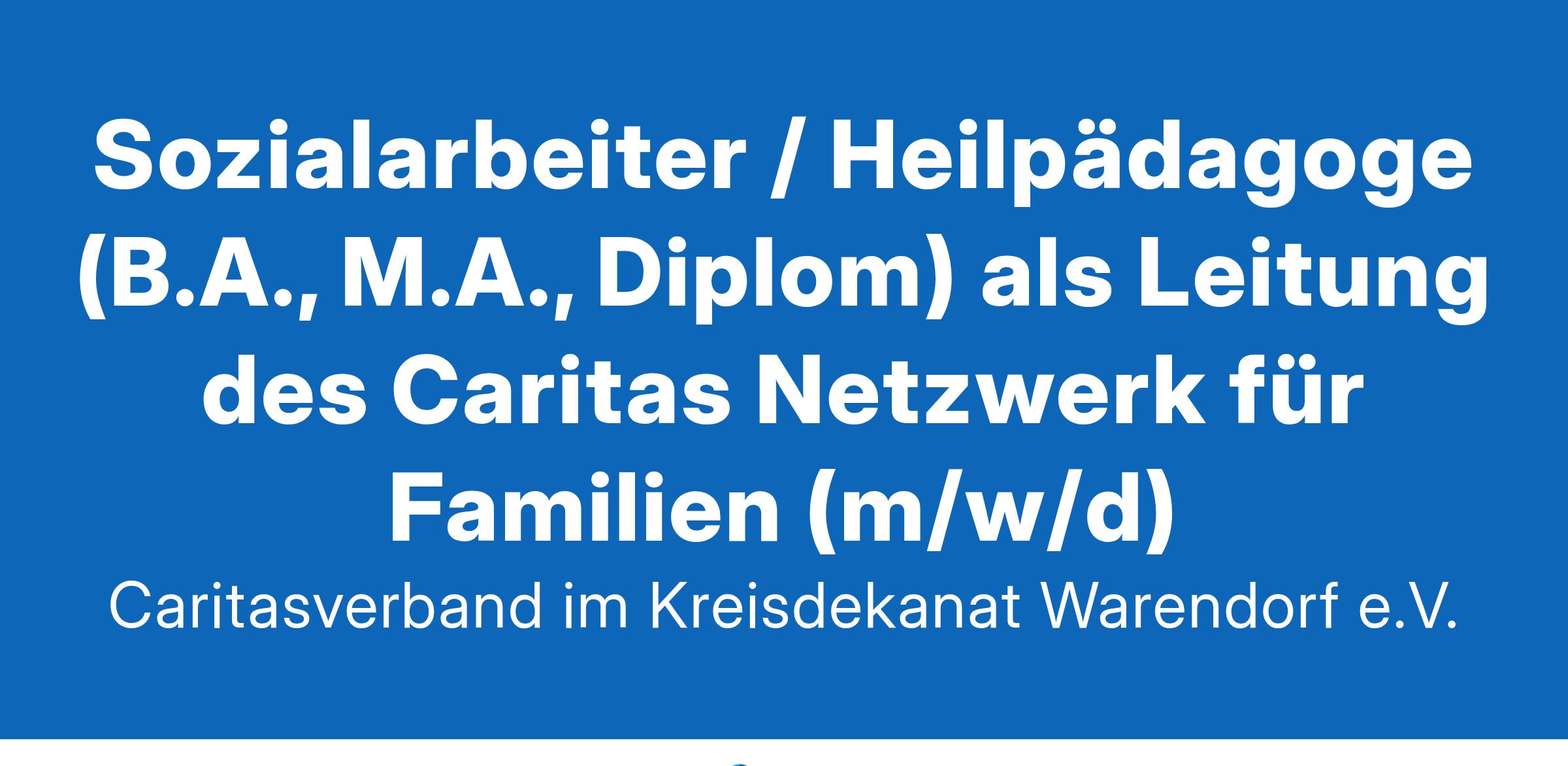 Aufgrund des Wechsels des jetzigen Stelleninhabers in den Ruhestand suchen wir zum 01.06.2025 eine*n neue Sozialarbeiter/Heilpädagoge (B.A., M.A., Diplom) als Leitung des Caritas Netzwerk für Familien (m/w/d)