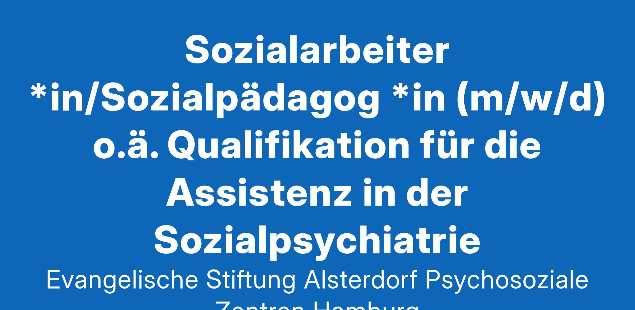 „Fachliche Kompetenz, Wertschätzung und Respekt sind die Pfeiler unserer Arbeit.“Mit einer optimistischen und Mut machenden Arbeitsweise beraten und begleiten wir in unseren Psychosozialen Zentren Menschen mit psychischen Erkrankungen im Rahmen der 'Assistenz in der Sozialpsychiatrie (ASP)'.Teamarbeit, gezielte Fort- und Weiterbildung sowie Supervision sichern die Qualität unserer Arbeit. Wir bieten sowohl "Psychosoziale Beratung" als auch "Persönliche Teilhabebegleitung" an. Im Mittelpunkt unserer personen- und sozialraumorientierten Arbeit stehen die Menschen und deren Selbstbestimmung. In unseren Gruppen und offenen Treffs gibt es Raum für Begegnungen und ein soziales Miteinander. An unserem Standort Rahlstedt ist eine Stelle zu besetzen als Sozialarbeiter *in/Sozialpädagog *in (m/w/d) o.ä. Qualifikation für die Assistenz in der Sozialpsychiatrie Arbeitsumfeld Wir beraten und begleiten Menschen mit psychischen Erkrankungen. Individuell abgestimmt auf die persönlichen Ziele und Kompetenzen unterstützen wir unsere Klient*innen bedarfsgerecht mit sozialraumorientierten Angeboten in ihrem Alltag. Gemeinsam mit ihnen suchen wir nach Wegen, persönliche Stärken zu entdecken, zu erhalten und im Alltag einzusetzen. Unser Ziel ist es, unsere Klient*innen zu befähigen, eine selbstbestimmte Teilhabe am sozialen und gesellschaftlichen Leben zu führen. Wir bieten