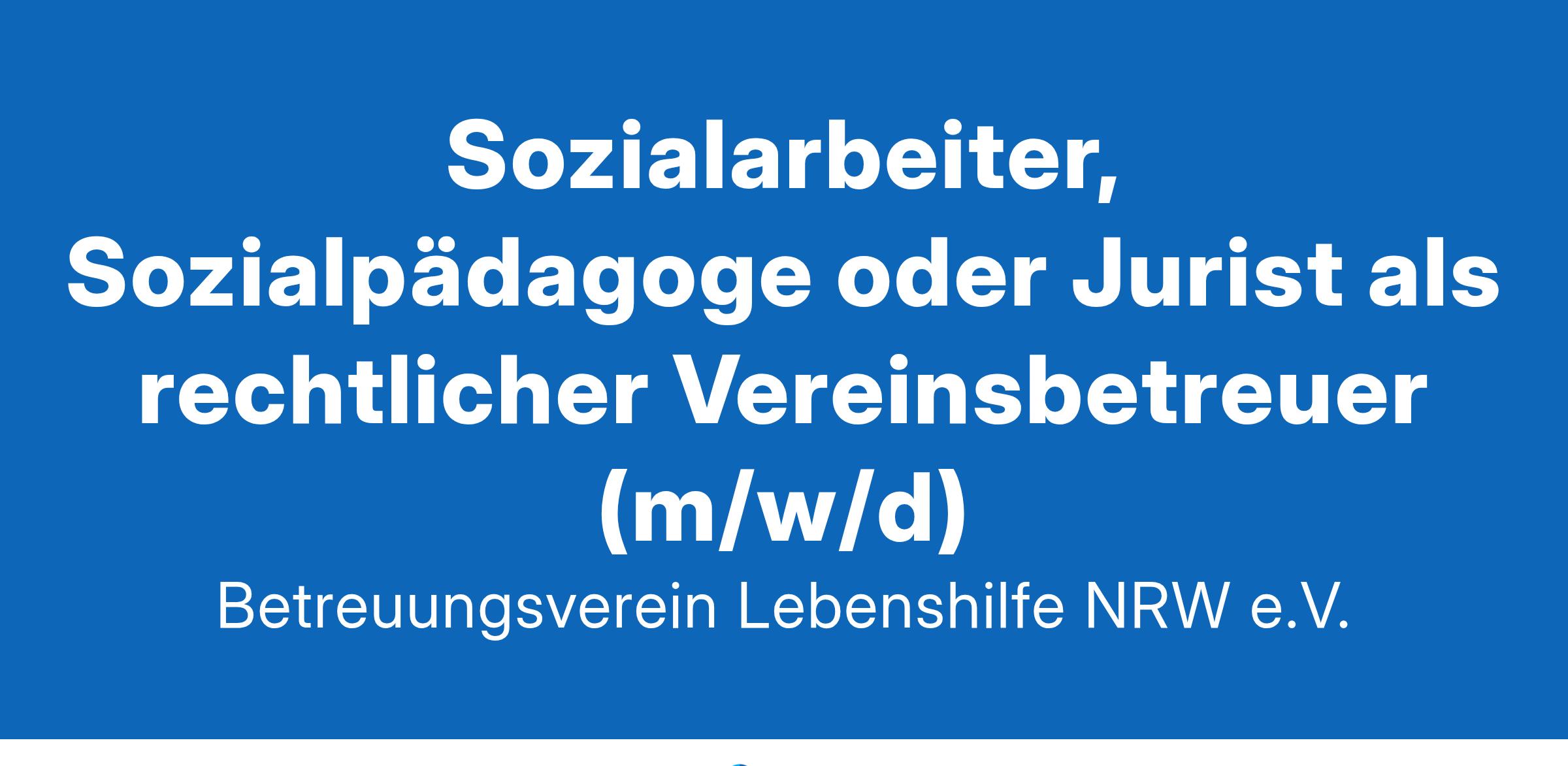 relevanten Rechtsgebiete einzuarbeiten Empathie und Verantwortungsbewusstsein Teamfähigkeit, Belastbarkeit und Zuverlässigkeit Durchsetzungsvermögen hohe Kommunikationsfähigkeit und eine gute Nähe-Distanz-Balance sehr gute Selbstorganisation Selbstreflexion gute IT-Kenntnisse wirtschaftliches Denken und Handeln Das bieten wir Ihnen:eine interessante, abwechslungsreiche und verantwortungsvolle Tätigkeit eine flexible Arbeitszeit mit der Möglichkeit des mobilen Arbeitens einen modernen Arbeitsplatz in einem kleinen, motivierten Team ein unbefristetes Arbeitsverhältnis viel Autonomie und Handlungsspielraum und kurze Entscheidungswege regelmäßige Fortbildung regelmäßige Teamsitzungen mit Fallbesprechungen Teilhabe an regelmäßiger Supervision Möglichkeit des Jobrad-Leasings zusätzliche betriebliche Krankenversicherung Interessiert?Wir freuen uns auf die Zusendung Ihrer Bewerbungsunterlagen ausschließlich bitte per Email an: bewerbungen@btv-lebenshilfe-nrw.deSollten Sie noch Fragen haben, freuen wir uns auf Ihren Anruf.Betreuungsverein Lebenshilfe NRW e.V.,