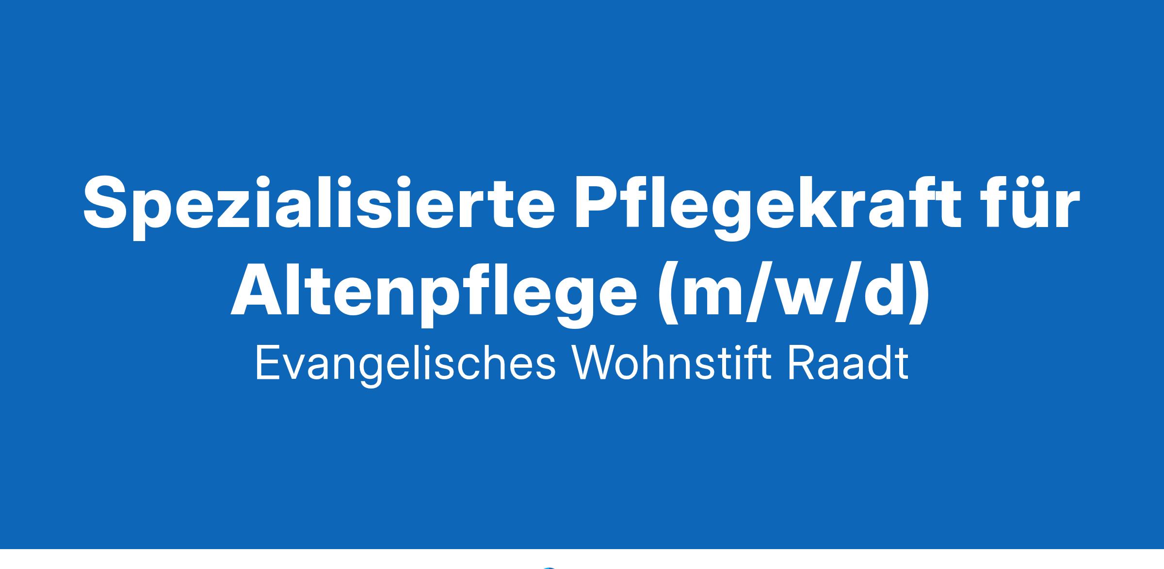 Karriere im Evangelischen Wohnstift RaadtWir begleiten unsere Bewohnerinnen und Bewohner fürsorglich und mit hoher pflegerischer Kompetenz, gehen mit Einfühlungsvermögen auf persönliche Wünsche und Bedürfnisse unserer Bewohnerinnen und Bewohner ein und schaffen gleichzeitig vielfältige Möglichkeiten für Unterhaltung und familiäre Gemeinsamkeit. Die beruflichen Leistungen unserer Kolleginnen und Kollegen sind uns ebenso wichtig wie ihre persönlichen Lebenslagen und individuellen Perspektiven. Unsere regelmäßigen Fortbildungs- und Qualifizierungsangebote tragen zur eigenen Weiterentwicklung bei. Wo es erforderlich und möglich ist, passen wir Arbeitsmodelle an individuelle Bedürfnisse an und bieten Unterstützung, damit berufliche und private Belange harmonisch zusammengeführt werden können. Jedes Mitglied unseres Teams kann sich auf eine Atmosphäre des Respekts verlassen.Zum nächstmöglichen Zeitpunkt suchen wir zur Verstärkung unseres engagierten Teams einePflegefachkraft (m⁠/⁠w⁠/⁠d) in der Altenpflegein Voll- oder Teilzeit.Das Evangelische Wohnstift Raadt ist eine moderne Einrichtung der stationären Altenhilfe. Mehr als 100 Bewohnerinnen und Bewohner mit verschiedenen Pflegegraden wohnen in drei Wohnbereichen. Seit dem Jahr 2020 befindet sich die Außerklinische Intensivpflege in einem separaten Gebäude, ein Schwerpunktversorgungsbereich für Menschen im Wachkoma und/oder mit (Heim-)Beatmung. Unsere Einrichtung zeichnet sich durch seine Verwurzelung im lokalen Umfeld, die Vielfalt der Bewohnerinnen und Bewohner und unsere gewachsene Teamkultur aus. Wir sind fest im nachbarschaftlichen Umfeld verankert. Die Angehörigen unserer Bewohnerinnen und Bewohner sind bei uns stets gern gesehen und werden aktiv in unseren Alltag eingebunden.Deine AufgabenDurchführung der individuellen GrundpflegeMitarbeit bei der psychosozialen BetreuungDurchführung der EDV-gestützten PflegedokumentationTeilnahme an Übergaben, Dienst- und TeambesprechungenDas bringst du mitExamen als Pflegefachkraft (m⁠/⁠w⁠/⁠d)Erfahrung in der AltenpflegeFreude im Umgang mit pflegebedürftigen MenschenDie Fähigkeit zur kooperativen Mitarbeit in einem kreativen Team bei klar strukturierten RahmenbedingungenGute kommunikative und soziale FähigkeitenBereitschaft zum SchichtdienstDas erwartet dich bei unsBewohnerinnen und Bewohner, die dich willkommen heißenDynamische Teammitglieder, die füreinander einspringenOffenheit für deine Ideen und AnregungenAttraktive, tarifgebundene Vergütung nach BAT-KFZusatzvergütungen wie Weihnachtsgeld, Wochenend- und FeiertagszuschlägeBetriebliche Altersvorsorge durch die kirchliche Zusatzversorgungskasse (KZVK)Aktive Gesundheitsförderung (Sport & Entspannung, Gesundheitscheck u. v. m.)Arbeitgeberfinanzierte Fortbildungen und Unterstützung in deiner beruflichen und persönlichen Weiterentwicklung, auch in unserem hauseigenen Ategris BildungsinstitutViele Mitarbeitervorteile und Rabatte (Corporate Benefits, Kultur & Musik u. v. m.)Arbeitgeberunterstütztes Fahrrad-LeasingHaben wir dein Interesse geweckt?Dann nichts wie los – klicke direkt auf den "Jetzt Bewerben"-Button und überzeuge uns von deinen Fähigkeiten!