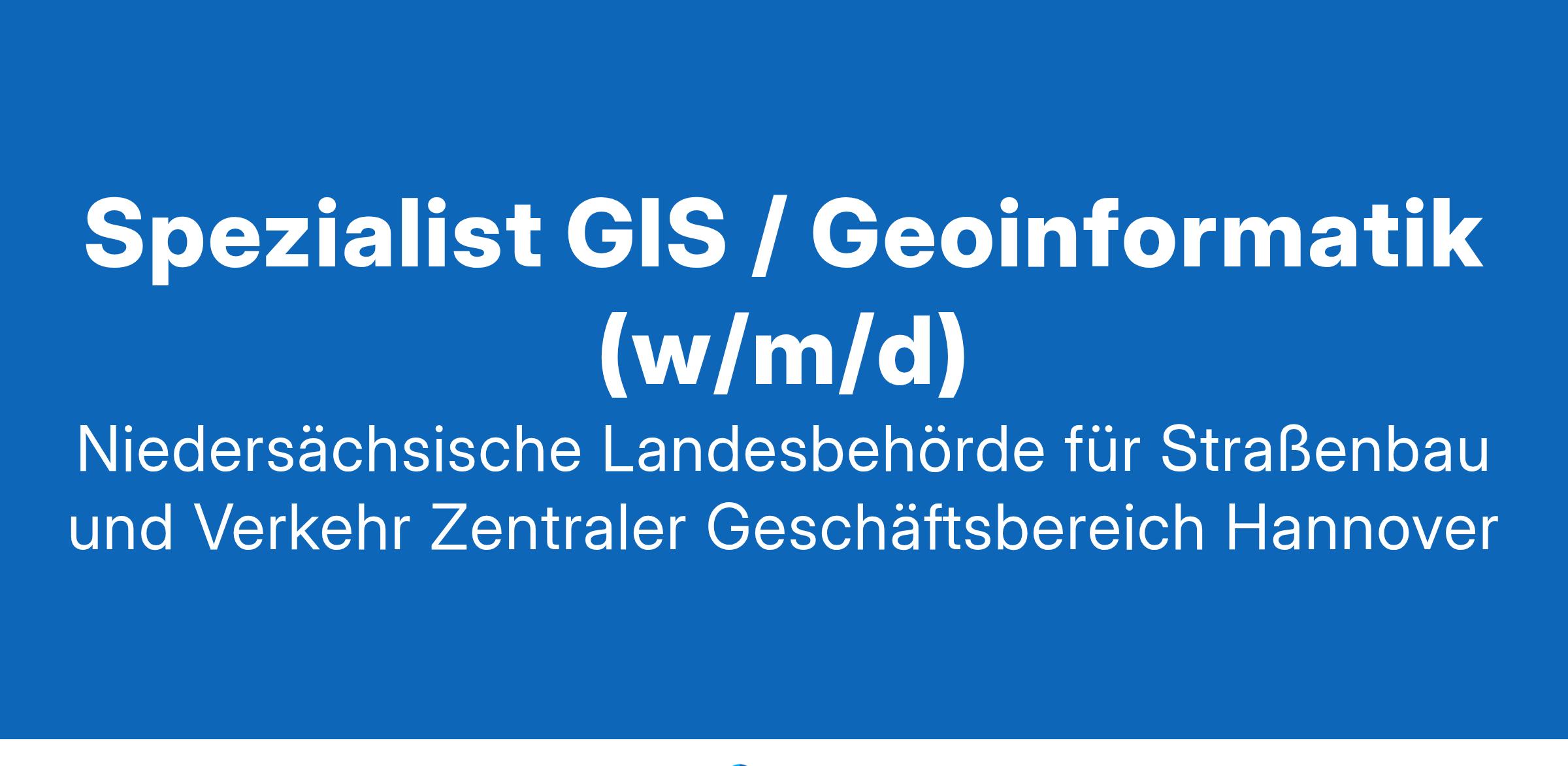 Niedersächsische Landesbehörde für Straßenbau und Verkehr Zentraler Geschäftsbereich Hannover Spezialist GIS / Geoinformatik (w/m/d) Hannover In der Niedersächsischen Landesbehörde für Straßenbau und Verkehr ist im zentralen Geschäftsbereich 2 in Hannover