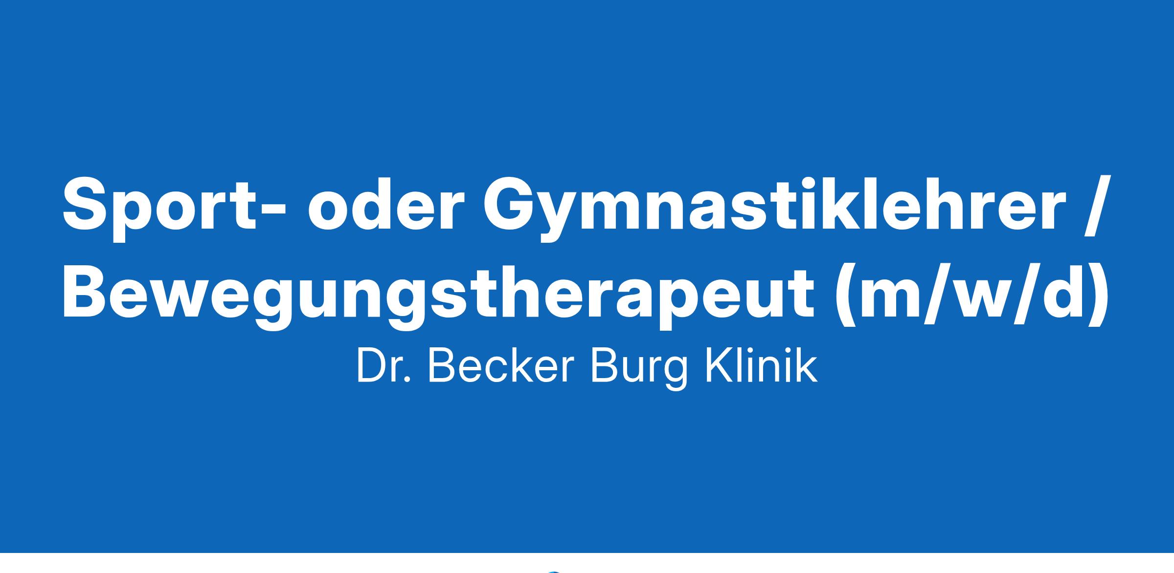 Sport- oder Gymnastiklehrer / Bewegungstherapeut (m/w/d)Jetzt bewerbenHerzlich willkommen!Warum Sie als ...Sport- oder Gymnastiklehrer / Bewegungstherapeut (m/w/d)... in der Dr. Becker Burg-Klinik, Thüringens größter Rehabilitationsklinik für Psychosomatische Medizin und Psychotherapie im Wartburgkreis, mit 228 Betten arbeiten sollten! *Ihre Aufgaben