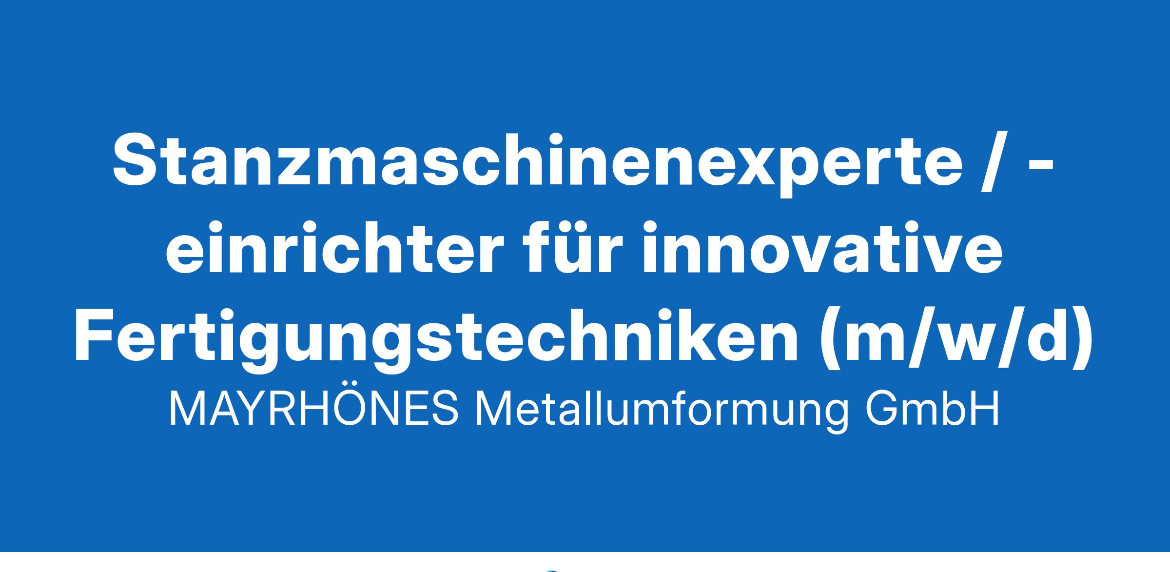 Anlagenführer Stanzerei (m/w/d)Starte mit einem der TOP Arbeitgeber im Mittelstand in die Zukunft! Seit über 45 Jahren ist die MAYRHÖNES Metallumformung GmbH im Bereich der Metallumformung tätig. Wir produzieren anspruchsvolle Produkte für nationale und internationale Industriekunden.