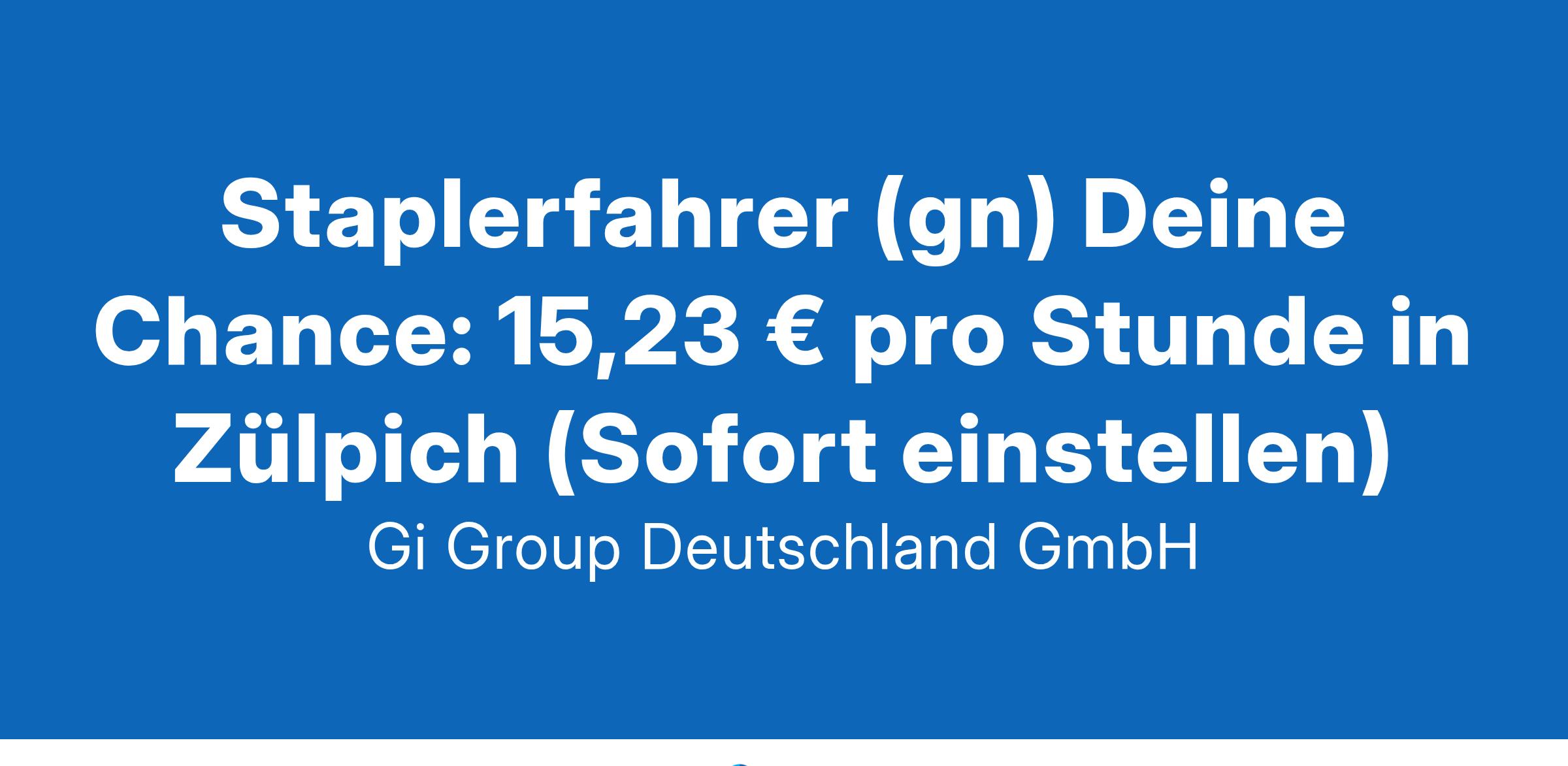 Staplerfahrer (gn) Deine Chance: 15,23 € pro Stunde in Zülpich ab sofort in Vollzeit in Zülpich Die Gi Group ist ein international agierender Personaldienstleister mit mehr als 500 Standorten in 40 Ländern. Deine Aufgaben Du bist für das Ein-, Aus- und Umlagern von Paletten zuständig Be- und Entladen von LKW sowie das Kommissionieren von Waren Einhaltung und Gewährleistung der hoher Qualitäts- und Sicherheitsstandards Dein Profil Besitz eines gültigen Staplerscheins und einschlägige Erfahrung als Staplerfahrer Bereitschaft zur Arbeit im 2-Schicht-System Gute Deutschkenntnisse in Wort und Schrift Unser Angebot Einsatz in einem renommierten Logistikunternehmen mit sehr guten Chancen auf Übernahme Kostenloses Deutschland-Ticket Attraktive Vergütung von bis zu 15,23€ die Stunde Unbefristeter Arbeitsvertrag Betreuung und Beratung durch unsere Kollegen Deine Bewerbung Für Deine Bewerbung klicke bitte einfach auf „Jetzt bewerben“. Dort kannst Du Deine Kontaktdaten eingeben sowie Deinen Lebenslauf und Deine Bewerbungsunterlagen hochladen. Du benötigst dafür nur ca. 1 Minute. Dein zuständiger Personaldisponent wird sich bei Dir schnellstmöglich melden. Gerne kannst Du uns auch Deine Bewerbungsunterlagen per E-Mail zusenden. Wir freuen uns auf Deine Bewerbung! Unsere Stellenangebote richten sich an Arbeitssuchende jeglichen Geschlechts. (gn) = geschlechtsneutral. Gi Group Recruiting Team