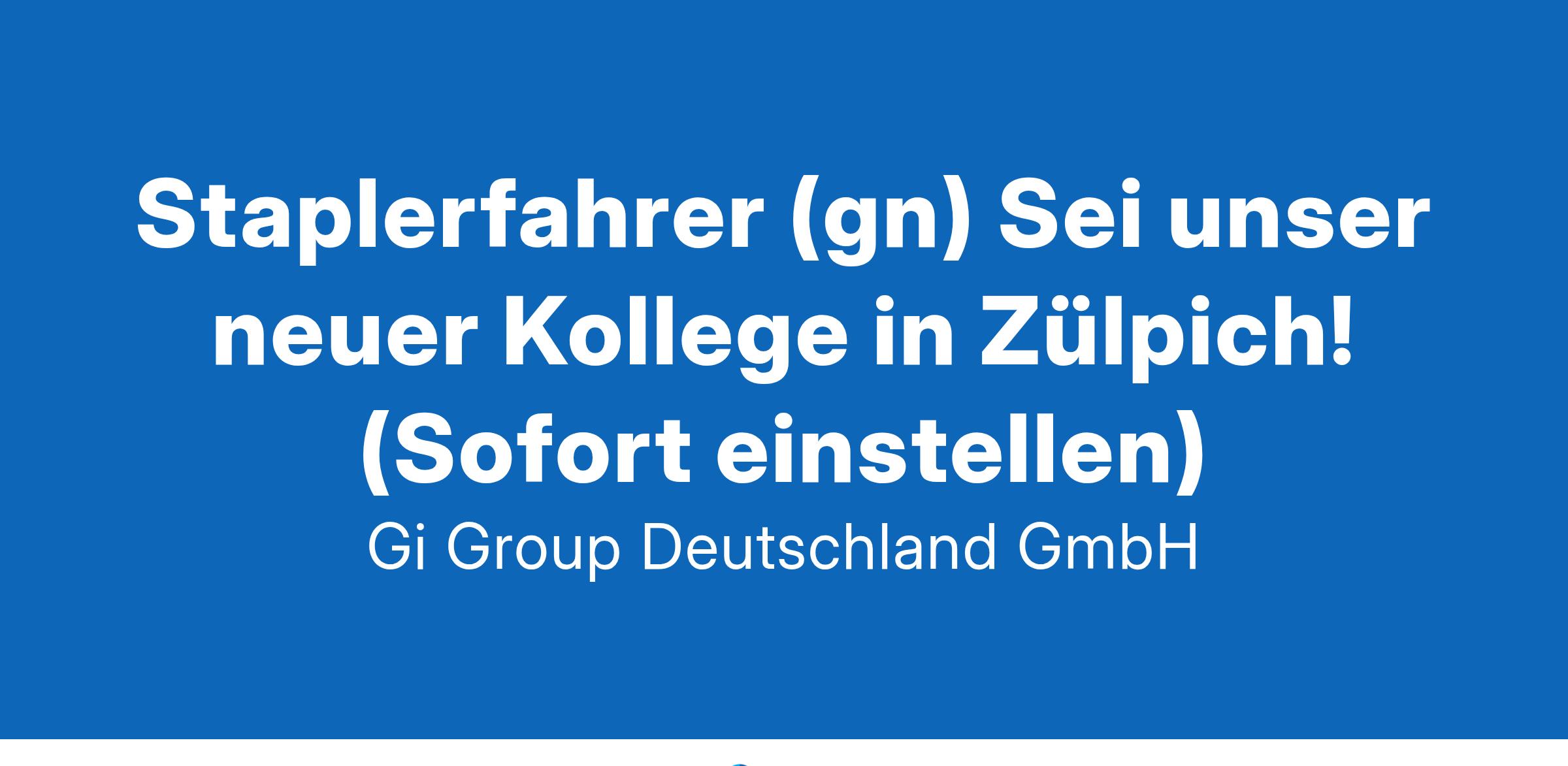 Staplerfahrer (gn) Sei unser neuer Kollege in Zülpich! ab sofort in Vollzeit in Zülpich Die Gi Group ist ein international agierender Personaldienstleister mit mehr als 500 Standorten in 40 Ländern. Deine Aufgaben Du bist für das Ein-, Aus- und Umlagern von Paletten zuständig Be- und Entladen von LKW sowie das Kommissionieren von Waren Einhaltung und Gewährleistung der hoher Qualitäts- und Sicherheitsstandards Dein Profil Besitz eines gültigen Staplerscheins und einschlägige Erfahrung als Staplerfahrer Bereitschaft zur Arbeit im 2-Schicht-System Gute Deutschkenntnisse in Wort und Schrift Unser Angebot Einsatz in einem renommierten Logistikunternehmen mit sehr guten Chancen auf Übernahme Kostenloses Deutschland-Ticket Attraktive Vergütung von bis zu 15,23€ die Stunde Unbefristeter Arbeitsvertrag Betreuung und Beratung durch unsere Kollegen Deine Bewerbung Für Deine Bewerbung klicke bitte einfach auf „Jetzt bewerben“. Dort kannst Du Deine Kontaktdaten eingeben sowie Deinen Lebenslauf und Deine Bewerbungsunterlagen hochladen. Du benötigst dafür nur ca. 1 Minute. Dein zuständiger Personaldisponent wird sich bei Dir schnellstmöglich melden. Gerne kannst Du uns auch Deine Bewerbungsunterlagen per E-Mail zusenden. Wir freuen uns auf Deine Bewerbung! Unsere Stellenangebote richten sich an Arbeitssuchende jeglichen Geschlechts. (gn) = geschlechtsneutral. Gi Group Recruiting Team
