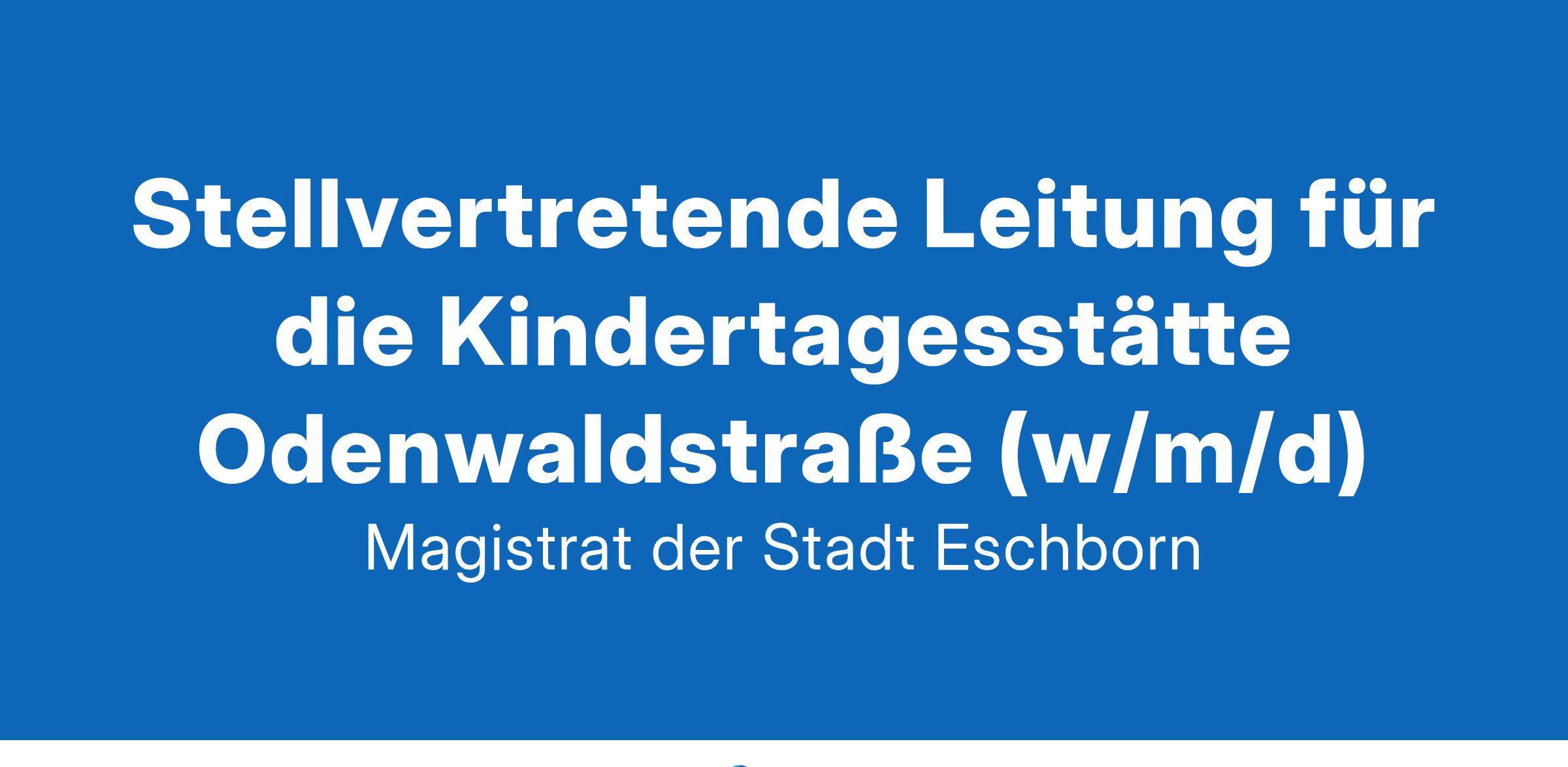 Stadt Eschborn Eschborn ist eine Stadt in der pulsierenden Region Rhein-Main, die über eine hohe Lebensqualität verfügt. Etwa 600 Kollegen (w/m/d) gestalten bei der als „Familienfreundlicher und gesunder Arbeitgeber“ anerkannten Stadtverwaltung die Zukunft unserer Stadt mit. Werden auch Sie ein Teil unseres Teams: Wir suchen zum nächstmöglichen Zeitpunkt eine Stellvertretende Leitung für die Kindertagesstätte Odenwaldstraße (w/m/d) unbefristet in Vollzeit (39,00 Stunden/Woche); je nach Qualifikation sowie in Abhängigkeit von den Belegungszahlen der Einrichtung derzeit EG S 13 TVöD/VKA In unserem Internetauftritt unter www.eschborn.de/rathaus/ verwaltung/stellenausschreibungen sind detaillierte Informationen, auch zu den verschiedenen Bewerbungsmöglichkeiten, hinterlegt. Zudem finden Sie dort die vielfältig von uns freiwillig angebotenen (Sozial-)Leistungen aufgeführt. Von Bewerbungen per E-Mail wollen Sie bitte