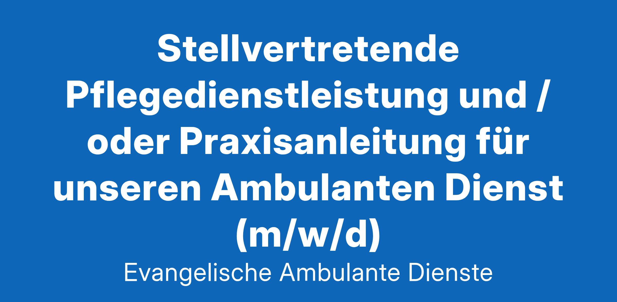 Die Evangelische Wohltätigkeitsstiftung in Regensburg (EWR) sucht für ihre Ambulanten Dienste zum nächstmöglichen Zeitpunkt in Voll- oder Teilzeit eine stellvertretende Pflegedienstleistung und / oder Praxisanleitung für unseren Ambulanten Dienst (m/w/d) Der Ambulante Dienst ist am Zentrum für Altersmedizin (Paul-Gerhardt-Haus) auf dem Campus der Barmherzigen Brüder, Prüfeninger Straße, stationiert. Derzeit pflegen und betreuen wir rund 100 Kunden im Stadtgebiet Regensburg. Fachgerechte Pflege und das Wohlbefinden der älteren und pflegebedürftigen Menschen in ihrem häuslichen Umfeld liegen uns am Herzen. Sie sind motiviert und sind Pflegefachkraft mit Berufserfahrung. Sie wollen für unsere Kunden und das Team ihr Bestes geben. Sie lieben es, zu organisieren und im Team zu kommunizieren. Sie verfügen über Einfühlungsvermögen und verstehen es, verantwortungsvoll zu handeln. Ihr Herz schlägt für die Pflege, aber auch Büro- und PC-Arbeiten gehen ihnen leicht von der Hand. Ihre Aufgaben sind Unterstützung und Vertretung der Pflegedienstleitung Sicherstellung einer qualitativ hochwertigen Pflege und Betreuung unserer Kunden Mitwirkung bei der Erstellung und Umsetzung von Pflegekonzepten- und standards Überwachung und Dokumentation der Pflegeprozesse Führung und Anleitung des Pflegepersonals Durchführung von Pflegvisiten und Qualitätskontrollen Wir bieten Ihnen Leistungsgerechte Vergütung nach dem TVöD Attraktive Altersversorgung, jährliche Sonderzuwendung und Leistungsprämie gezielte Fort- und Weiterbildungsmöglichkeiten krisensicher Arbeitsplatz eine angenehme Arbeitsatmosphäre in einem aufgeschlossenem, engagierten und kompetentem Team. Schwerbehinderte werden bei im Wesentlichen gleicher Eignung bevorzugt berücksichtigt. Die EWR fördert aktiv die Gleichstellung aller Mitarbeiter (m/w/d). Ihre aussagekräftigen Bewerbungsunterlagen senden Sie bitte an .