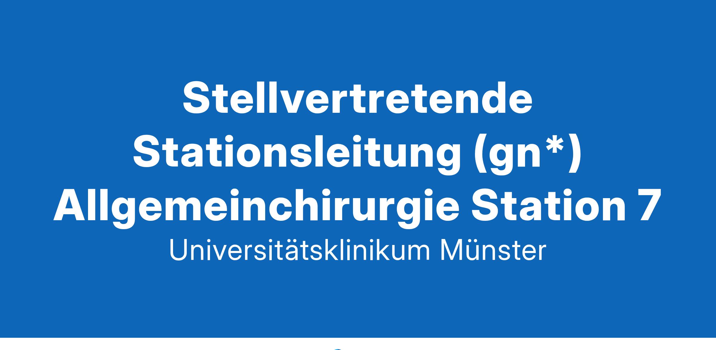 Stellvertretende Stationsleitung (gn*) Allgemeinchirurgie Station 7 Unbefristet | In Vollzeit | Vergütung nach TV-L | Klinik für Allgemein-, Viszeral- und Transplantationschirurgie | Station 7 | Kennziffer 10246 Wir sind das UKM. Wir haben einen klaren gesellschaftlichen Auftrag und mit der Verbindung von Krankenversorgung, Forschung und Lehre eine besondere gesellschaftliche Verantwortung. Damit wir unserem hohen Anspruch tagtäglich gerecht werden, freuen wir uns auf Deine fachliche Kompetenz in der Allgemein-, Viszeral- und Transplantationschirurgie. Werde Teil unseres innovativen Teams und mach Dich mit uns auf den Weg, Magnet Krankenhaus zu werden – am besten mit DIR! Als Mitglied des Leitungsteams stellst Du die Organisation der Patientenversorgung sicher. Du hast großes Interesse an aktiver Mitgestaltung von strukturierten Prozessen und der Zusammenarbeit und Entwicklung in einem multiprofessionellen Team? Dann nutze gern die Möglichkeit einer unverbindlichen Hospitation im Team der Unfallchirurgie, um uns näher kennenzulernen! Begleite aktiv das MACH-2-Projekt mit den drei Teilprojekten Personal-Lebenszyklus, Patientenpfad und Kommunikation. Ziel ist es, die Zufriedenheit und Identifikation der Mitarbeitenden mit dem UKM zu verbessern, ein interdisziplinäres Team zu schaffen, das die Versorgung von Patienten am UKM gemeinsam optimiert, und auch eine Kommunikation zu schaffen, in der Mitarbeitende offen, auf Augenhöhe und vertrauensvoll miteinander kommunizieren. Die IpUK steht für ein Interprofessionelles Unterrichtskonzept und ist eine Stationseinheit der Allgemeinchirurgie, in der PJler und Auszubildende der Pflege im Tandem, eigenverantwortlich eine Patientengruppe betreuen. Das gemeinsame Lernen, im Sinne des Magnetgedankens als interprofessionelles Team, die Förderung von kommunikativen und interprofessionellen Kompetenzen und vor allem die Gestaltung von selbstgesteuerten, interprofessionellen Lern- und Entscheidungsprozessen steht in diesem Unterrichtskonzept im Mittelpunkt. VERANTWORTUNGSVOLLE AUFGABEN: Operative Personalführung und Entwicklung Mitgestaltung der Zusammenarbeit und Koordination von Abläufen Aktive Pflege von Schnittstellen Mitwirkung bei der Terminierung und Koordination in der Patientenversorgung Kontinuierliche Weiterentwicklung von zukunftsorientierten, strategischen Prozessen und Entwicklungen Begleite uns auf dem Weg, Magnetkrankenhaus zu werden und exzellente Pflege zu fördern Weiterentwickeln des interprofessionellen Lernens am UKM (IpUK) Begleitung und Weiterentwicklung des MACH-2-Projektes ANFORDERUNGEN: Du hast ein pflegebezogenes Studium, oder die Bereitschaft dieses zu absolvieren Führungserfahrung in stellvertretender oder leitender Position Mitbringen von sozialer und fachlicher Kompetenz, um in einem interprofessionellen Team arbeiten zu können WIR BIETEN: Die persönliche Förderung durch eine konzeptionelle und begleitete Einarbeitung Ein kollegiales Team, das Herausforderungen gemeinsam und professionell meistert Ein umfangreiches Fort- und Weiterbildungsangebot und E-Learning-Plattform Eine kostenfreie, kurzfristige Kinderbetreuung in persönlichen Notfallsituationen sowie eine Ferienbetreuung Zahlreiche Angebote im Rahmen des betrieblichen Gesundheitsmanagements in den Bereichen Bewegung, Entspannung und Ernährung Mithilfe bei der Wohnraumbeschaffung Weitere Infos zum Projekt findest Du hier: MACH-2-Projekt Rückfragen an: Pflegedienstleitung, Susanne Schubert, T 0251 83-58644 Jetzt bis zum 18.02.2025. BESTE BEDINGUNGEN: Abwechslungsreich E-Learning-Plattform Konzeptionelle und begleitete Einarbeitung Magnet Vieles mehr ... Abwechslungsreich E-Learning-Plattform Konzeptionelle und begleitete Einarbeitung Magnet Weitere Vorteile (*gn=geschlechtsneutral) Das UKM unterstützt die Vereinbarkeit von Beruf und Familie und ist daher als familienbewusstes Unternehmen zertifiziert. Es besteht grundsätzlich die Möglichkeit der Teilzeitbeschäftigung. Im Rahmen der gesetzlichen Vorschriften werden Frauen sowie Schwerbehinderte bei gleicher Eignung bevorzugt berücksichtigt. Aufgrund der gesetzlichen Vorgaben gemäß Masernschutzgesetz ist eine Tätigkeit bei uns nur mit vollständigem Impfschutz gegen Masern möglich. Universitätsklinikum Münster Albert-Schweitzer-Campus 1, Gebäude D5 48149 Münster www.ukm.de