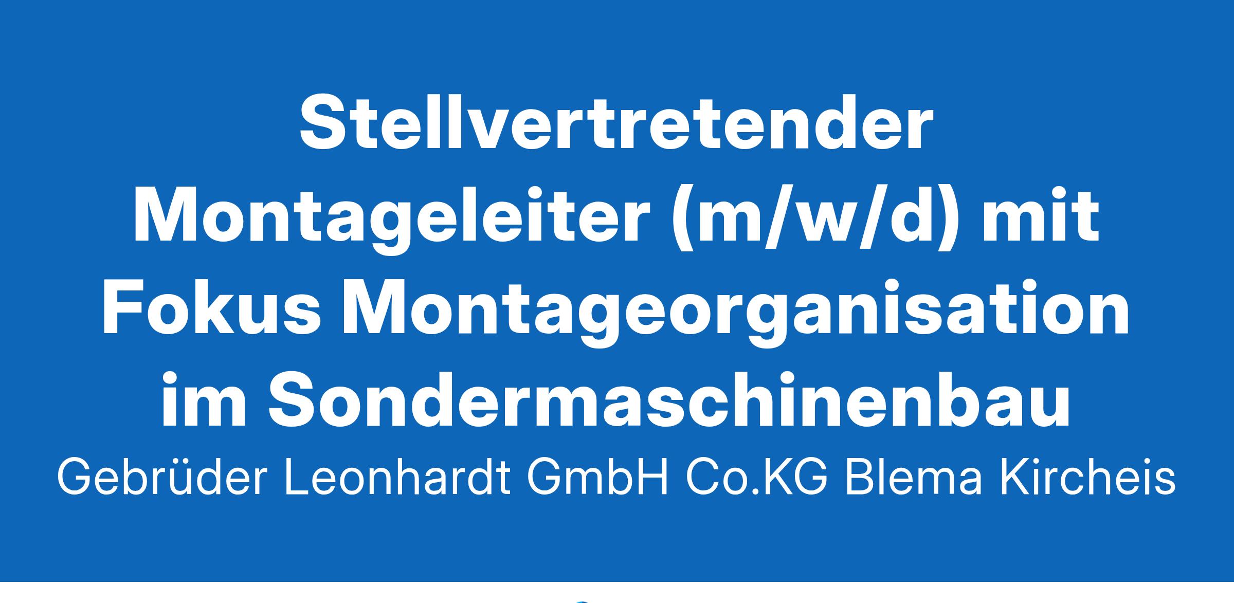 Stellvertretender Montageleiter (m/w/d) mit Fokus Montageorganisation im Sondermaschinenbau Vollzeit Au-Ost 5, 72072, Tübingen Mit Leitungsfunktion Zukunft gestalten in Tübingen Seit über 150 Jahren sind wir bei BLEMA Innovationstreiber für die Herstellung von Verpackungsmaschinen, weil wir mit viel Leidenschaft und Präzision das Denkbare möglich machen. Ob intern im Team oder mit unseren internationalen Kunden, starke Beziehungen stehen für unser inhabergeführtes Familienunternehmen an oberster Stelle. Wir halten, was wir versprechen, stehen für herausragende Qualität und Verarbeitung und liefern mit unseren Anlagen einen wesentlichen Beitrag für eine Gesellschaft, in der nachhaltige Verpackungen zum neuen Standard werden. Ihre Aufgaben Als stellvertretender Montageleiter (m/w/d) an unserem Standort in Tübingen koordinieren und optimieren Sie unsere Montageabläufe und unterstützen stellvertretend bei der Mitarbeiterführung. Konkret heißt das: Sie erstellen Termin- sowie Kapazitätsplanungen für eine effiziente Abwicklung unserer Montagen, Inbetriebnahmen und Serviceeinsätze. Sie reporten den Montagefortschritt fortlaufend und passen die Planung bei Bedarf dynamisch an die sich verändernden Rahmenbedingungen an. Sie arbeiten kontinuierlich an der (schnittstellenübergreifenden) Optimierung unsere Prozesse. Sie unterstützen unseren Montageleiter stellvertretend bei der Mitarbeiterführung von derzeit 20 Mitarbeitenden. Ihr Profil Sie sind versierter Techniker (m/w/d) oder Meister (m/w/d) und bringen (umfangreiche) Erfahrung in der Montageorganisation, idealerweise im Sondermaschinenbau mit. Termine und Kapazitäten effizient zu planen, gehört zu Ihren Stärken, ebenso ein ausgeprägtes Verständnis für Prozesse und deren Optimierung sowie der Umgang mit ERP Systemen und den gängigen Office Anwendungen. Auf sich verändernde Anforderungen reagieren Sie schnell und flexibel und behalten auch in Situationen mit komplexen Abhängigkeiten einen kühlen Kopf sowie den Bick für das Wesentliche. Ergänzend zu Ihrer fachlichen Tätigkeit freuen Sie sich über Personalverantwortung in Stellvertretung. Abgerundet wird Ihr Profil durch Ihr souveränes Auftreten sowie Ihre wertschätzende und zugleich klare Kommunikation, was Sie in Kombination mit Ihrer Begeisterung für unsere produktnahen und vielfältigen Maschinen zur idealen Besetzung für diese Stelle macht. Unser Beitrag Eine sichere Anstellung in einem inhabergeführten Familienunternehmen mit starkem Teamzusammenhalt und langjährigen Kundenbeziehungen. Jede Menge Vertrauen in Sie und Ihre Tätigkeit in einem Umfeld, das Innnovation und ergebnisorientiertes Arbeiten möglich macht. Eine attraktive Vergütung inkl. 13. Monatsgehalt als Weihnachtsgeld, gleitende Arbeitszeit sowie betriebliche Altersvorsorge mit AG-Zuschuss. Individuelle Fort- und Weiterbildungsmöglichkeiten sowie die Nutzung moderner Arbeitsmittel, die Sie bei Ihrer Tätigkeit bestmöglich unterstützen. Und last but not least die Möglichkeit, bei der Transformation zu einer nachhaltigen Verpackungsindustrie mitzuwirken. Kontakt Genau das, wonach Sie gesucht haben? Wir freuen uns darauf, Sie kennenzulernen. Bitte senden Sie uns Ihre vollständigen Bewerbungsunterlagen mit Angabe Ihrer Gehaltsvorstellungen an unsere zentrale Personalabteilung: Gebrüder Leonhardt GmbH & Co. KG Blema Kircheis Erdmann-Kircheis-Str. 13-15 08280 Aue/Germany Tel.: 03771 278 310 E-Mail: personal@blema.de www.blema.de Ein Unternehmen der Leonhardt Group. Diesen Job teilen Impressum | Datenschutzerklärung