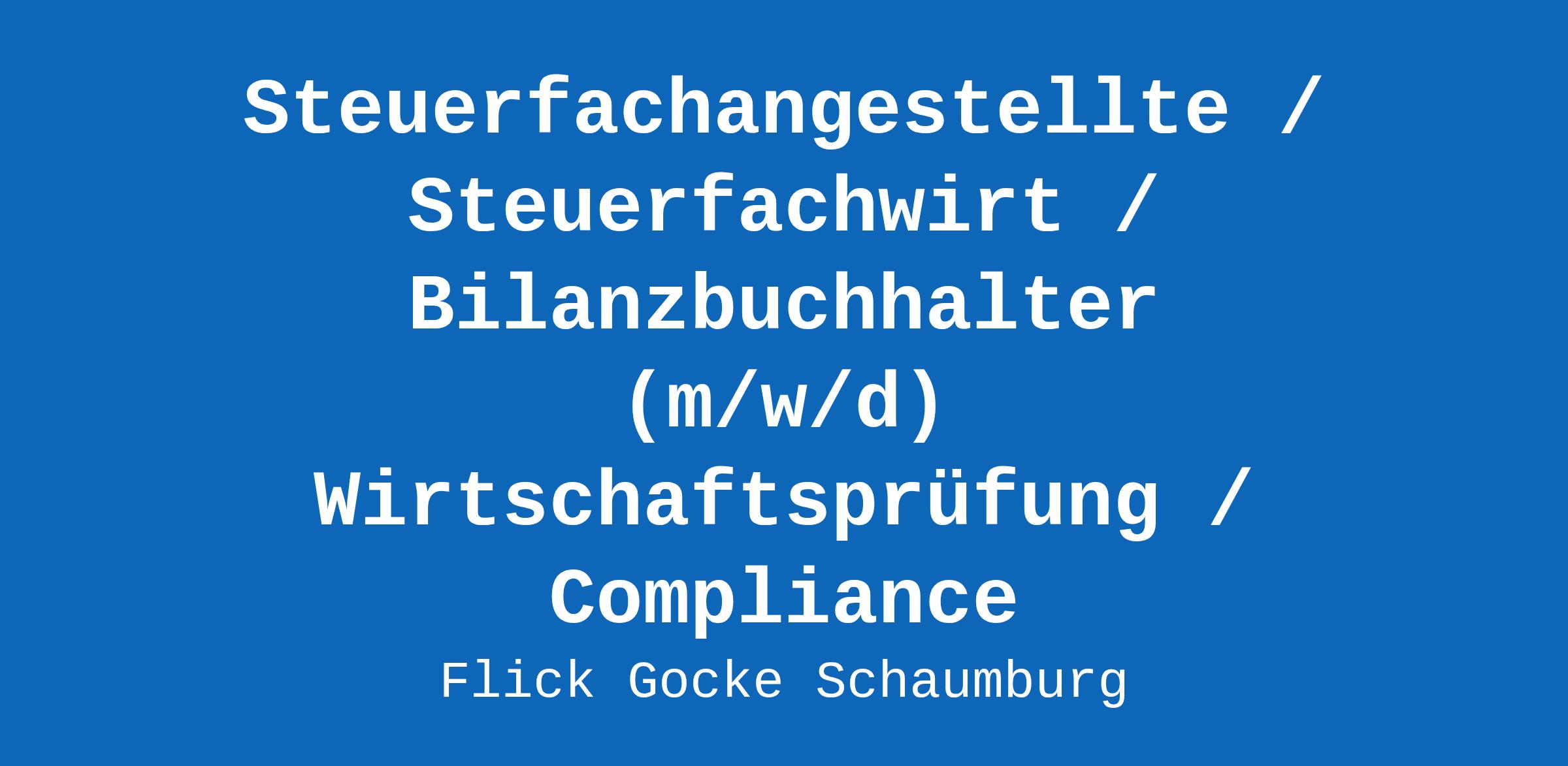 Flick Gocke Schaumburg steht mit seinen mehr als 950 Mitarbeitenden seit über 50 Jahren für herausragende steuerzentrierte Rechtsberatung, was uns zu einer der führenden Wirtschaftskanzleien Deutschlands macht. Mit unserer interdisziplinären Verbindung von Steuer- und Wirtschaftsrecht und unserem... Compliance;Engagement;Datev;Führung;Detailgenauigkeit;Anlagenbuchhaltung;Externe Revision;Buchhaltung Original Stellenanzeige auf StepStone.de – Jetzt Jobagent bei StepStone einrichten und Traumjob finden! https://bit.ly/2KOagYD Mehr Informationen zu Arbeitgebern, Gehaltsdaten und Karrieretipps finden Sie auf StepStone.de
