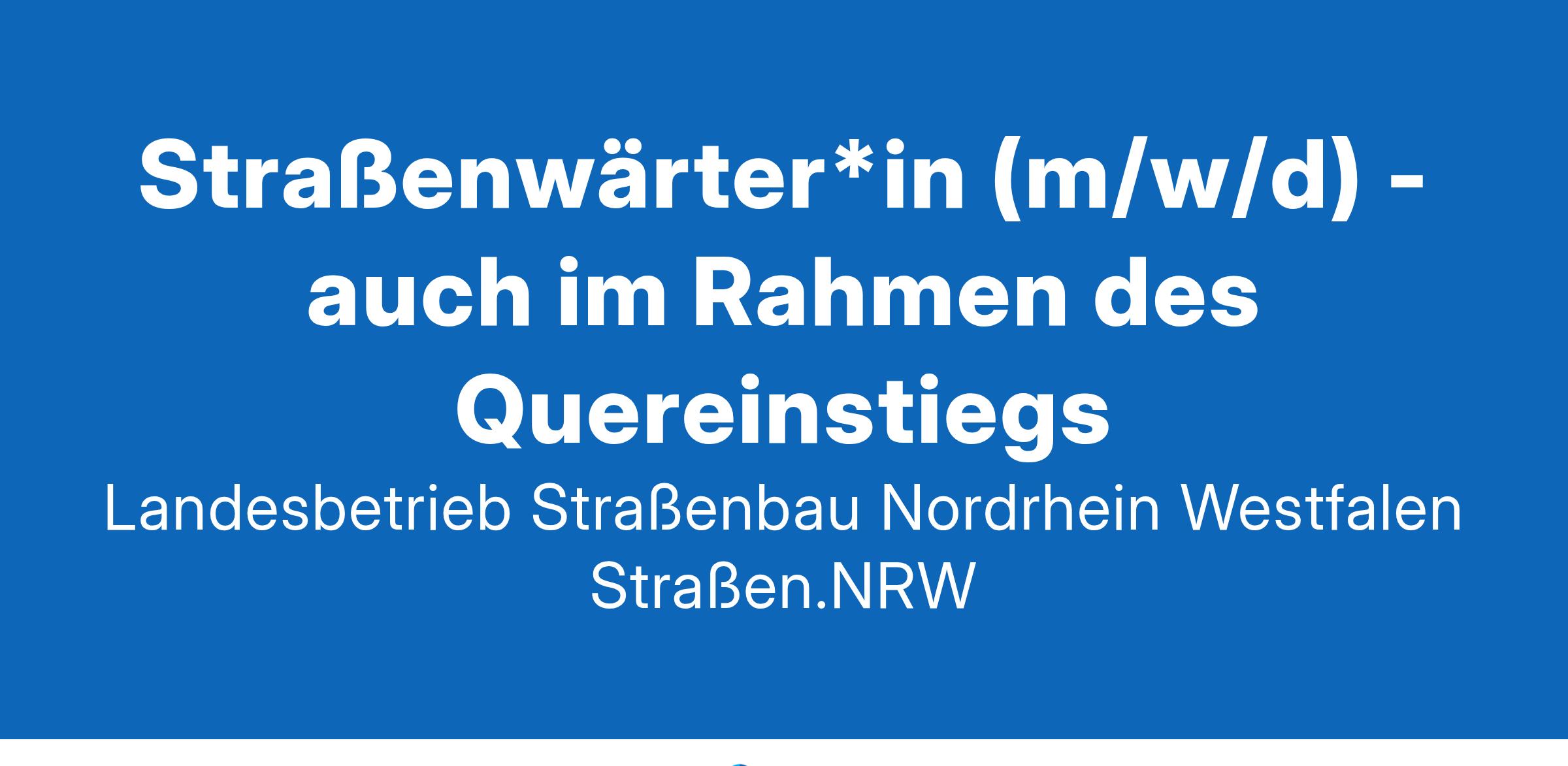 Der Landesbetrieb Straßenbau Nordrhein-Westfalen (Straßen.NRW) sucht zum nächstmöglichen Zeitpunkt für den Standort Region I NL Ostwestfalen-Lippe, Dienstort Halle (Westfalen) mit Einsatzort SM Halle in Vollzeit/ Teilzeit eine*n Straßenwärter*in (m/w/d) - auch im Rahmen des Quereinstiegs.