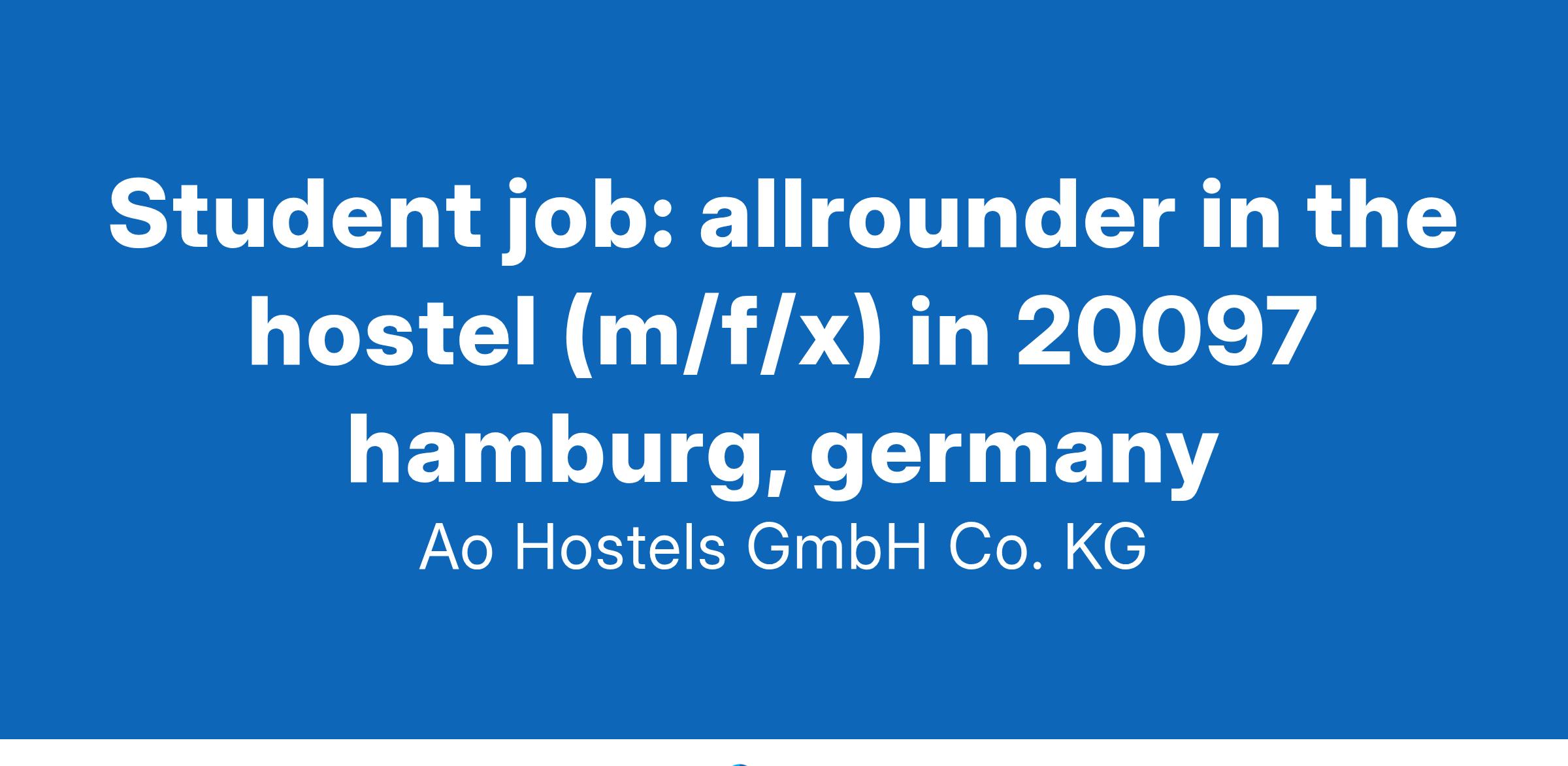 Student Job: Allrounder in the Hostel (m/f/x)as of now - part-time - in 20097 Hamburg, GermanyAre you looking for a permanent, part-time job? Perfect! That's exactly what we offer! To support our team at the a&o Hostel Hamburg City we are looking for YOU! A hardworking and independent Student for our reception and restaurant service (m/f/x).We are looking for enrolled students, working students, temporary student workers, university students and technical college students who enjoy a part-time job in the hostel.OUR OFFERSalary: 12,82€/hour + night supplement75% discount on private overnight stays in all a&o hostelsFlexible shift scheduling according to your availabilityattractive corporate benefits such as discounted leisure activities and eventssubsidized language coursessupport for your further education in the form of various trainingsMental Health: We offer you free and anonymous mental health coaching from our independent partner “ Likeminded”, who will support you with professional, private and health-related challengesWe work in jeans and a&o polo shirt instead of stiff suits or uniformsOf course we provide drinks, fruit and vegetables on a daily basis – and as hostel staff you can join your team for the warm meals served at the buffetYOUR JOBAs allround employee, you are really an all-rounder: you work flexibly in different shifts like reception, breakfast, restaurant, bar and general service, and filling in for those services is not a problem for you.The reception desk/ bar area will be your primary field of responsibility – this meansYou will be responsible for the Check-In and Check-Out of our guests behind the reception desk or in the lobby as a guest relation officerTo ensure all our guests enjoy their stay at a&o, you will cater to their needs and answer their questionsAt the bar your job is to serve hot and cold drinks and snacks, as well as to prepare cocktailsDuring restaurant-shifts, you are responsible forThe timely preparation of breakfast-, lunch- or dinner-buffetEnsuring that our guest are satisfied and that hygiene-standards are always keptYOUR PROFILEYou are officially enrolled at university and have a valid enrolment certificateYou enjoy dealing with guests - and you show it, no matter what time of day or night it isYou are able to work independently, are highly committed and a team playerYour German and English skills are on B2 level – of course we are happy for every additional language you are able to speakWe are very happy to receive your application (resume, cover letter, copy of your enrollement certificate, desired salary, earliest possibly starting-date).Apply now!Stelio Filippiadis General ManagerMore about a&o hostels: As Europe's largest Hostel chain a&o is simple, diverse and always with a smile. We push our mission "everyone can travel" through affordable prices and constant growth. By 2025, the company wants to be the first European hostel chain to be CO2 net zero - reducing its own ecological footprint to a minimum and offsetting the rest. Since its foundation, a&o Hostels has seen itself as an employer whose teams are formed regardless of origin, gender, sexual orientation, religion or ethnicity.