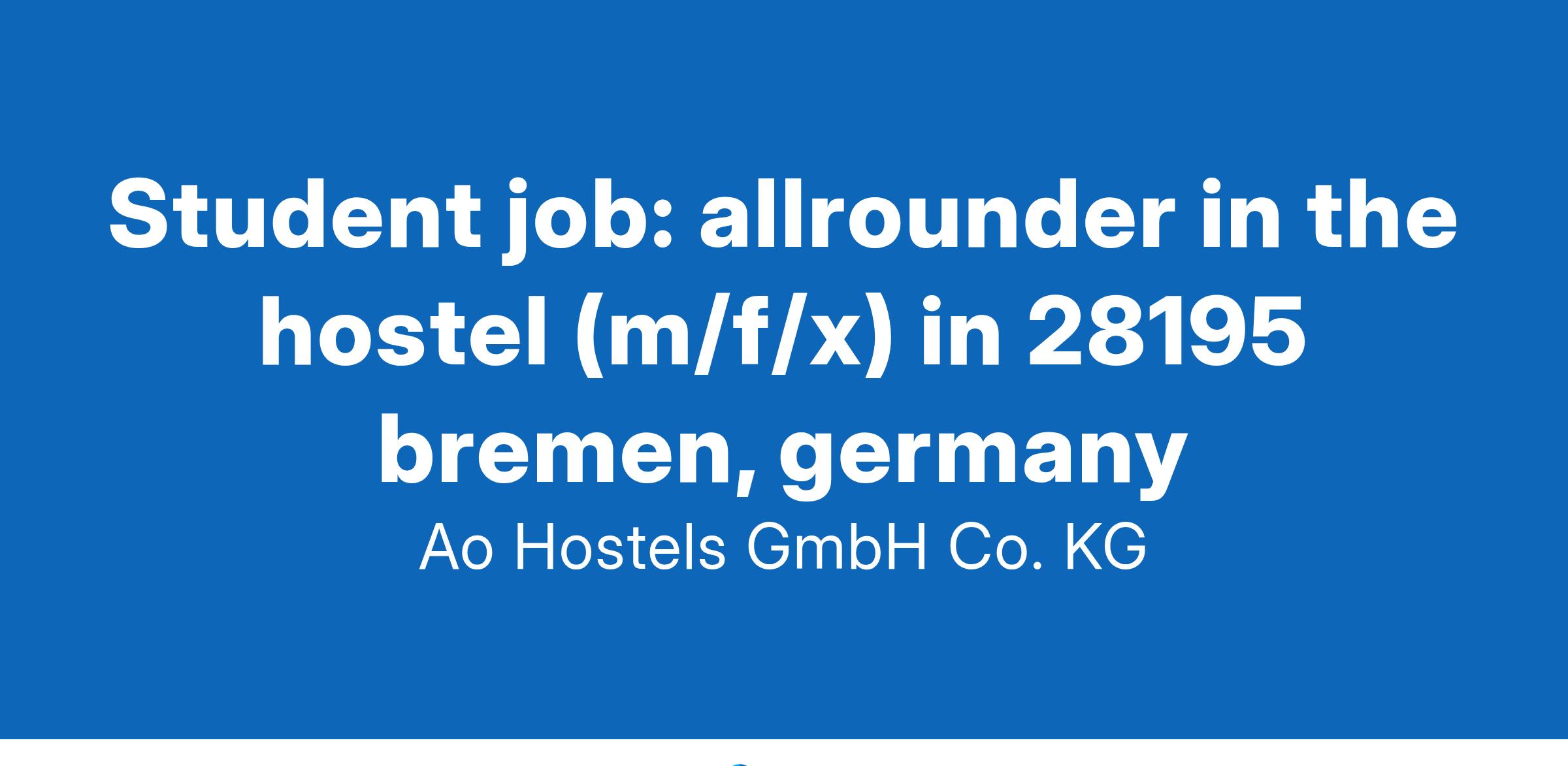 Student job: Allrounder in the Hostel (m/f/x)as of now - full-time / part-time - in 28195 Bremen, GermanyAre you looking for a permanent, part-time job? Perfect! That's exactly what we offer! To support our team at the a&o Hostel Bremen Hbf we are looking for YOU! A hardworking and independent Student (m/f/x) for our reception and restaurant service.We are looking for enrolled students, working students, temporary student workers, university students and technical college students who enjoy a part-time job with guest contact and would therefore like to work in the hostel.OUR OFFERSalary: 12,82€/hour + night supplement75% discount on private overnight stays in all a&o hostelsFlexible shift scheduling according to your availabilityattractive corporate benefits such as discounted leisure activities and eventssubsidized language coursessupport for your further education in the form of various trainingsMental Health: We offer you free and anonymous mental health coaching from our independent partner “ Likeminded”, who will support you with professional, private and health-related challengesWe work in jeans and a&o polo shirt instead of stiff suits or uniformsOf course we provide drinks, fruit and vegetables on a daily basis – and as hostel staff you can join your team for the warm meals served at the buffetYOUR JOBAs allround employee, you are really an all-rounder: you work flexibly in different shifts like reception, breakfast, restaurant, bar and general service, and filling in for those services is not a problem for you.The reception desk/ bar area will be your primary field of responsibility – this meansYou will be responsible for the Check-In and Check-Out of our guests behind the reception desk or in the lobby as a guest relation officerTo ensure all our guests enjoy their stay at a&o, you will cater to their needs and answer their questionsAt the bar your job is to serve hot and cold drinks and snacks, as well as to prepare cocktailsDuring restaurant-shifts, you are responsible forThe timely preparation of breakfast-, lunch- or dinner-buffetEnsuring that our guest are satisfied and that hygiene-standards are always keptYOUR PROFILEYou are officially enrolled at university and have a valid enrolment certificateThe interaction in our guests is fun for you, you like to be a hostIndependent way of working; high commitment and teamworkYou know your city well and know how to give our guests cool tipsYou love interacting with our guests, no matter the time of day or nightGood knowledge of German and EnglishWe are very happy to receive your application (resume, cover letter, desired salary, earliest possible starting-date).Apply now!Isabell Milian General ManagerMore about a&o hostels: As Europe's largest Hostel chain a&o is simple, diverse and always with a smile. We push our mission "everyone can travel" through affordable prices and constant growth. By 2025, the company wants to be the first European hostel chain to be CO2 net zero - reducing its own ecological footprint to a minimum and offsetting the rest. Since its foundation, a&o Hostels has seen itself as an employer whose teams are formed regardless of origin, gender, sexual orientation, religion or ethnicity.