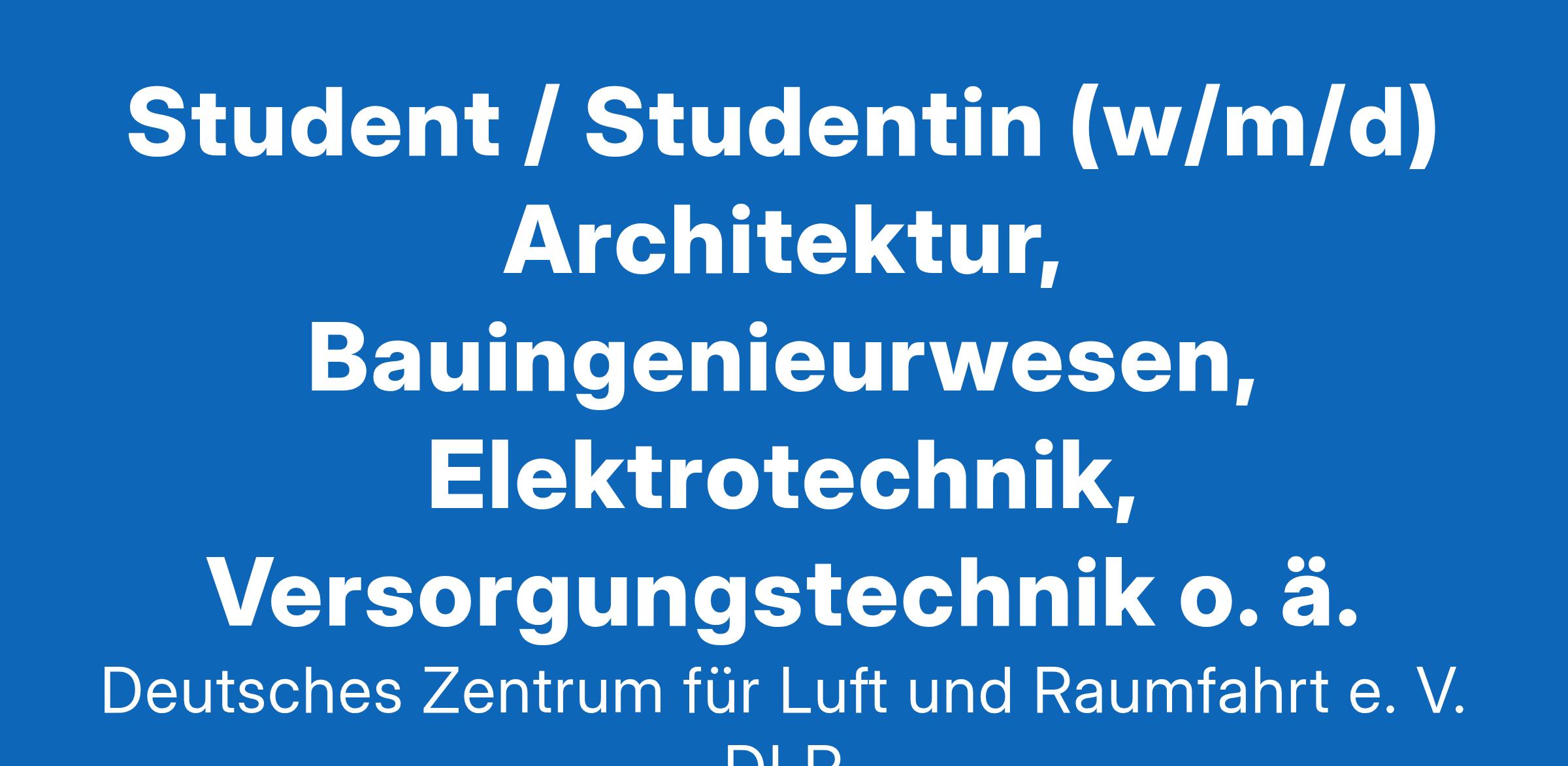 Steigen Sie ein in die faszinierende Welt des Deutschen Zentrums für Luft- und Raumfahrt (DLR), um mit Forschung und Innovation die Zukunft mitzugestalten! Mit dem Know-how und der Neugier unserer 11.000 Mitarbeitenden aus 100 Nationen sowie unserer einzigartigen Infrastruktur, bieten wir ein spannendes und inspirierendes Arbeitsumfeld. Gemeinsam entwickeln wir nachhaltige Technologien und tragen so zur Lösung globaler Herausforderungen bei. Möchten Sie diese große Zukunftsaufgabe mit uns zusammen angehen? Dann ist Ihr Platz bei uns!Für unsere Einrichtung der Fachgebietsbeauftragen der Technischen Infrastruktur in Köln suchen wir eine/nStudent/in (w/m/d) Architektur, Bauingenieurwesen, Elektrotechnik, Versorgungstechnik o. ä.Unterstützung bei allgemeinen administrativen Tätigkeiten und fachlichen Themen (ca. 6-8 Stunden/Woche)Das erwartet Sie:Sie möchten neben Ihrem Studium im Bereich Facility Management arbeiten? Dann sind Sie im Team der Fachgebietsbeauftragten genau richtig. Wir sehen uns als Service-Einrichtung und beraten in Projekten, entwicklen Richtlinien und übernehmen Prüfaufgaben hinsichtlich der Grundsätze des öffentlichen Bauens.Als studentische Hilfskraft können Sie nach sorgfältiger Einarbeitung an folgenden Aufgaben direkt mitwirken:allgemeine administrative TätigkeitenBestellungen durchführen und Rechnungen prüfenDienstreisen planen und organisierenfachliche interne Seminare planen und organisierenInventur vorbereiten und Listen pflegenZuarbeit zu internen (bau)fachlichen ThemenZuarbeit zu (bau)fachlichen PrüfungenDas erwarten wir von Ihnen:Sie absolvieren derzeit ein Bachelor- oder Masterstudium in Architektur/Bauingenieurwesen/ELT/VT o. vergleichbarSie haben eine gute AuffassungsgabeSie haben gute Kenntnisse im Umgang mit MS-Office-ProgrammenSie haben sehr gute DeutschkenntnisseSie arbeiten selbständig, strukturiert und zuverlässigSie treten freundlich und offen aufUnser Angebot:Das DLR steht für Vielfalt, Wertschätzung und Gleichstellung aller Menschen. Wir fördern eigenverantwortliches Arbeiten und die individuelle Weiterentwicklung unserer Mitarbeitenden im persönlichen und beruflichen Umfeld. Dafür stehen Ihnen unsere zahlreichen Fort- und Weiterbildungsmöglichkeiten zur Verfügung. Chancengerechtigkeit ist uns ein besonderes Anliegen, wir möchten daher insbesondere den Anteil von Frauen in der Wissenschaft und Führung erhöhen. Bewerbungen schwerbehinderter Menschen bevorzugen wir bei fachlicher Eignung.Weitere Angaben:Eintrittsdatum: Jetzt bewerben