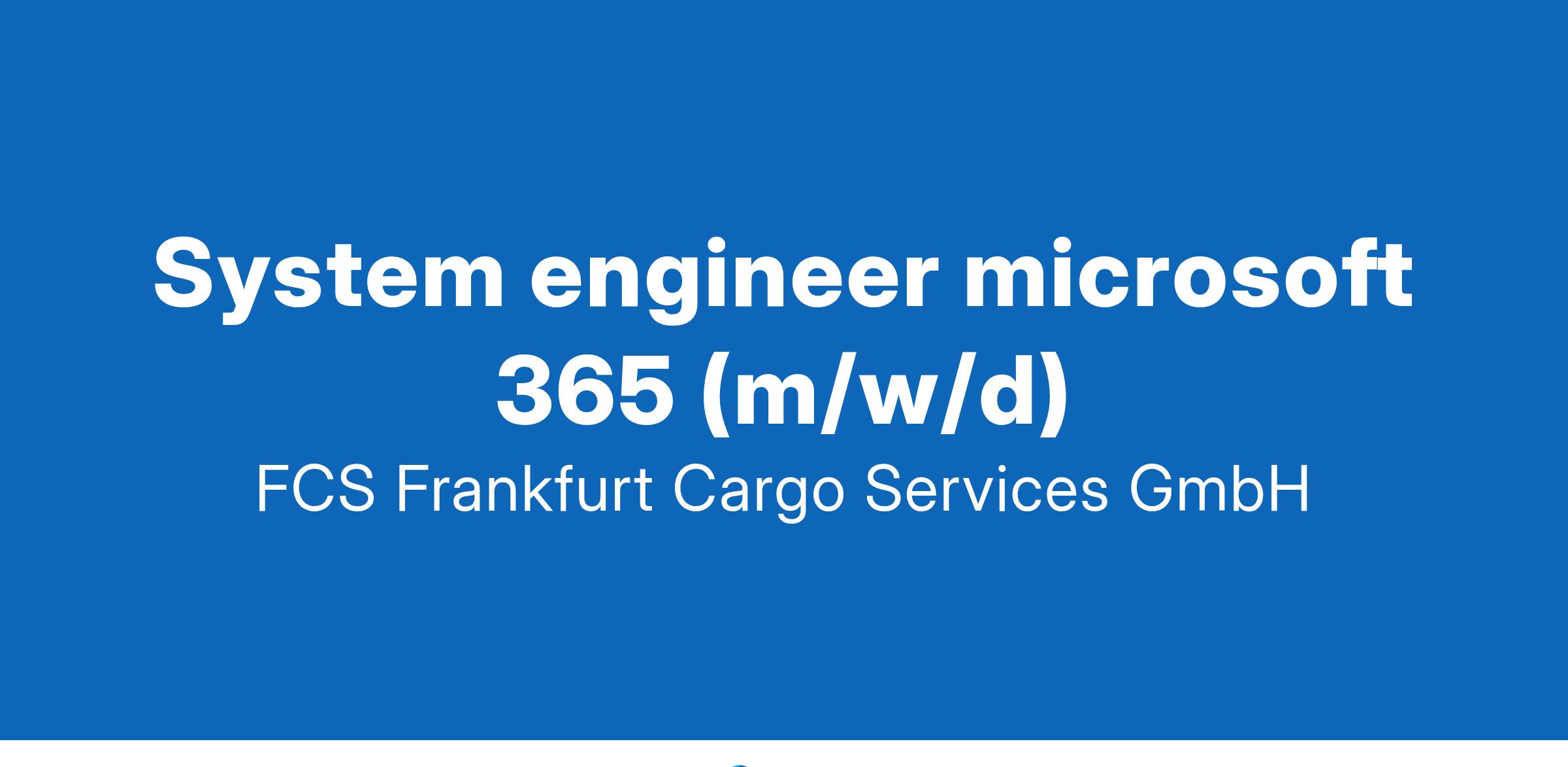 System Engineer Microsoft 365 (m/w/d)[](Die FCS Frankfurt Cargo Services ist der größte unabhängige Abfertiger von Luftfracht am Frankfurter Flughafen. Mehr als 700 Mitarbeiterinnen und Mitarbeiter fertigen hier für über 50 internationale Airlines mehr als 750.000 Tonnen Frachtgüter im Jahr ab. Als Tochterunternehmen der WFS Worldwide Flight Services und Teil der SATS Group zählt die FCS mit zu einer der größten Aircargo-Abfertigungsgruppen weltweit. Weitere Anteile hält die Fraport AG, Eigentümer und Betreiber des Frankfurter Flughafens, einem der größten Flughäfen und Luftfrachtstandorte in Europa.Am Puls der Weltwirtschaft profitiert die Logistik-Branche in besonderem Maße von der wachsenden Globalisierung. Die FCS Frankfurt Cargo Services Gmb H gilt seit über 50 Jahren als eine der ersten Adressen, wenn es darum geht, Luftfracht am Frankfurter Flughafen abzufertigen. Das Vertrauen unserer Kunden rechtfertigen wir täglich aufs Neue durch Zuverlässigkeit, Schnelligkeit, Sicherheit und Qualität. Die Triebfeder unseres Erfolgs sind gut ausgebildete Mitarbeiterinnen und Mitarbeiter.Zur Verstärkung unseres Teams suchen wir zum nächstmöglichen Zeitpunkt in Vollzeit einenSystem Engineer Microsoft 365 (m/w/d)Ihre AufgabenMitarbeit in IT-ProjektenSchnittstellenfunktion für die Fachbereiche bei Projekten mit IT-BezugDokumentation von ProzessenInstallation, Konfiguration, Überwachung und Administration der IT-KomponentenAnalyse, Bearbeitung und Dokumentation von Incidents und Service RequestsAnwenderbetreuung bei Hard- und SoftwareproblemenÜbernahme IT-Support im Rahmen der RufbereitschaftIdealerweise erste Berufserfahrung als O365 Administrator
