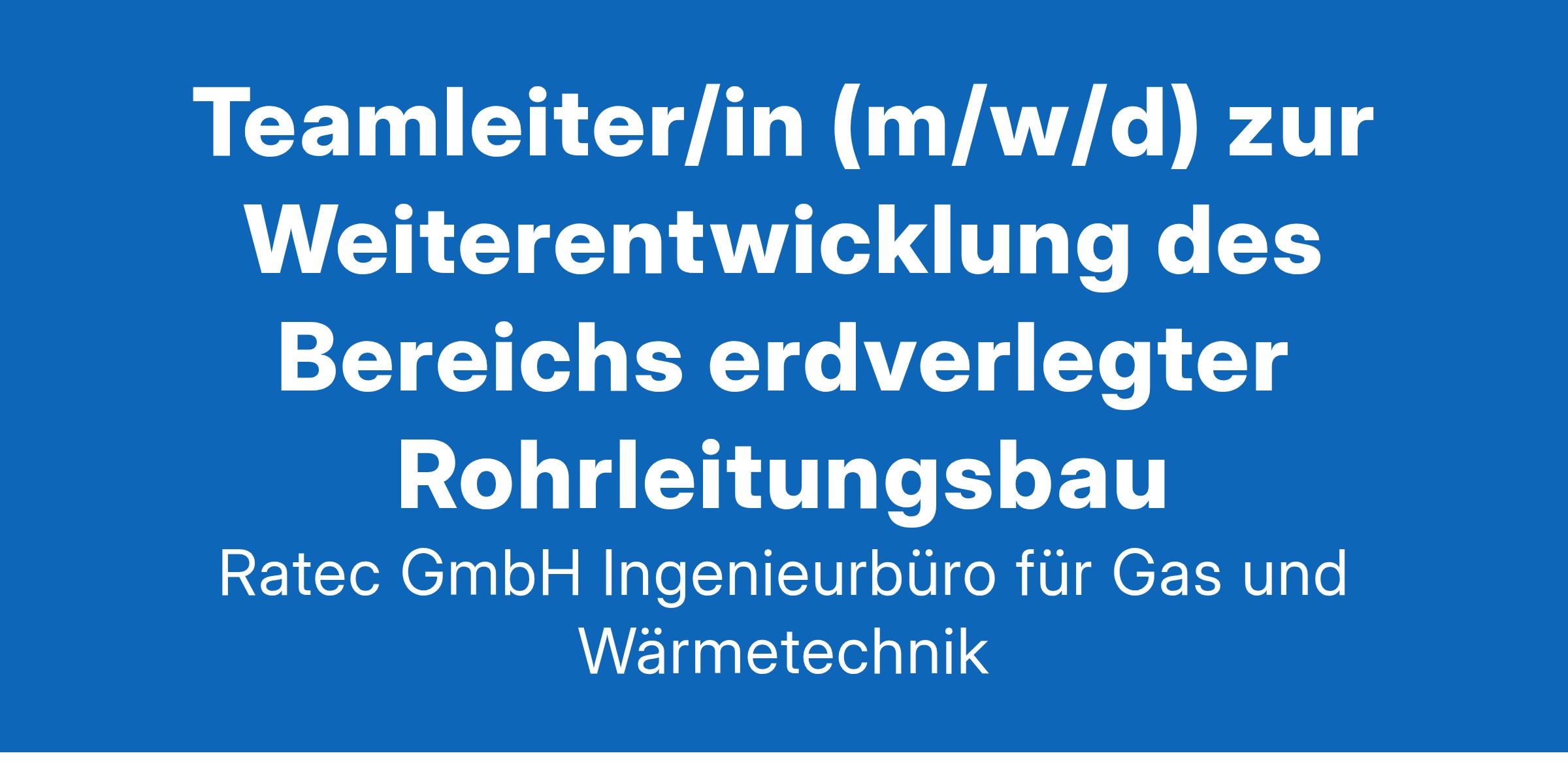 Gestalten Sie mit uns die Zukunft der Energieversorgung – Wasserstoff, Biogas und Wärmenetze sind unsere Themen! Als überregional tätiges Ingenieurbüro sind wir seit mehr als 20 Jahren zuverlässiger Partner der Energieversorger mit den Schwerpunkten Gas und Wärme. Zu unseren Kunden zählen Energieversorger sowie energieintensive Industrieunternehmen. Neben der klassischen Gas- und Wärmeversorgung begleiten wir unsere Kunden in die Energiewende mit innovativen Projekten rund um die Themen Wasserstoff, Biogas, Nah- und Fernwärme. Zur Verstärkung unseres Teams suchen wir: Teamleiter/in (m/w/d) zur Weiterentwicklung des Bereichs erdverlegter Rohrleitungsbau Weitere Informationen zu den einzelnen Stellenanzeigen erhalten Sie auf unserer Website www.ratec-ing.de unter dem Stichwort „Karriere“. Ihre aussagekräftige Bewerbung mit Gehaltsvorstellung richten Sie gerne auch per E-Mail an b.klein@ratec-ing.de RATEC GmbH Ingenieurbüro für Gas- und Wärmetechnik www.ratec-ing.de Nell-Breuning-Allee 6 66115 Saarbrücken