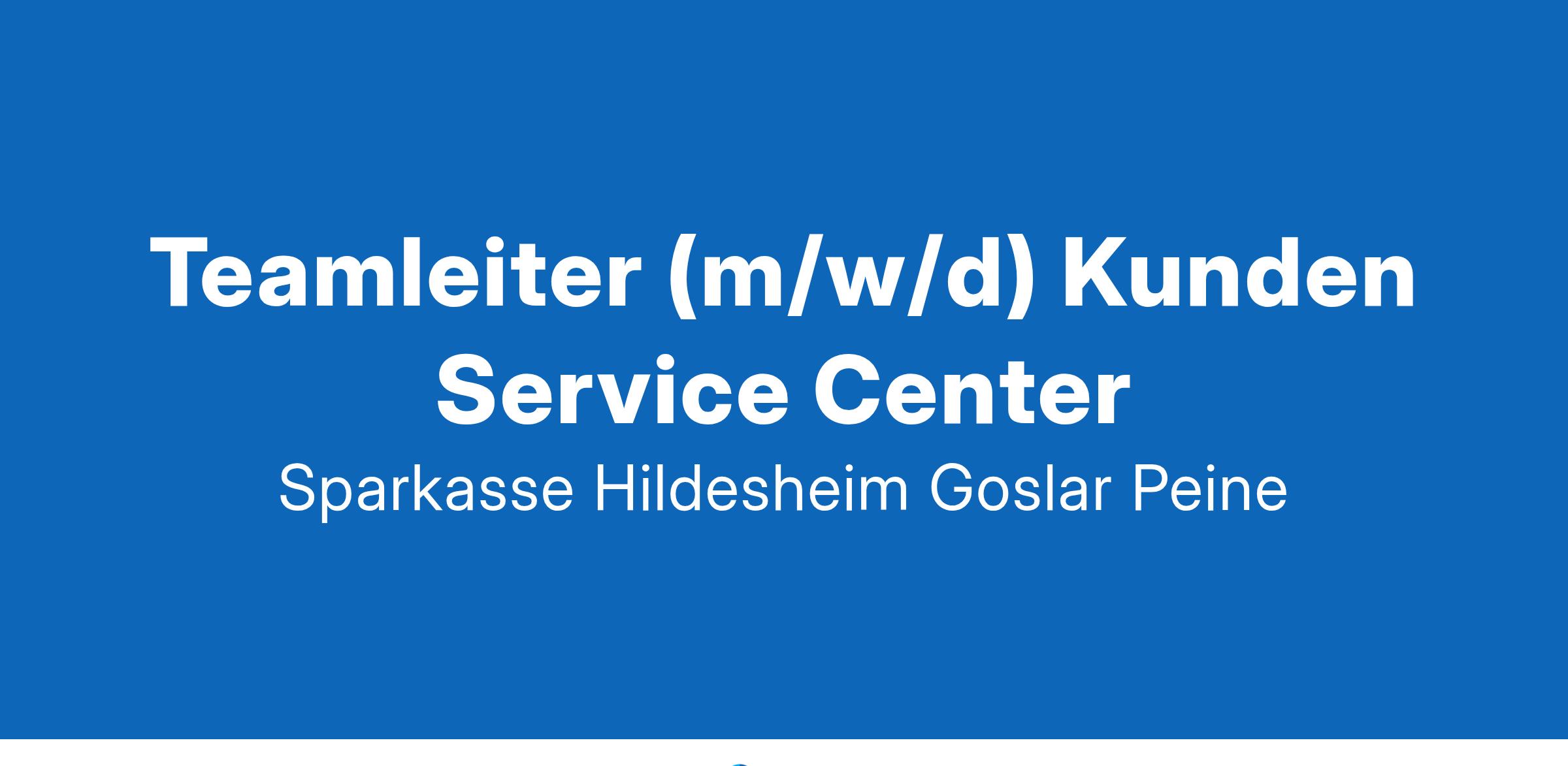Sparkasse Hildesheim Goslar PeineTeamleiter (m/w/d) Kunden Service CenterSparkasse Hildesheim Goslar PeineDie Sparkasse Hildesheim Goslar Peine ist mehr als nur eine Bank - wir stehen für Verlässlichkeit, agieren sozial verantwortungsbewusst und setzen uns aktiv für unsere Heimatregion ein. Mit einer guten Mischung aus Tradition und Innovation zeigen wir Verständnis und Nähe vor Ort und begleiten unsere Kundinnen und Kunden durch alle Lebensphasen. Wir möchten sie begeistern und dabei helfen, individuelle Ziele zu verwirklichen.Als zukunftsorientierte Arbeitgeberin fördern wir unsere Mitarbeitenden gern in ihrer Weiterentwicklung. Wir bieten ein angenehmes Arbeitsumfeld mit der Möglichkeit des mobilen Arbeitens und familienfreundlichen Gestaltungsmöglichkeiten deiner Work-Life-Balance. Zusammenarbeit, Wertschätzung, Unterstützung und Erfolg werden bei uns großgeschrieben. Werde Teil unseres Teams!