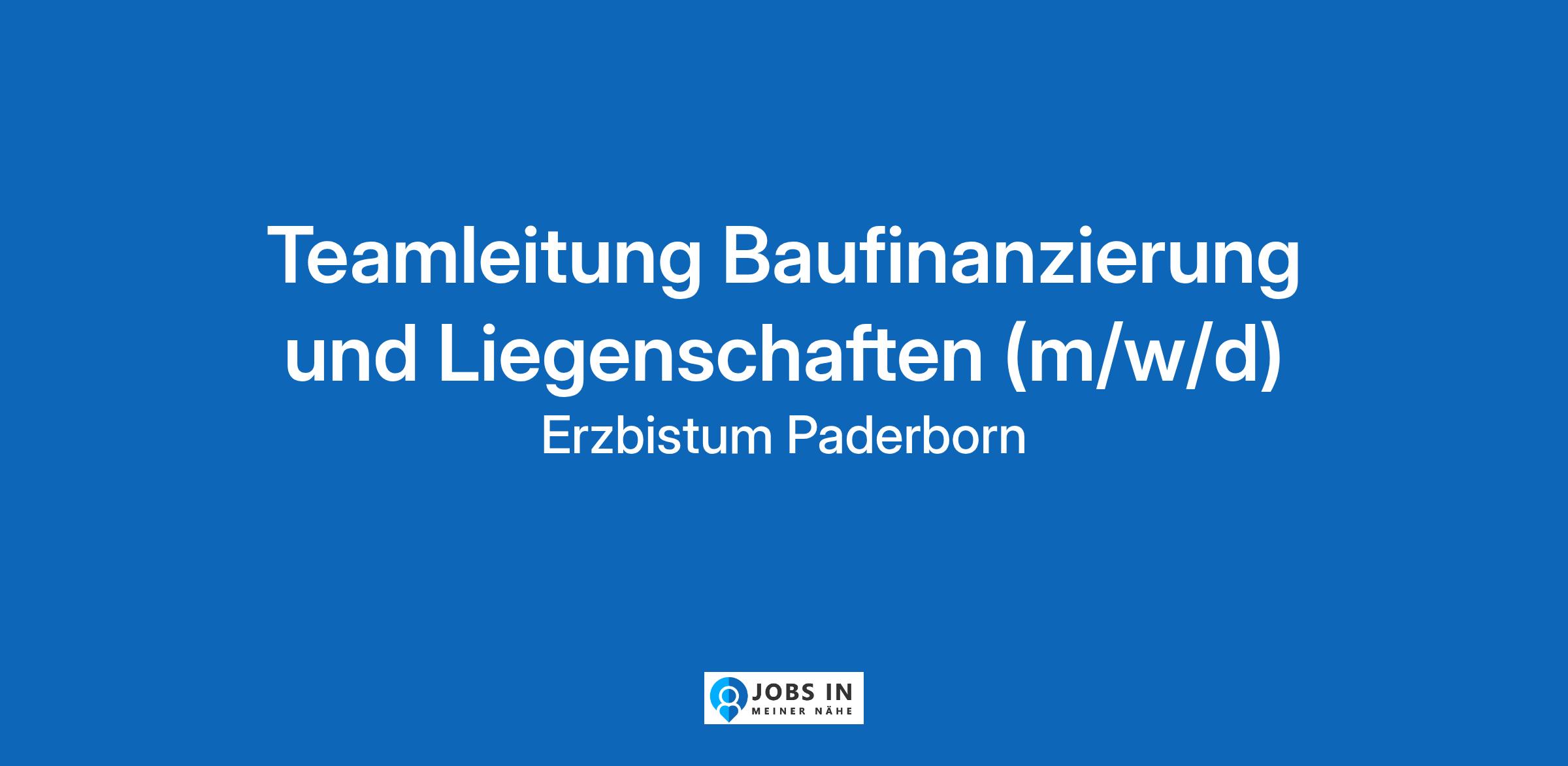 Das Erzbistum Paderborn sucht für den Bereich Finanzen im Erzbischöflichen Generalvikariat eine Leitung für das Team Baufinanzierung und Liegenschaften (m/w/d) . Die unbefristete Anstellung streben wir zum 01.03.2026 mit einer wöchentlichen Arbeitszeit von 39 Stunden an. Die Tätigkeit kann ebenfalls in Teilzeit ausgeübt werden. Bitte geben Sie in Ihrer Bewerbung den gewünschten Stundenumfang an. Die Stelle ist bewertet nach EG 12 KAVO. Das Erzbischöfliche Generalvikariat nimmt zentrale Aufgaben der Verwaltung des Erzbistums Paderborn wahr. Zugeordnet zum Bereich Finanzen übernimmt das Team Baufinanzierung und Liegenschaften die Steuerung und Begleitung von bistumseigenen Baumaßnahmen sowie die Grundstücks-, Miet- und Immobilienverwaltung bistumseigener Liegenschaften und Einrichtungen.
