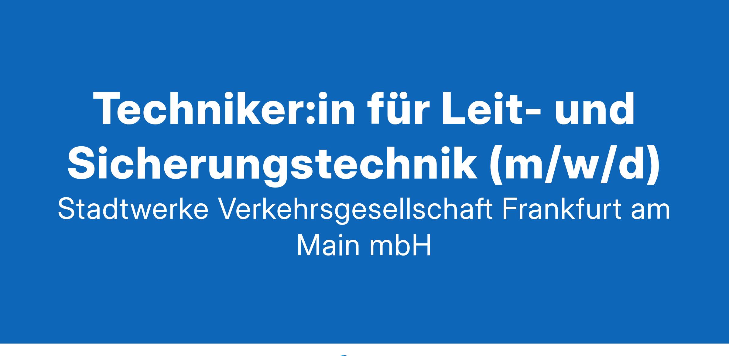 Techniker:in für Leit- und Sicherungstechnik (m/w/d) WIR BEWEGEN MENSCHEN Als Verkehrsdienstleisterin arbeiten wir an der Zukunft Frankfurts – als Arbeitgeberin kümmern wir uns mit Ihnen um Ihre Zukunft. Darum leben wir in unserem Unternehmen Offenheit, Toleranz und Gleichberechtigung und unterstützen Sie mit vielfältigen Benefits. Wir glauben: Der Nahverkehr ist die Zukunft der Mobilität. Deswegen entwickeln wir mit Leidenschaft neue Ideen und Konzepte. Arbeiten Sie mit uns an der Mobilität Frankfurts! IHRE AUFGABEN