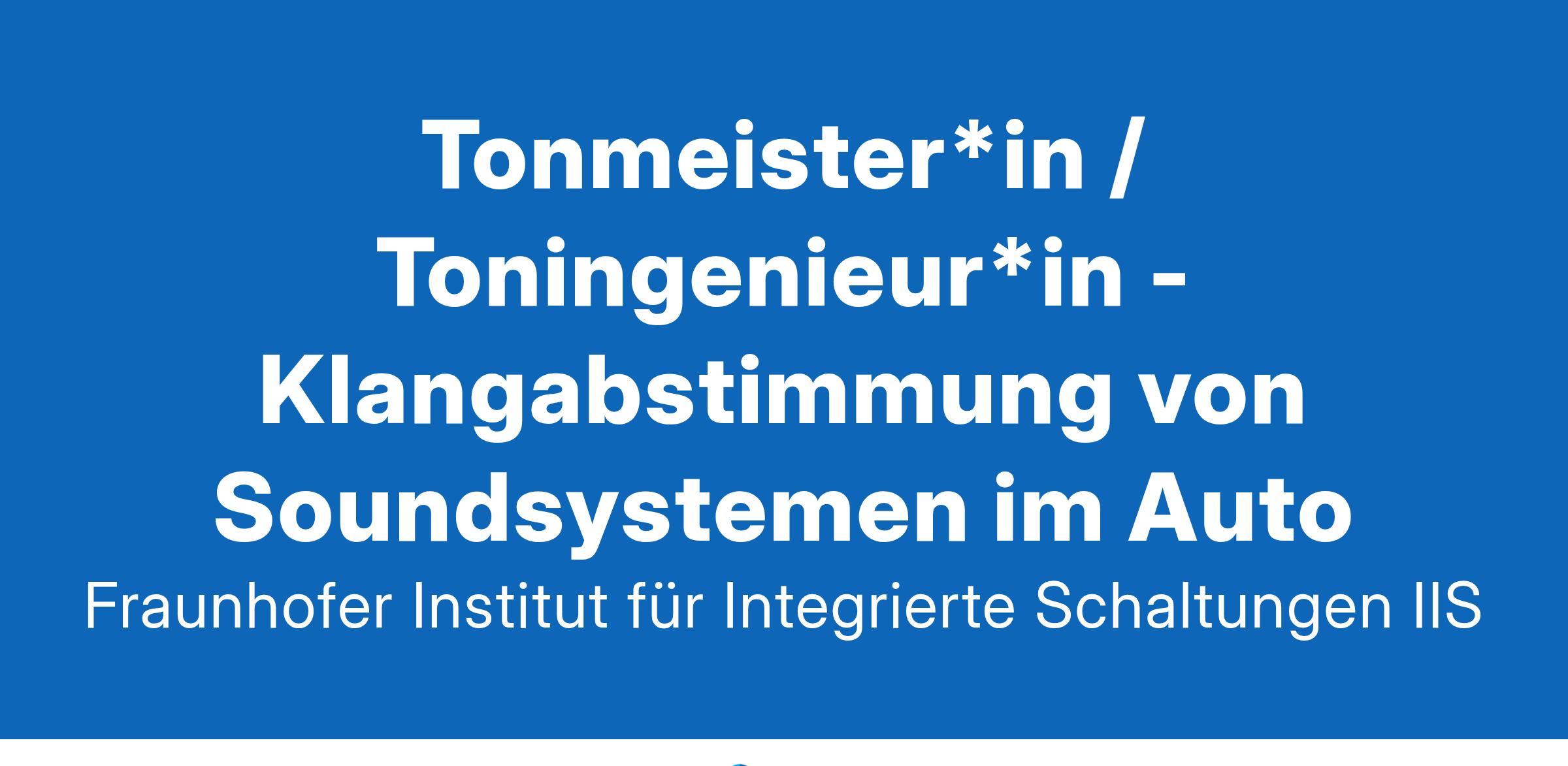 Ort: Erlangen | HybridTonmeister*in / Toningenieur*in - Klangabstimmung von Soundsystemen im AutoDie Fraunhofer-Gesellschaft ( www.fraunhofer.de ) betreibt in Deutschland derzeit 76 Institute und Forschungseinrichtungen und ist eine der führenden Organisationen für anwendungsorientierte Forschung. Rund 32 000 Mitarbeitende erarbeiten das jährliche Forschungsvolumen von 3,4 Milliarden Euro.Der Bereich »Audio und Medientechnologien« des Fraunhofer-Instituts für Integrierte Schaltungen IIS in Erlangen prägt seit über 30 Jahren die weltweit eingesetzten Standards und Technologien in der Audio- und Filmindustrie. Angefangen bei der Erfindung von mp3 sowie der Mitentwicklung von Advanced Audio Coding (AAC) und dem Testplan der Digital Cinema Initiative (DCI) finden sich heute Systeme und Technologien aus Erlangen in fast allen Geräten der Unterhaltungselektronik. Eine neue Generation erstklassiger Medientechnologien setzt mittlerweile neue Maßstäbe. Immer mit Blick auf die Anforderungen des Markts entwickelt das Team des Fraunhofer IIS Technologien, die unvergessliche Momente ermöglichen.