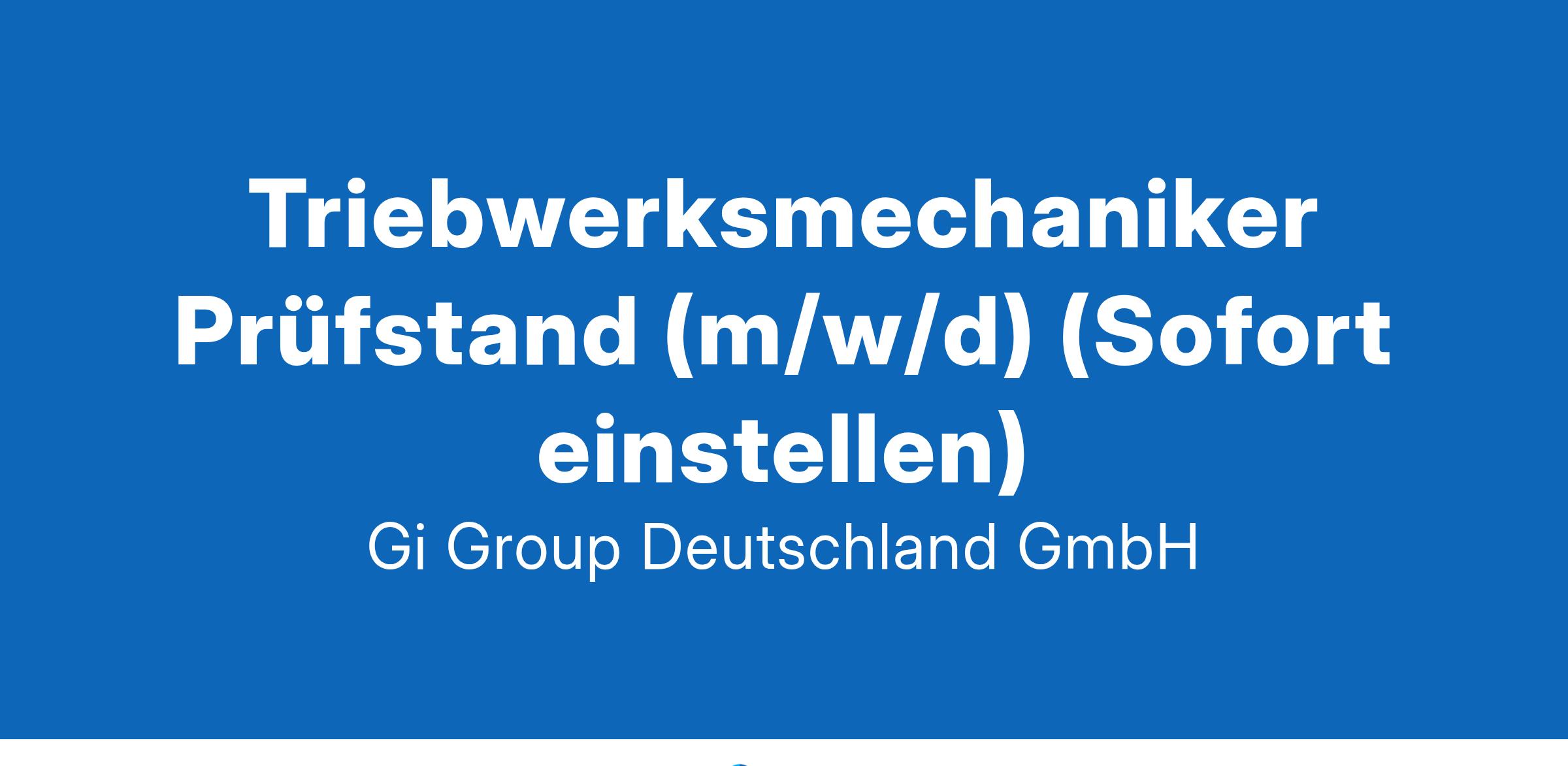 Facharbeiter Prüfstand (gn) Triebwerksbereich ab sofort in Vollzeit in Frankfurt am Main in Direktvermittlung Die Gi Group ist ein international agierender Personaldienstleister mit mehr als 500 Standorten in 40 Ländern. Unser Kunde ist ein renommiertes und zukunftsorientiertes Unternehmen aus der Luftfahrt.  Deine Aufgaben Aufrüsten und Abrüsten von verschiedenen Triebwerkmustern für das Durchführen von Prüfläufen  Vorbereitung von Triebwerksprüfläufen  Durchführung von Triebwerksprüfläufen  Fehleranalyse und Behebung  Wartungsarbeiten am Triebwerk  Wartungsarbeiten am Prüfstandequipment  Dein Profil als Facharbeiter Prüfstand Eine abgeschlossene Berufsausbildung in einem metallverarbeitenden Bereich, z.B. KFZ-Mechaniker, Anlagenmechaniker, Industriemechaniker zzgl. Bereitschaft zum Erwerb der Qualifikation zum Engine Mechanic Gerne alternativ ein abgeschlossene Berufsausbildung in einem luftfahrttechnischen Bereich, z.B. Fluggerätmechaniker Fachrichtung Triebwerkstechnik  Fortgeschrittene Englischkenntnisse Bereitschaft zum Schichtdienst (verschiedene Schichtmodelle mit Zulagen) Bereitschaft zu mehrtägigen Dienstreisen bzw. Auslandseinsätzen Das bietet der Kunde Urlaubs- und Weihnachtsgeld sowie eine Gewinnbeteiligung, 30 Tage Urlaub  Flugvergünstigungen, Einkaufsrabatte in Geschäften und Jobrad-Leasing  Kostenloses Parken, betriebliche Altersvorsorge und Verpflegungszuschuss für die Kantine  Fitness- und Sportangebote, Jobticket/Zuschuss ÖPNV Und vieles mehr  Deine Bewerbung Für Deine Bewerbung als Facharbeiter Prüfstand Triebwerksbereich klicke bitte einfach auf „Jetzt bewerben“. Dort kannst Du Deine Kontaktdaten eingeben sowie Deinen Lebenslauf und Deine Bewerbungsunterlagen hochladen. Du benötigst dafür nur ca. 1 Minute. Dein zuständiger Personaldisponent wird sich bei Dir schnellstmöglich melden. Gerne kannst Du uns auch Deine Bewerbungsunterlagen per E-Mail zusenden. Wir freuen uns auf Deine Bewerbung als Facharbeiter Prüfstand! Unsere Stellenangebote richten sich an Arbeitssuchende jeglichen Geschlechts. (gn) = geschlechtsneutral. Kontakt Gi Group Recruiting Team