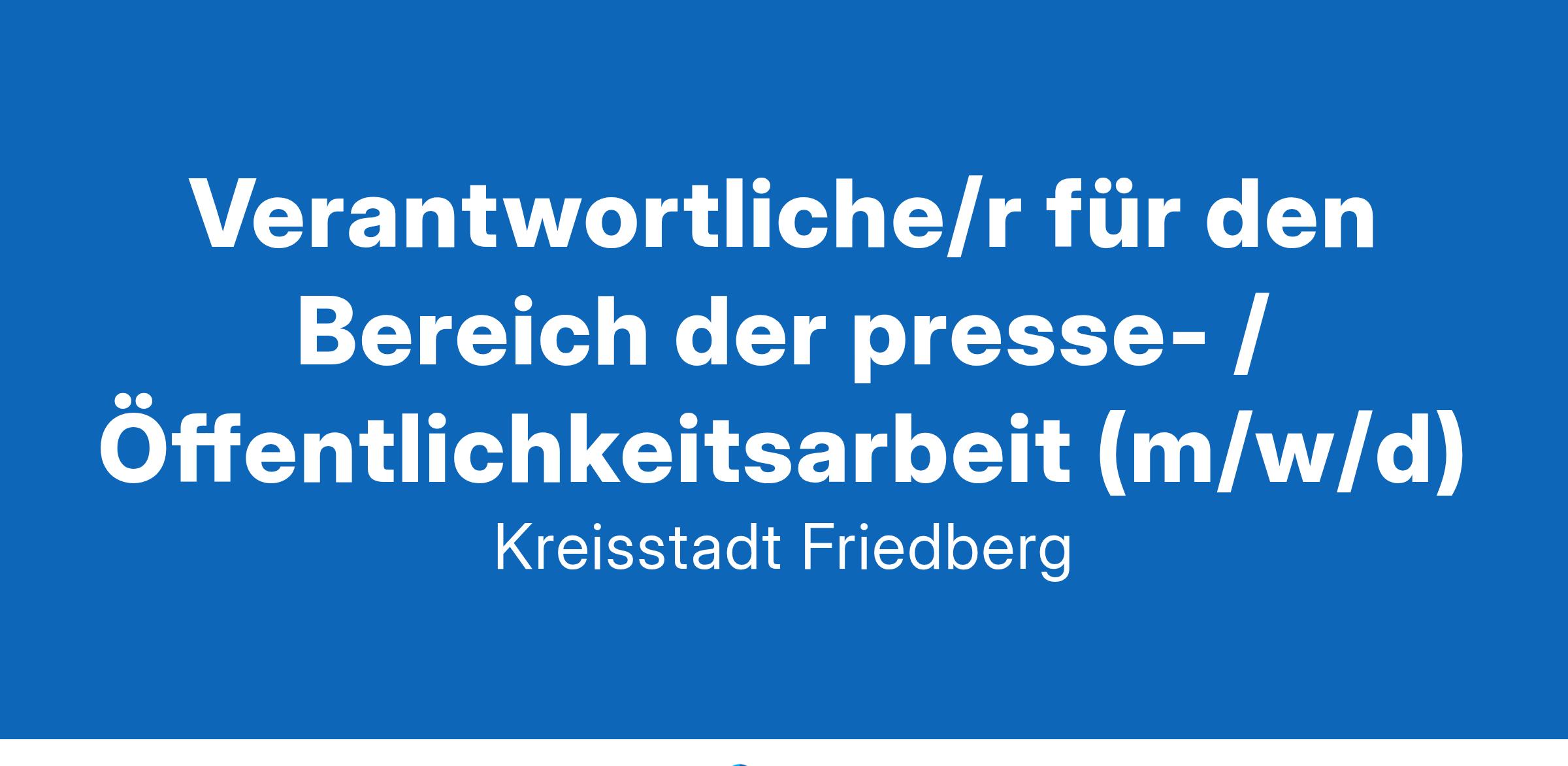 Zur Verstärkung unserer Teams suchen wir: Verantwortliche/r Für den Bereich der presse- & Öffentlichkeitsarbeit (m/w/d) Die komplette Stellenausschreibung finden Sie unter Rathaus und Politik/Stellenangebote auf www.friedberg-hessen.de