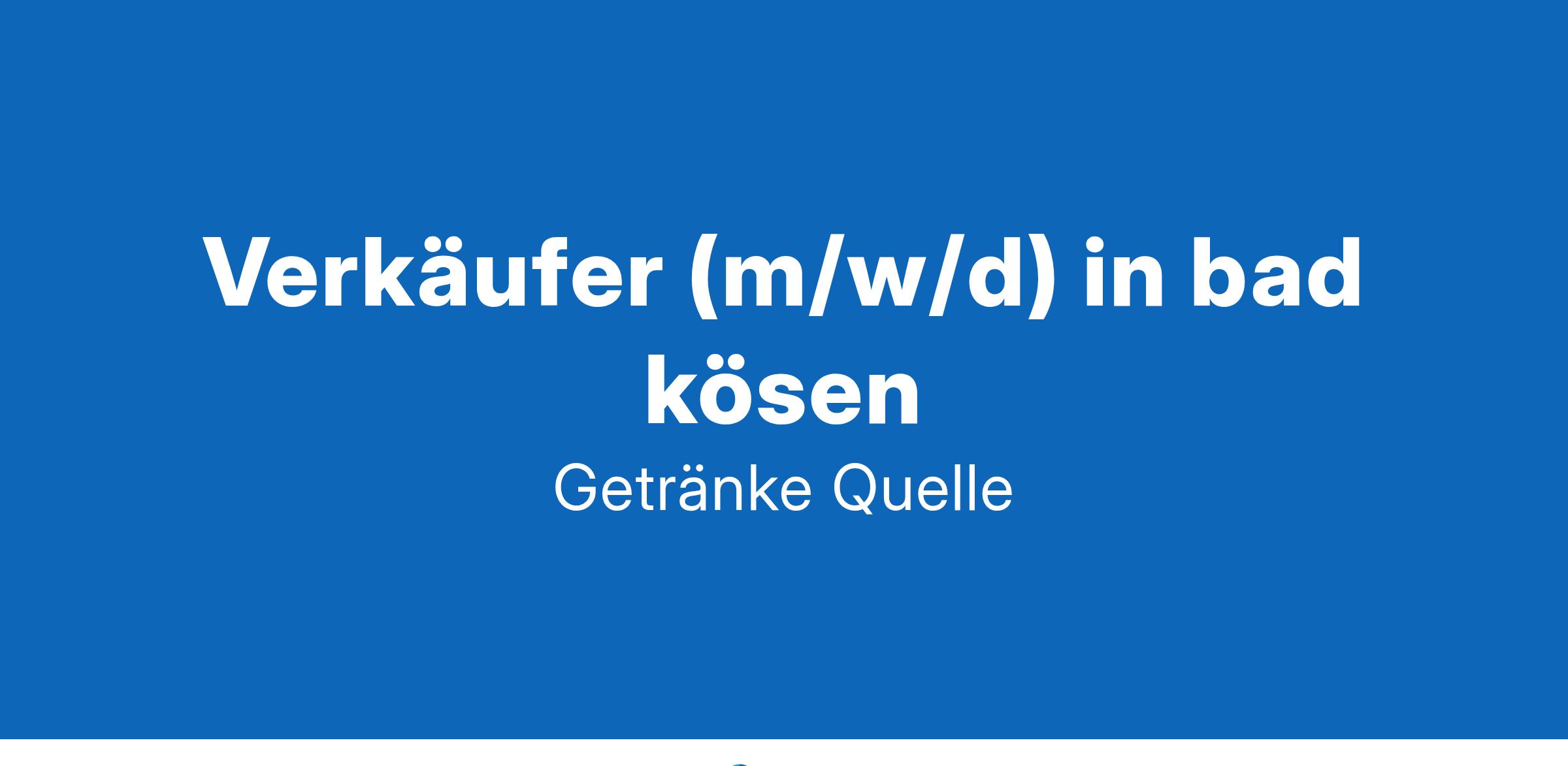 Getränke-Quelle06628 Bad KösensuchtWir stellen zum nächstmöglichen Zeitpunkt Verkäufer (m/w/d) ein. Quereinsteiger sind herzlich willkommen!Was bieten wir?eine verantwortungsvolle Tätigkeitein nettes, kollegiales Arbeitsklimaeinen zukunftsicheren Arbeitsplatz in einem mittelständischen Unternehmeneine pünktliche Bezahlungbetriebliche AltersvorsorgeWeiterbildung durch E-LearningIhr ProfilPositive Einstellung zur DienstleistungDeutsch in Wort und SchriftGepflegtes ErscheinungsbildFreude an der Beratung und Bedienung unserer KundenIhre AufgabenAktiver VerkaufKundenberatungverkaufsfördernde WarenpräsentationWareneingangs- und QualitätskontrolleWare verräumenLeergutannahmeSicherstellen des optischen Erscheinungsbildes der FilialeKassier- und InventurtätigkeitenWenn wir Ihr Interesse geweckt haben, freuen wir uns über Ihre Bewerbung!